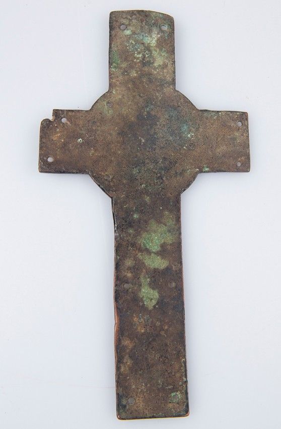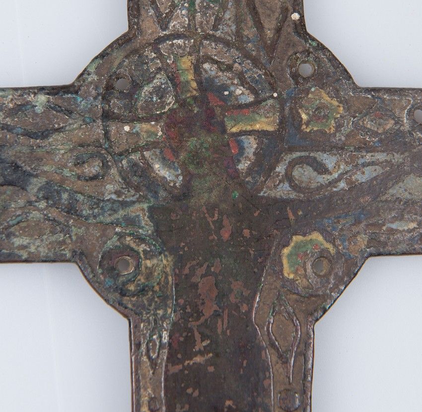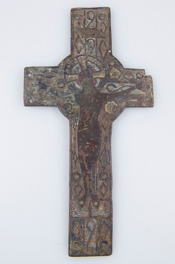 Central plaque of a processional cross in engraved copper with traces of gilding and Limoges champlevé enamel. France. 13th century. The appliqué figure of the body of Christ is missing, appearing only as a silhouette. 22 x 11,5 cm.