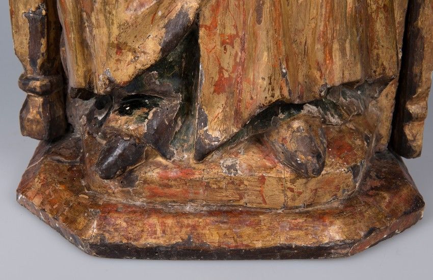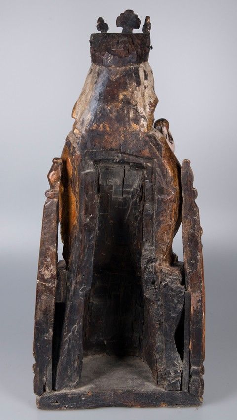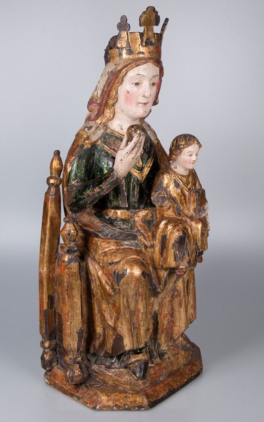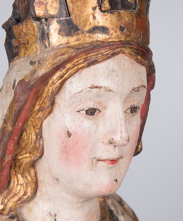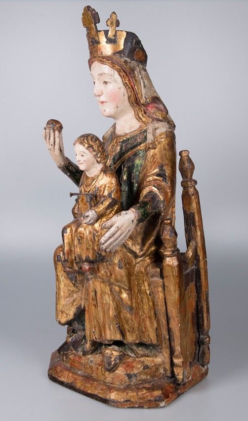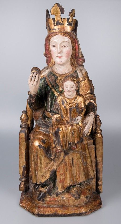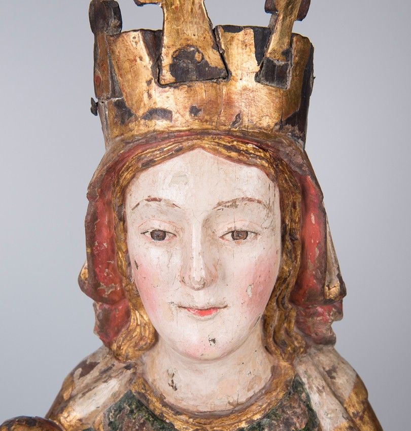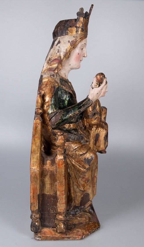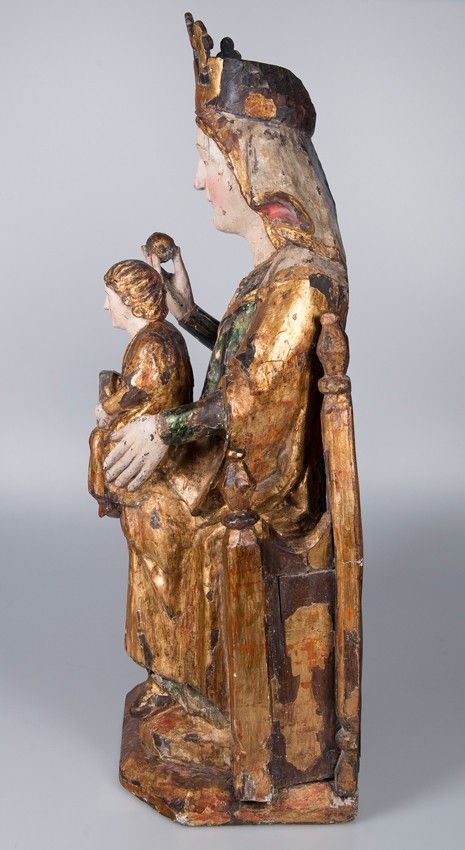 The Virgin Mary is depicted frontally, with the rigidity and hieratic quality characteristic of sculpture of this period, features that give her a majestic and timeless air. She is seated on a low seat without a high back and decorated with simple side moldings. The back is left uncarved except for the head, while the lower part has been hollowed out, creating a large cavity. With her left hand she holds the Child by the hip, while in her right she displays a fruit between her elongated fingers. It is probably a pear or an apple, the latter associated with the symbolism of Mary as the new Eve, with victory over sin and with the offering of the fruit of Salvation. Her face, oval and of great nobility, shows fine features: almond-shaped eyes, curved eyebrows, sharp nose, closed mouth with thin lips forming a slight smile, rosy cheeks, prominent chin and a slight double chin. Her head is framed by a veil that falls over her shoulders and covers almost entirely her blond hair, which is lightly carved in fine, wavy strands. She wears a gilded crown of considerable height thanks to the trilobed shapes embedded in it, which resemble stylized fleurs-de-lis, motifs commonly found in Marian sculpture from the northern regions of the Iberian Peninsula.
