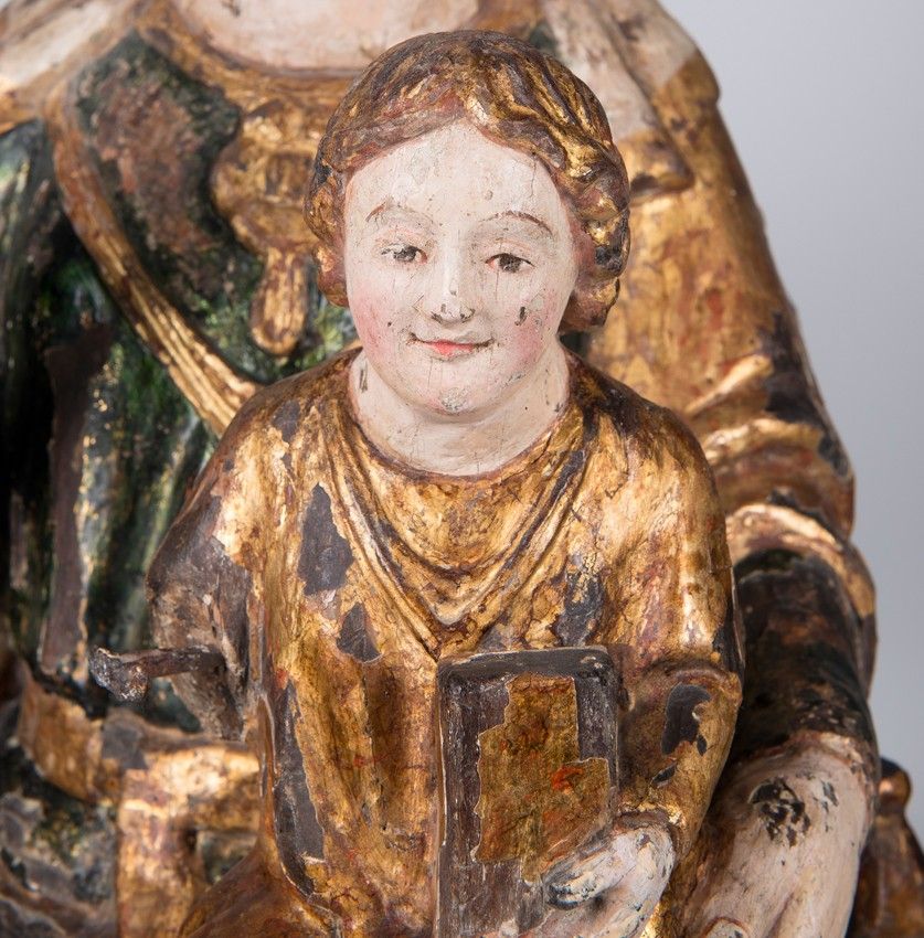 The Child Jesus, resting on her lap, is seated on her left knee, forming one of the most widespread iconographic types and one which, according to Georg Weise, has its origin in the Virgin of the Esclavitud in Vitoria Cathedral, datable to the late thirteenth century. Although he retains the frontality and rigidity typical of these moments, his slight deviation from the central axis introduces a degree of dynamism and breaks complete symmetry. He wears a long tunic that leaves only the head and extremities uncovered. The loss of the right hand makes it impossible to know the original gesture, although it was almost certainly raised in blessing, though on some occasions he holds the globus cruciger, symbol of his power over the world. In his left hand he holds a closed book, symbol of divine wisdom and of the prophecies fulfilled in Christ. His facial features replicate those of his mother, although with a slightly more pronounced smile and a rounder face. His blond hair is short and voluminous.