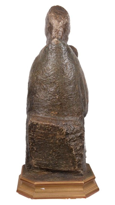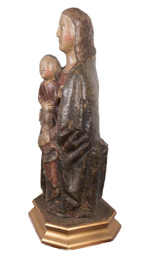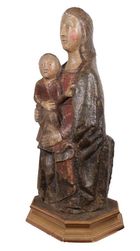 In this case, we are at the beginning of a more naturalistic Gothic style. Mary still retains her throne, on which she is Queen, and her posture is frontal and hieratic, yet she holds her son,