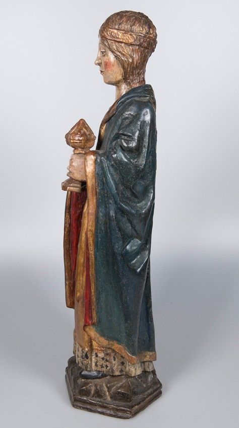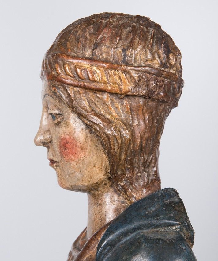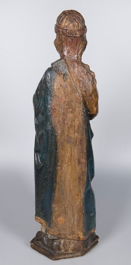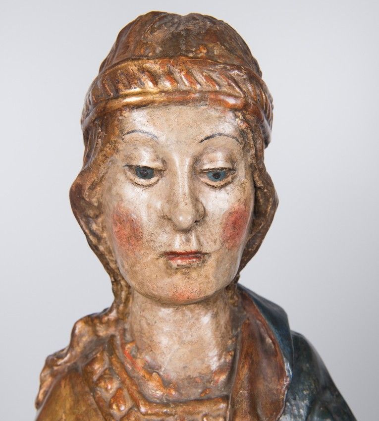 'An original sculpture carved in walnut wood, with remnants of original tempera polychromy (ermine band and flesh tones) and a later, non-original, overall oil repaint.
