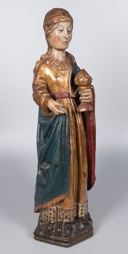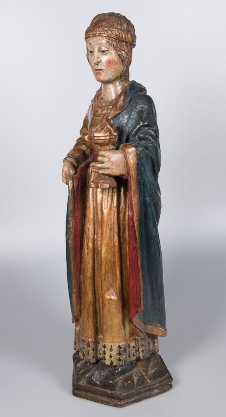 It represents St Mary Magdalene dressed in rich garments, wearing a diadem in her hair, and holding the ointment jar (a usual iconographic attribute).