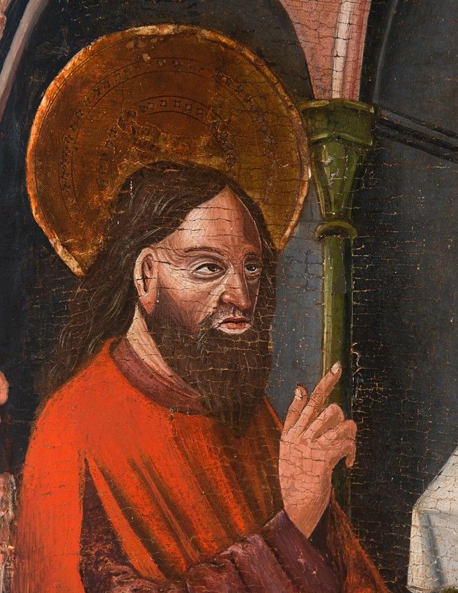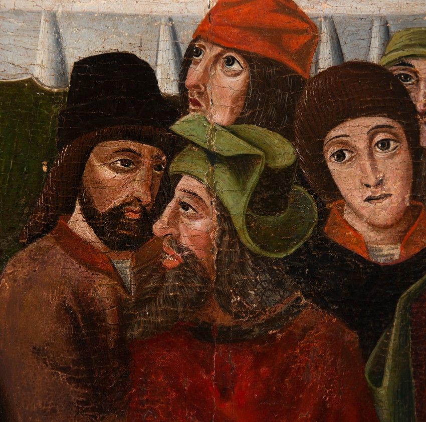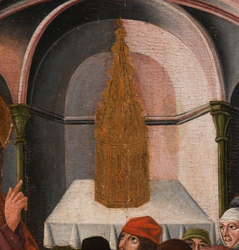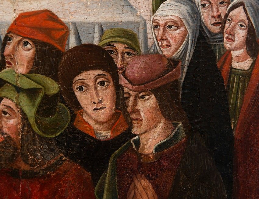 It is very reminiscent of a panel by Pedro Serra (Barcelona 1345-Barcelona 1405) from the second half of the 14th century, acquired in 1959 by the Bilbao Museum and which we can now admire in situ, with the same composition and scene, the same tightly packed composition of a listening crowd and the same architectural background of a church.
