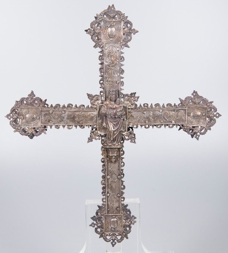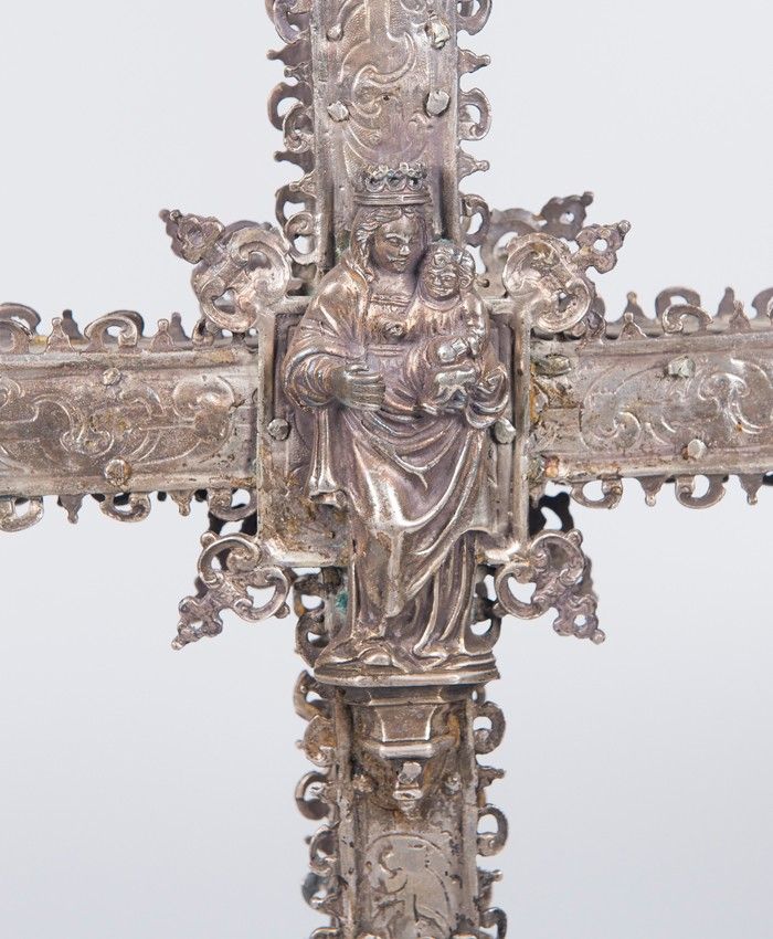 The cross, now lacking its original base, presents on its reverse, in the central quadrant, the figure of the Virgin and Child standing in the round, also stylistically derived from sixteenth-century models.