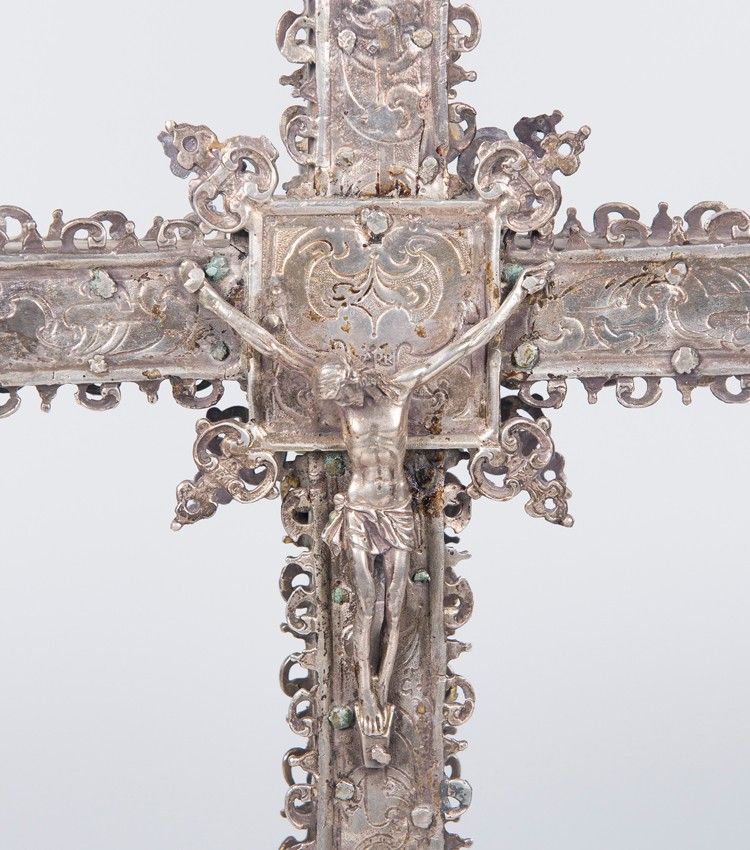 'This is an original altar cross, crafted from a sheet of silver in its natural colour, chased and embossed, mounted on a wooden core, and bearing a cast silver figure of Christ.