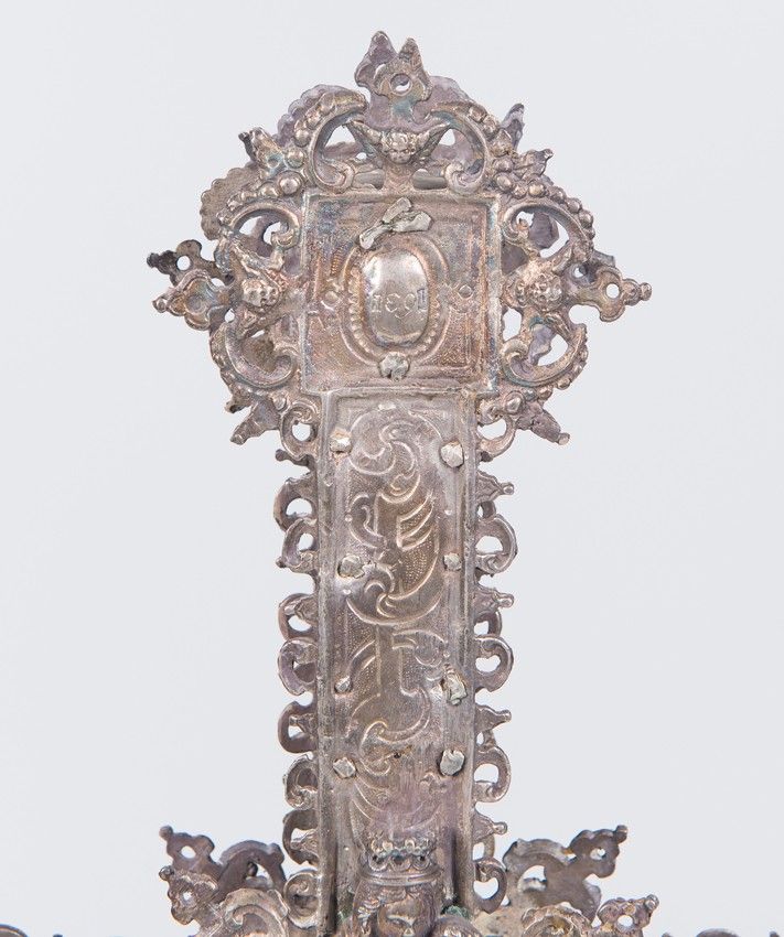 The cross, with equal arms, displays meticulous workmanship. The shafts terminate in square ends featuring cabochon-like medallions in relief, while their surface is adorned with engraved and chased vegetal scroll motifs and small angel heads at the ends of the cross’s arms. A delicate lace-like ornament runs along the entire edge of the cross, stylistically corresponding to the late forms of the Plateresque style, which in metalwork persisted well into the seventeenth century. The models are reiterated, as there is no abrupt shift between two styles, but rather a slow and gradual evolution.