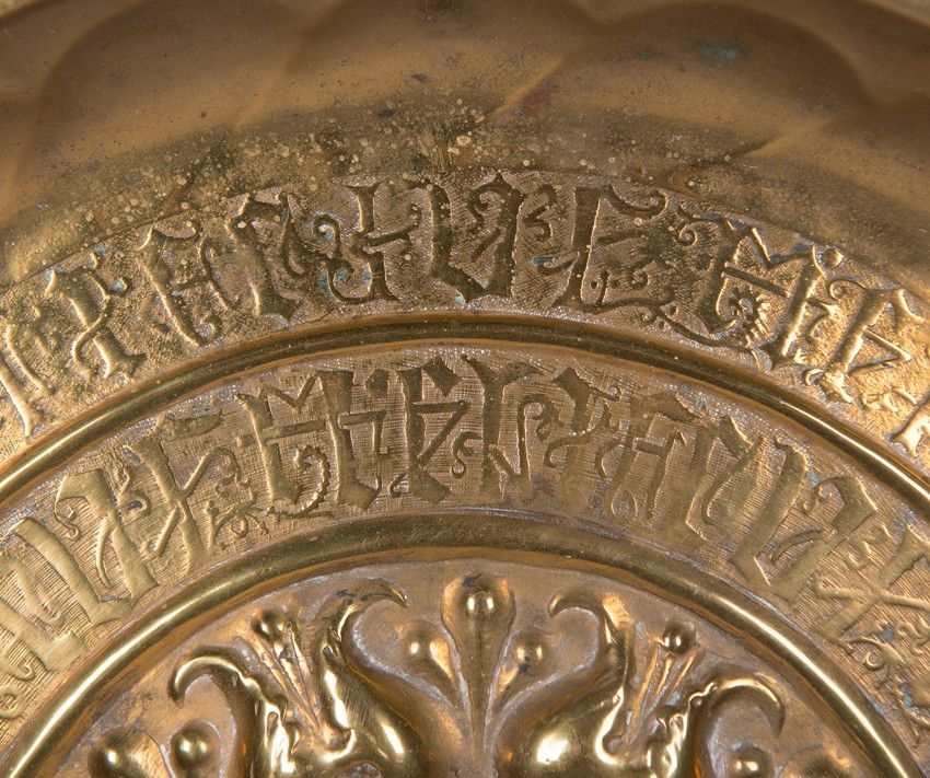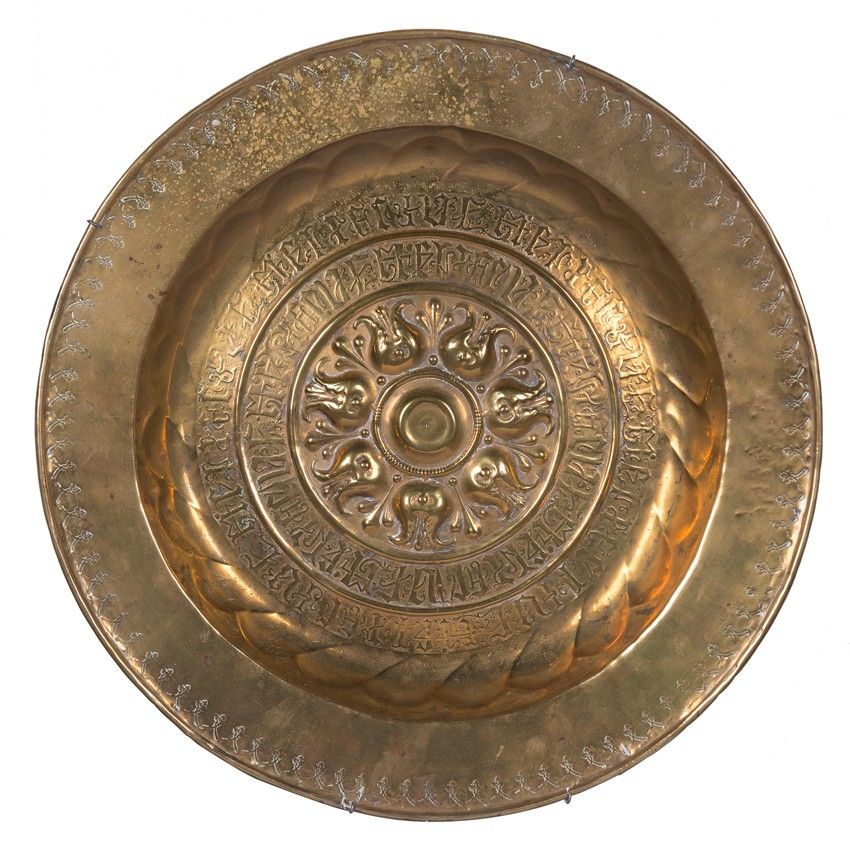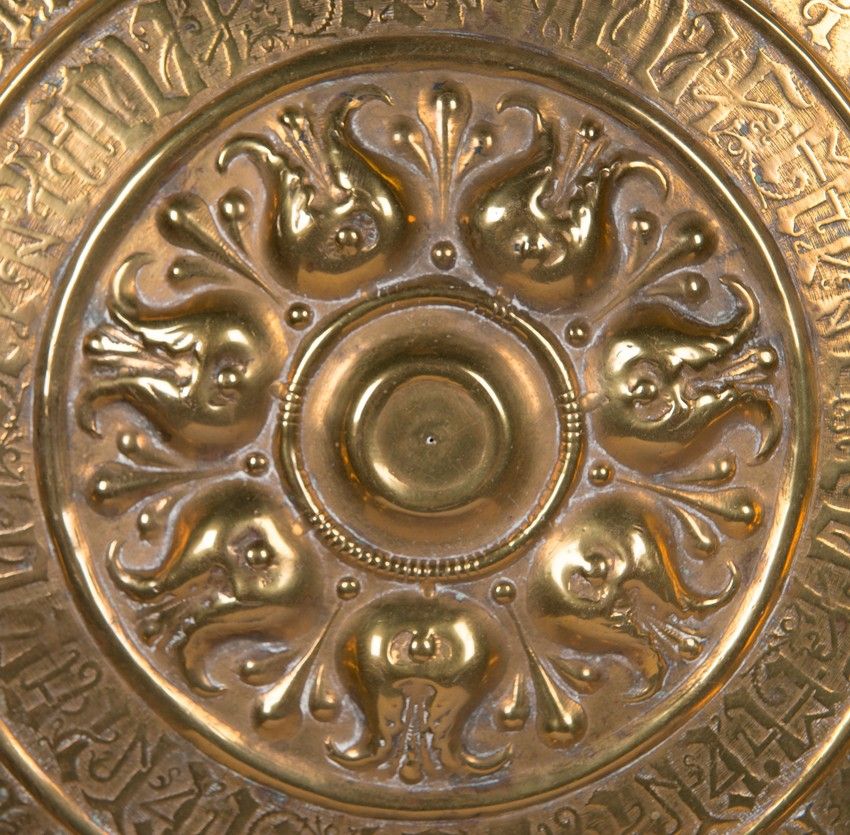 Large alms dish in gilded and embossed brass. Nuremberg. Germany. Circa 1500. Diameter: 49 cm.   Throughout the 15th and 16th centuries, the fashion for these embossed decorative plates spread throughout Europe. They were manufactured in Germany, especially in Nuremberg, where the most beautiful ones were produced, in Central Europe, and also in northern Italy. These plates were not reserved exclusively for worship, but could also be used as light reflectors or decorative elements. This beautiful offering plate corresponds perfectly to the productions of the Nuremberg workshops.  It features a central dome, called the navel, and is decorated with embossed designs specific to these workshops. Made according to a traditional pattern, its navel is adorned with flowers, its base with beautiful German Gothic letters, and its rim with engraved decorations. Finally, for reasons of strength, the rim is bent over a wire, as was customary in Germany.   Provenance: - Private collection. Barcelona. From mid 20th century.