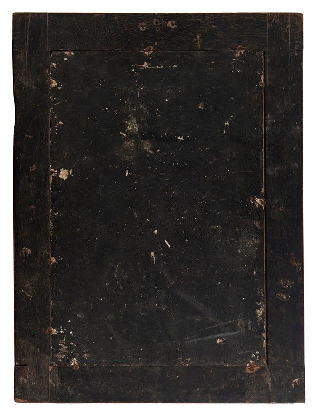 Oil on panel. With gold applications. Accompanied by an important carved, gilded and polychrome wooden frame.