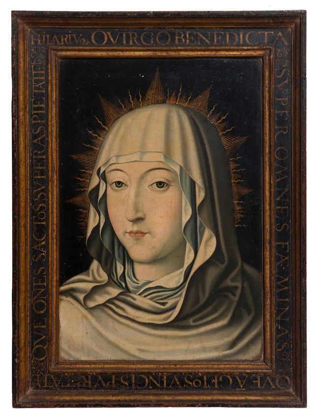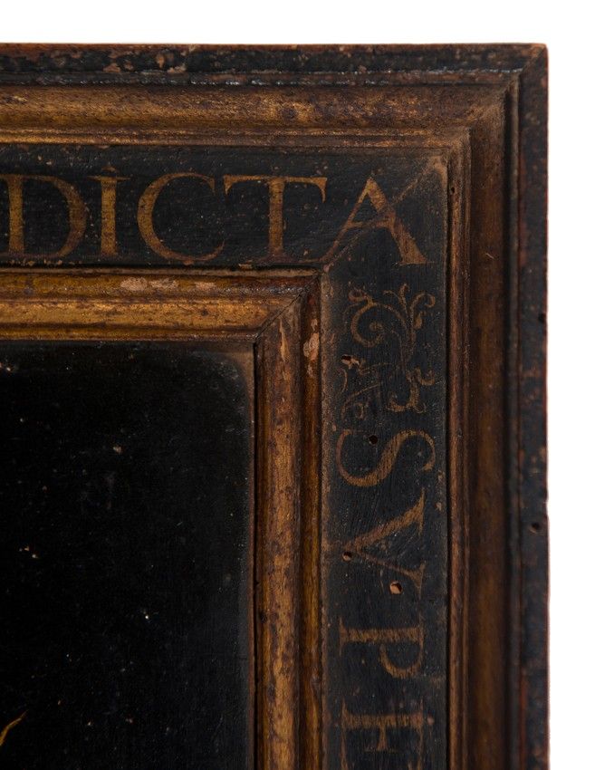 On the perimeter of the frame, we read the following painted text: “O VIRGO BENEDICTA SVPER OMNES FAEMINAS, QVE ANGELOS VINCIS PVRITATE, QVE OMNES SANCTOS SVPERAS PIETATE HILARIVS.” Translated into English: “Oh Blessed Virgin above all women, who surpasses the angels in purity and all the Saints in gracious piety.”