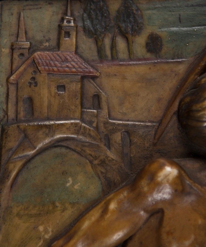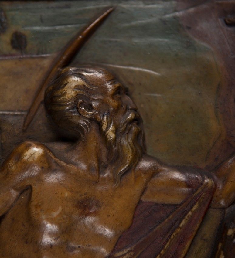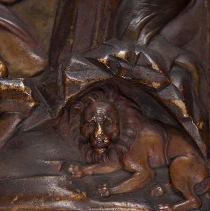 In our opinion, the polychrome is posterior. Originally the relief would have been in natural alabaster, perhaps with some touches of gold, and it would be advisable to remove the current colour.