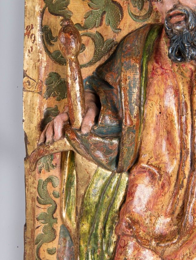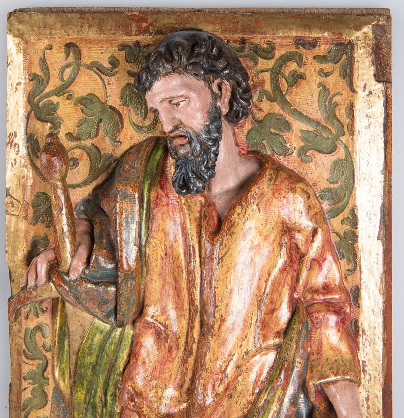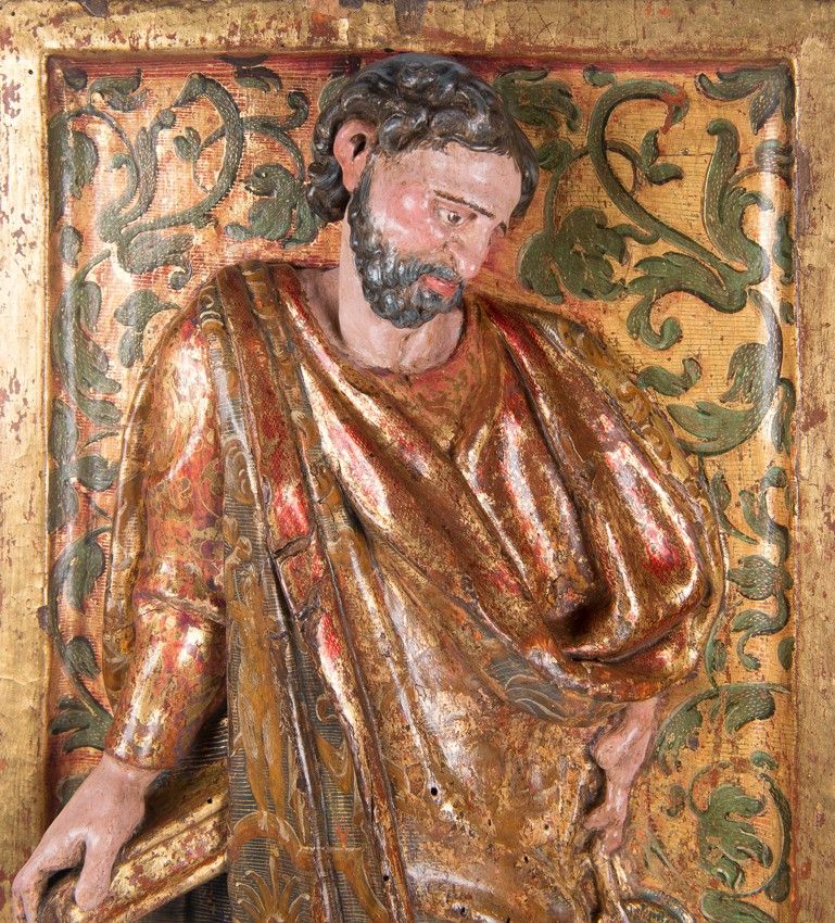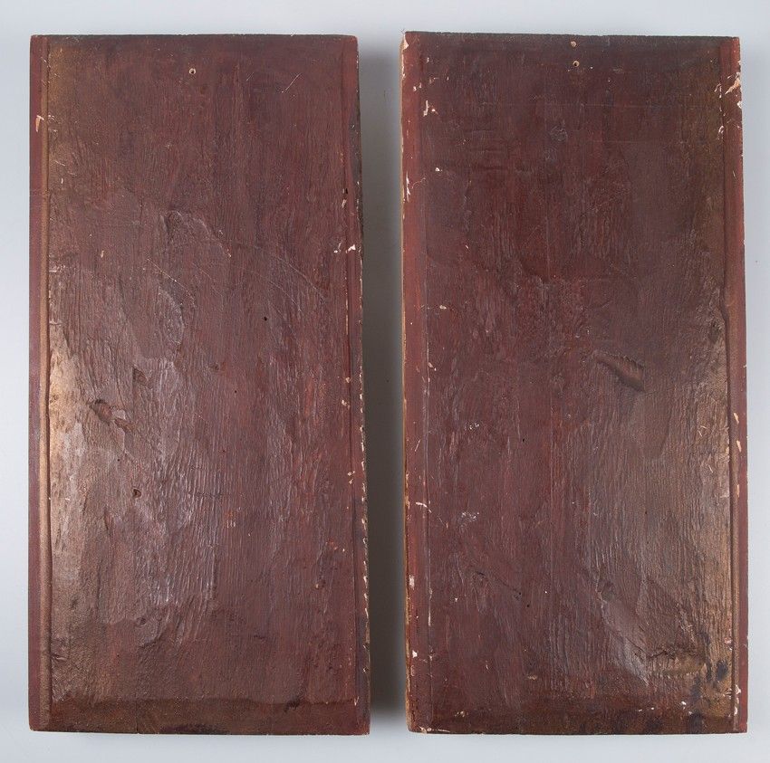 Pair of carved, polychrome, gilded, and gilt-embossed wooden reliefs.