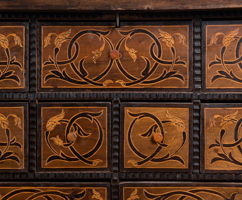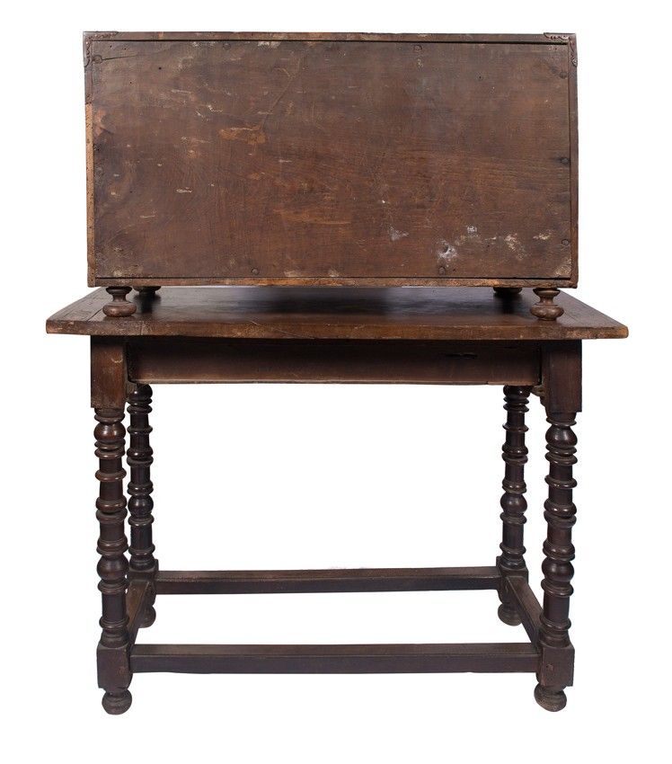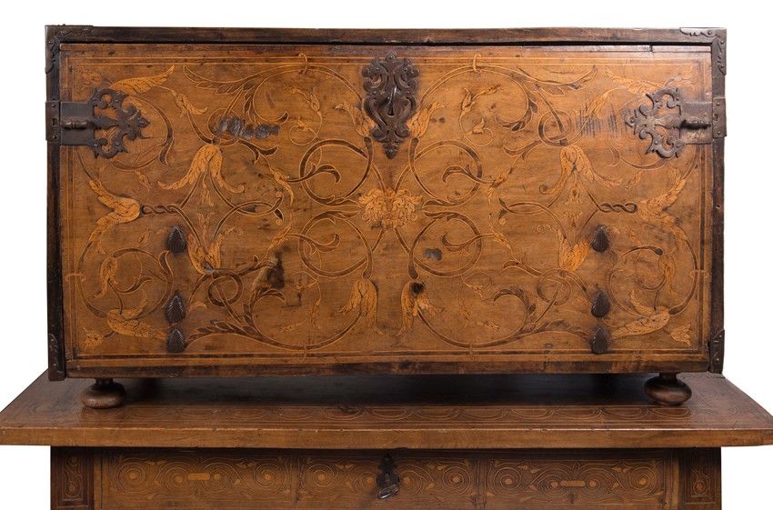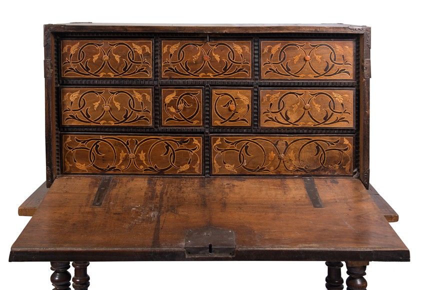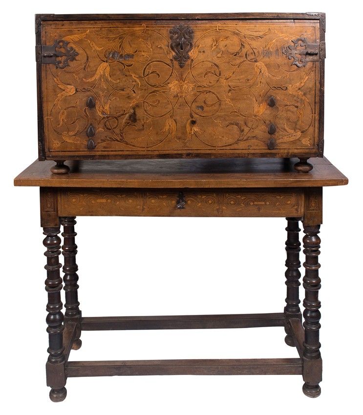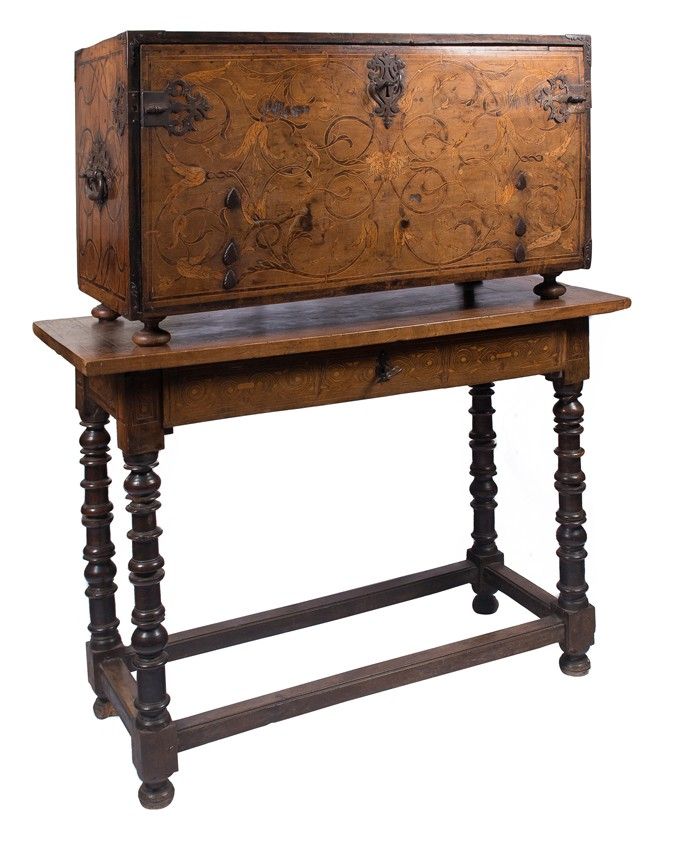 Cabinet with its original table in walnut wood with inlay of contrasting woods and iron fittings. Aragonese workshop. 17th century.