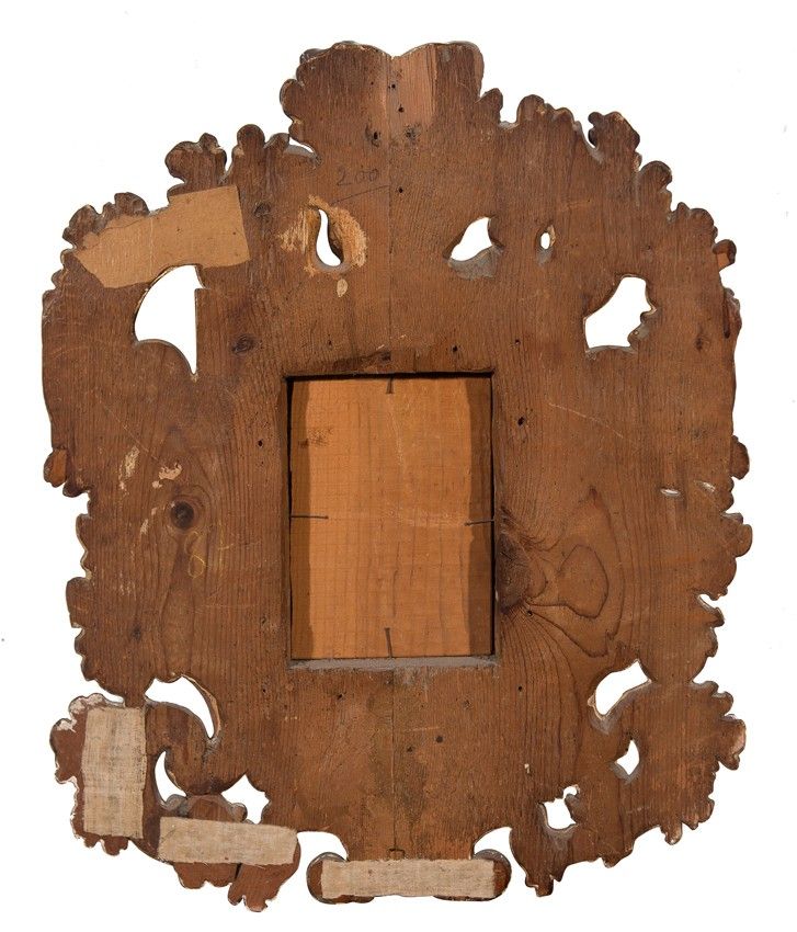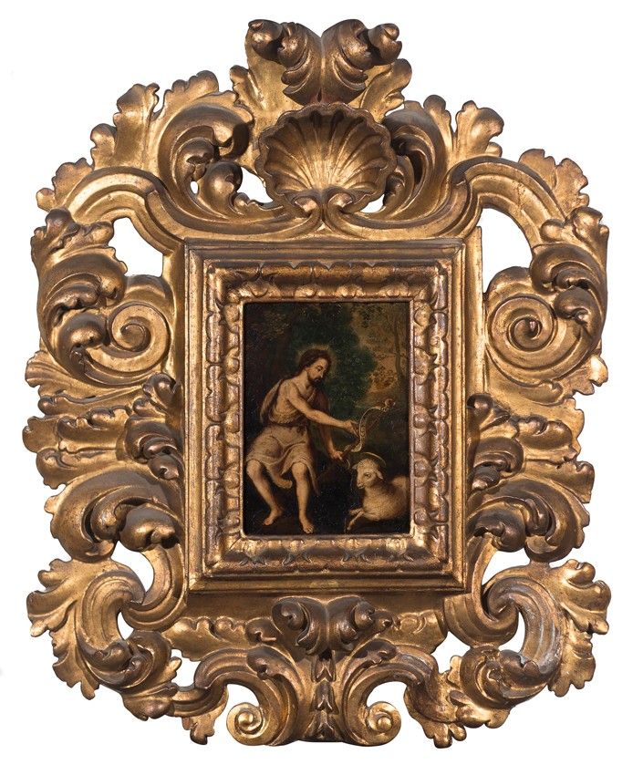 Oil on copper. With an imposing late 17th-century carved and gilded wooden cornucopia frame.