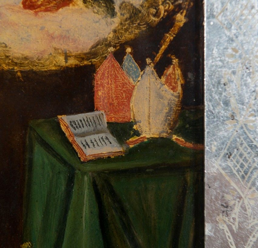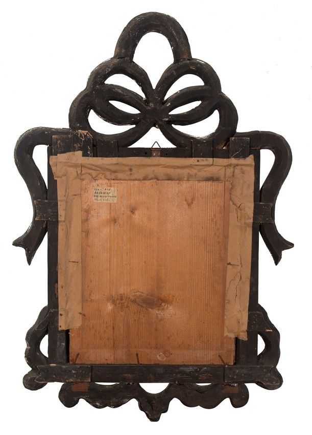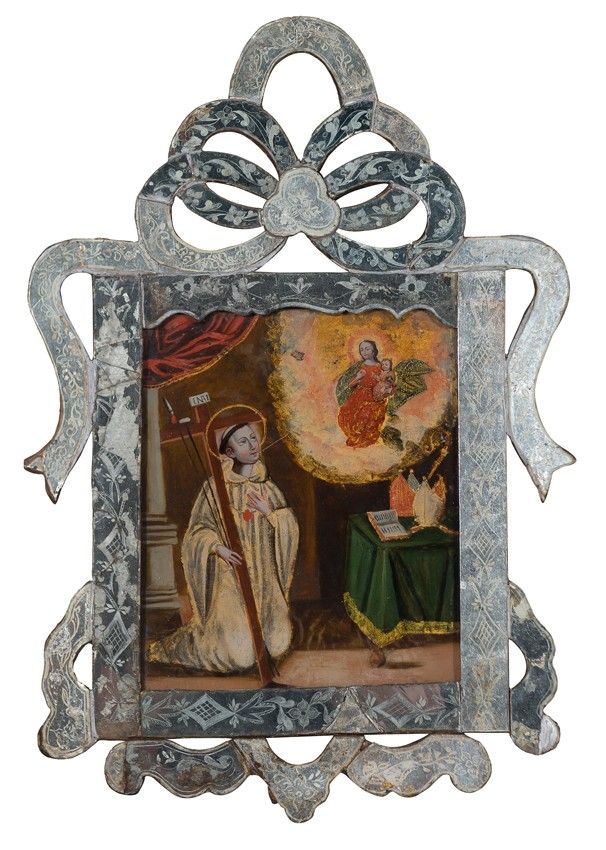 Reverse glass painting. With an important mirror frame in the Venetian style adapted to the New Spanish aesthetic.