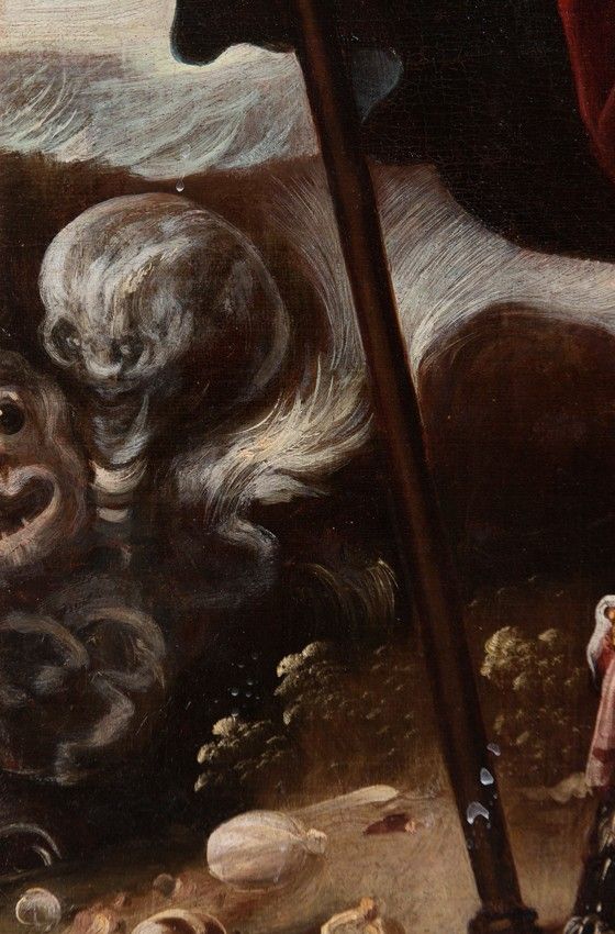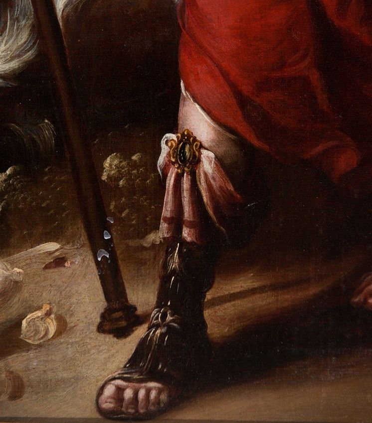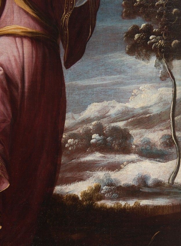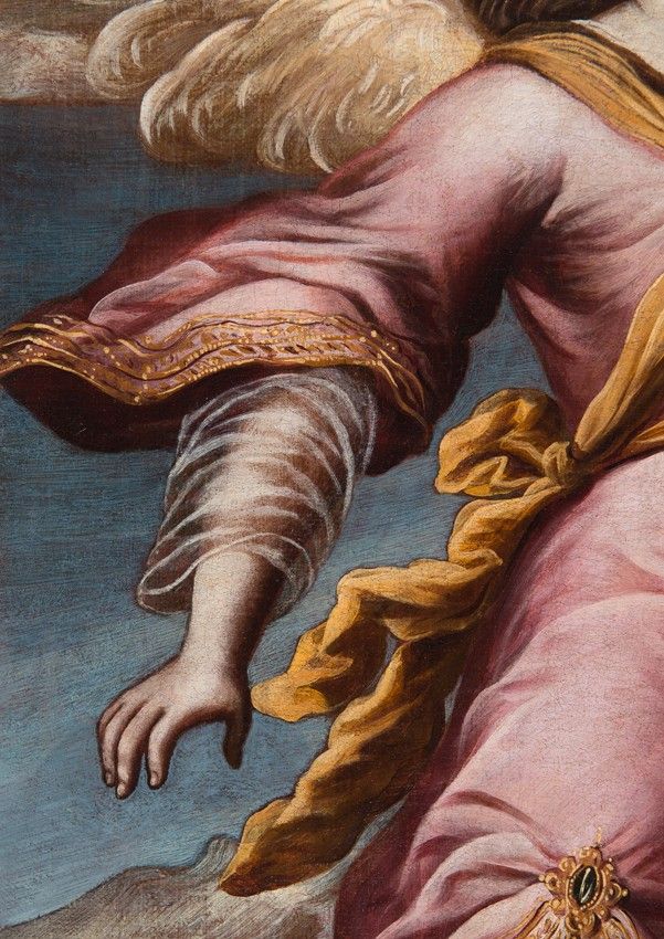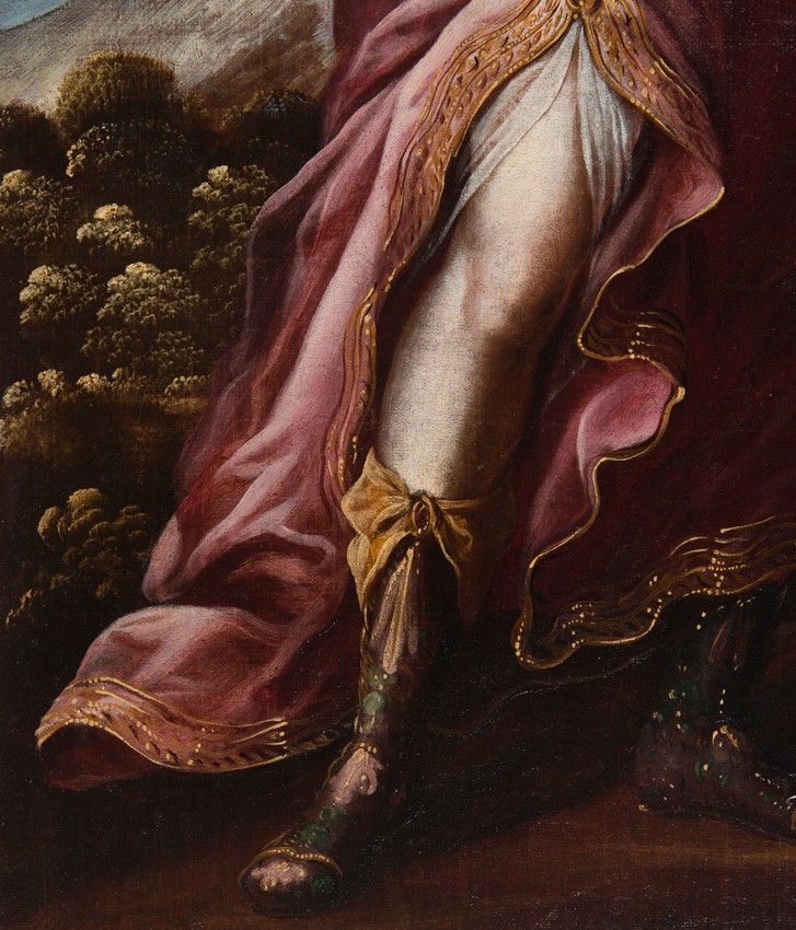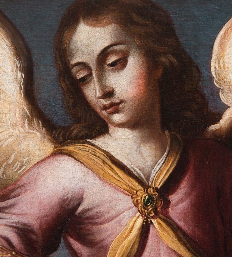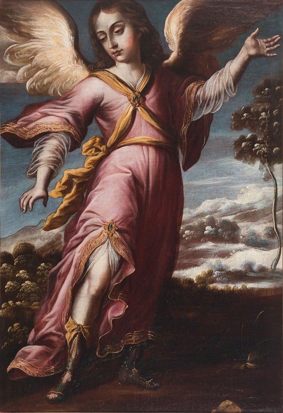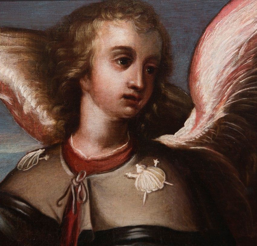- In the garments, the similarities are also evident, in the chromatic choices made by the painter, the movement he always conveys in the clothing, the use of a silk blouse with a transparent glaze that always appears beneath the sleeves and at the lower openings of the garments, which the painter gathers with a jeweled clasp to reveal the legs of the Archangel, a gesture very much in keeping with Baroque taste.