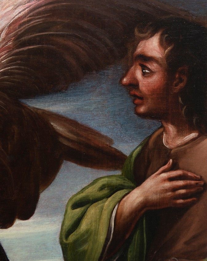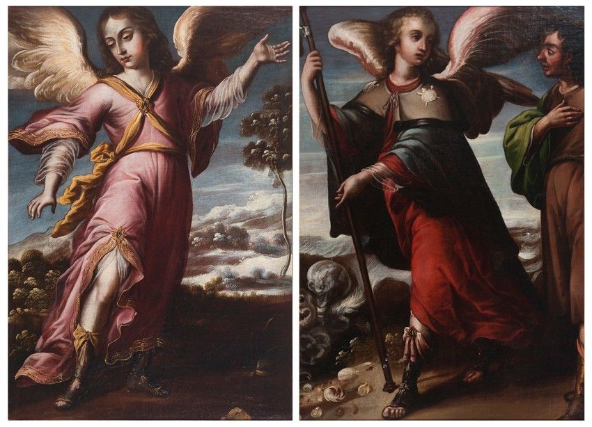 This sense of natural movement that we mentioned is always enhanced by the special posture of the Archangel, with arms often extended and forming a diagonal, drawing another figure of the scene toward him or indicating a path, as happens in our Saint Raphael as a pilgrim.