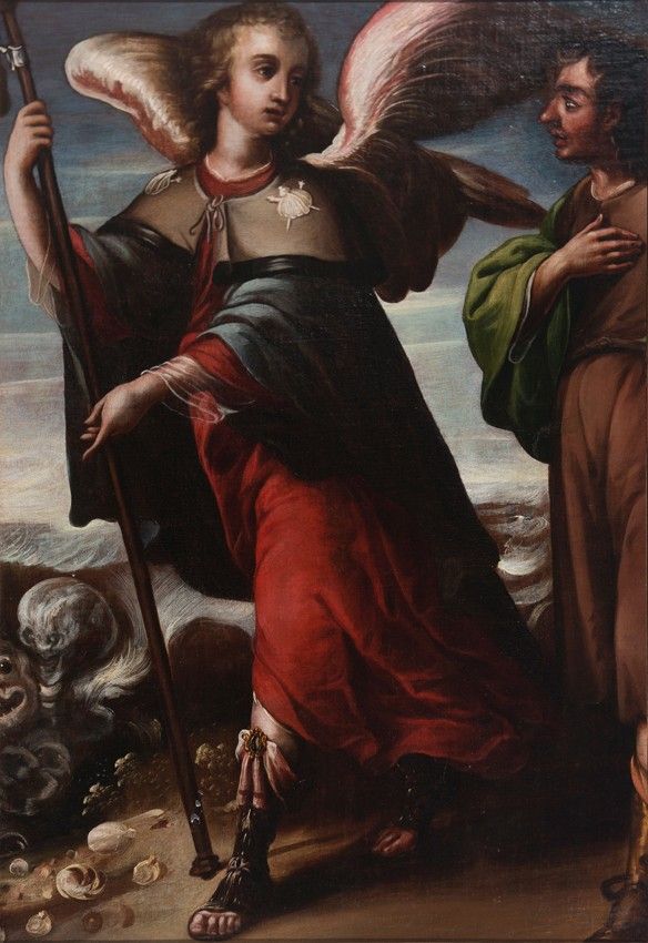 There is a clear relationship between the person portrayed and the Book of Tobias. The Book of Tobit in the Old Testament recounts how Saint Raphael the Archangel helped Tobias marry Sarah, a woman who saw the men she married before die, tormented by a devil on their wedding night. Raphael accompanied Tobias on his journey, holding his hand. Hence, he is the “guide of travelers or pilgrims.”