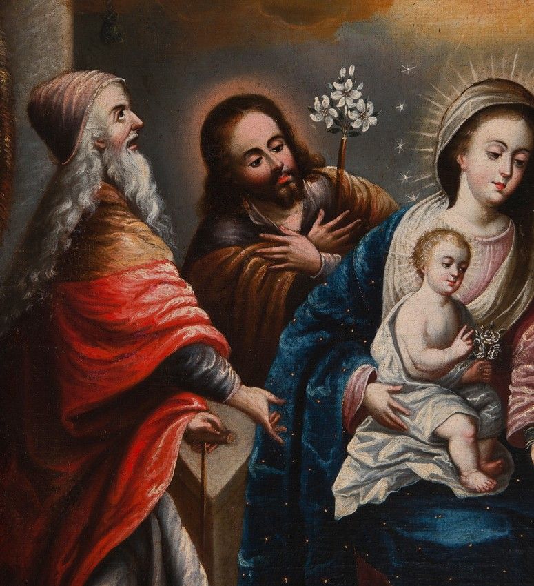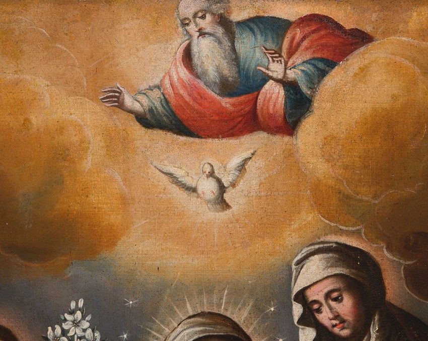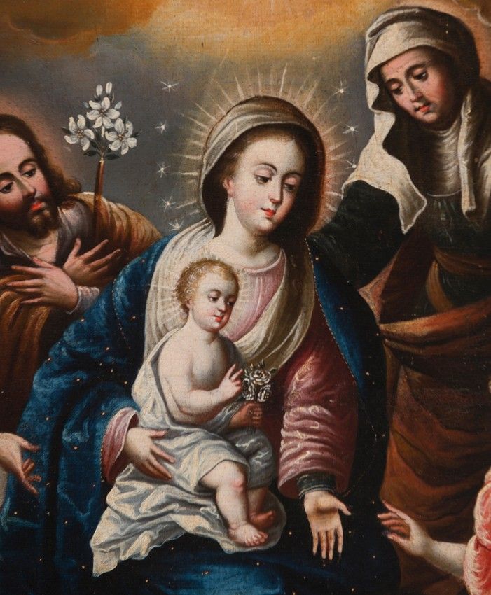 A curious, luminous, and devotional painting depicting Saint Peter Pascual, a Spanish religious figure and Mercedarian bishop of Jaén (Valencia, c. 1277 – Granada, 1300), being consoled and invited to offer his sufferings in captivity to the Holy Kinship: the Virgin Mary—whom he fervently defended in his writings—holding the Christ Child in her arms; Saint Joseph, praying silently and devoutly with hands crossed over his chest; Saint Joachim, who presents and introduces him; and Saint Anne, who welcomes him with open arms.