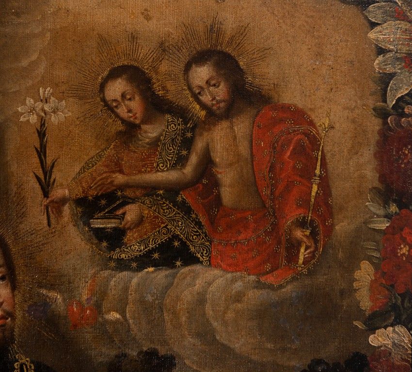A distinctive feature of Cusco painting visible in this piece is the generous application of gold leaf: in the saint’s collar and belt, the crown at his feet, the angel’s starry cloak, and the richly embroidered garments of Jesus and Mary.