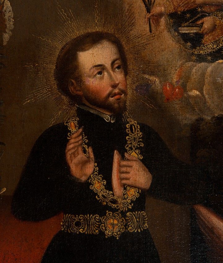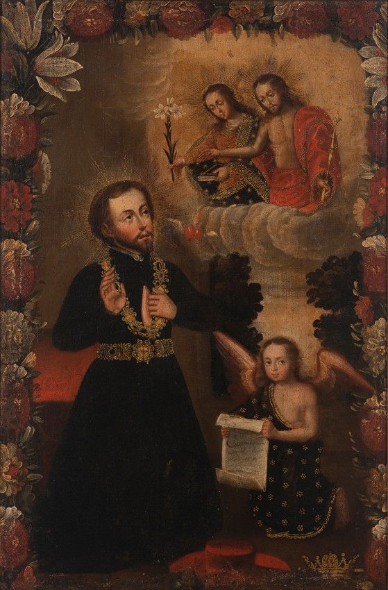 Exquisitely executed, this work depicts the mystical union between Saint Francis Xavier and the Divinity, represented here by Jesus alongside His mother Mary, who extends her arm to offer him a lily—symbol of his chastity and his devoted love for the Virgin. The saint, born in Navarre, offers them his winged heart, aflame with love, flying upwards in an act of total surrender.