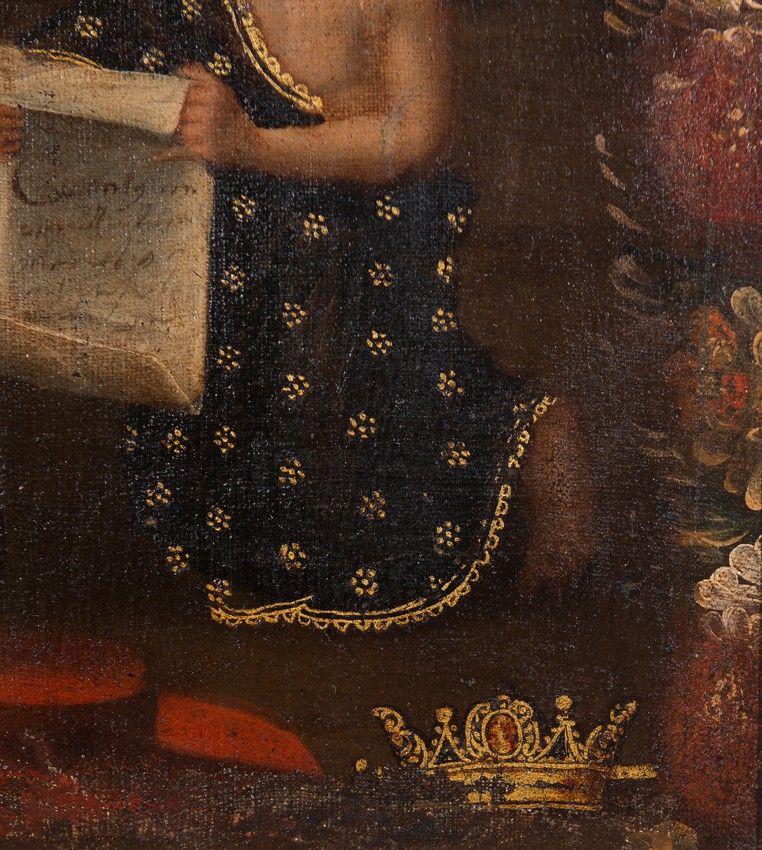 Flemish influence is also evident in the floral garland that frames the entire scene—a genre that flourished in the Low Countries in both the Flemish and Dutch schools, as well as in certain Italian regions. The carefully arranged flowers and leaves serve to frame and mystify the moment. Among them are roses, peonies, carnations, wallflowers, daffodils, lilies, tulips, irises, and other blooms—some common, some native to Peru—many of them copied from various paintings.