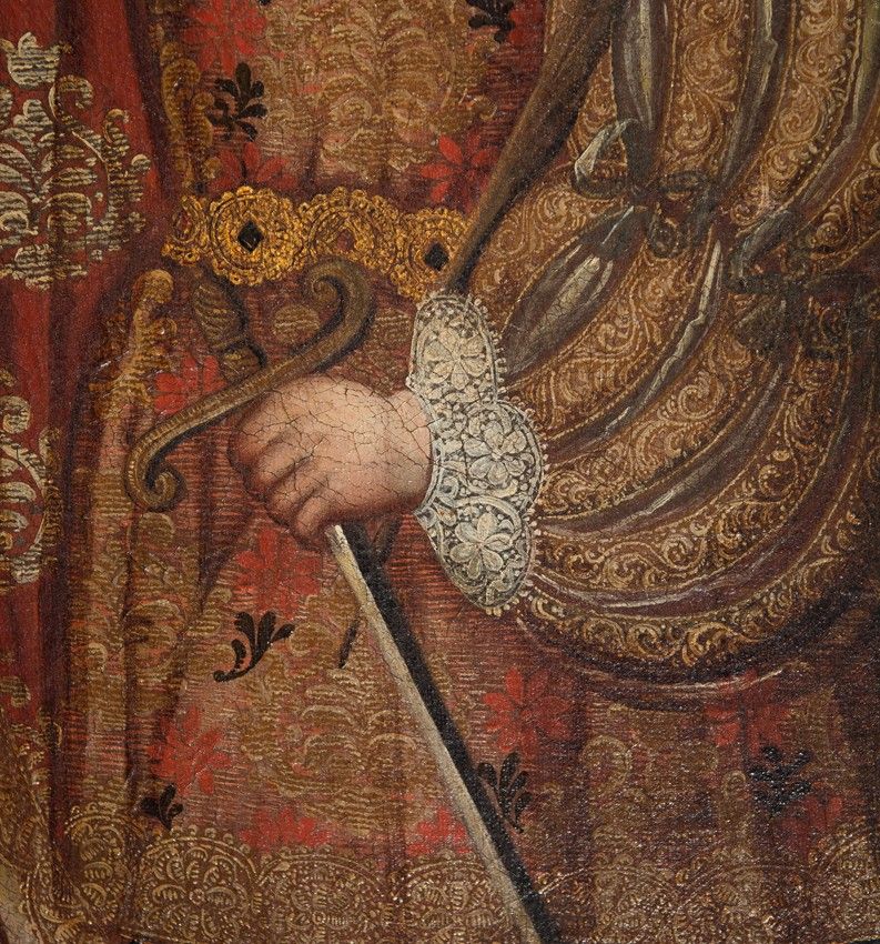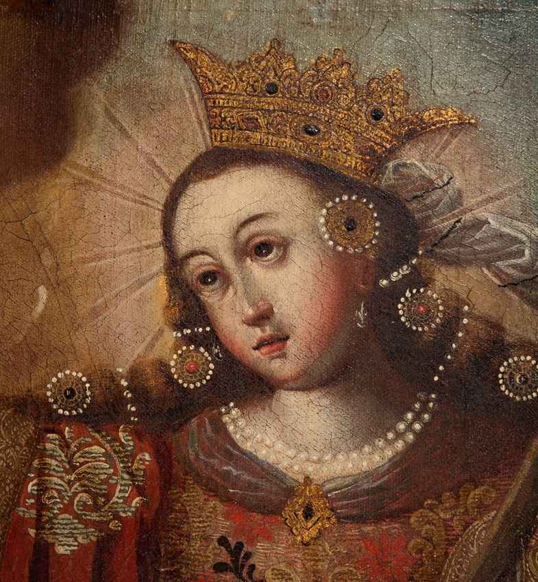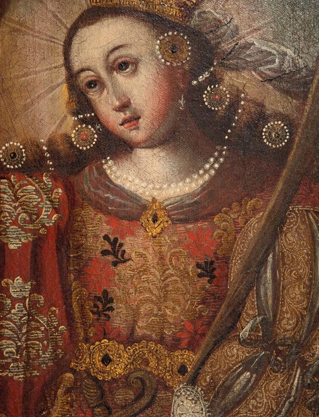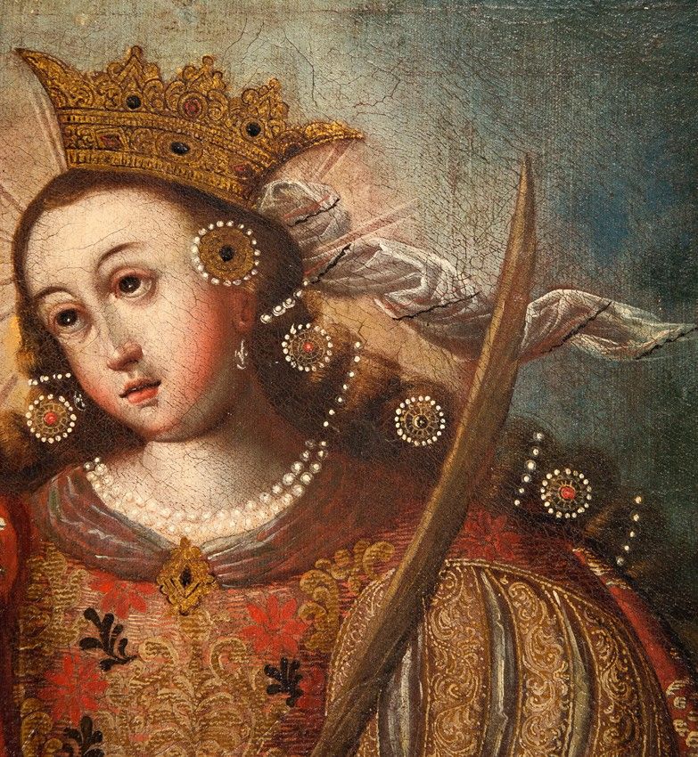 Noble maiden, martyr of Alexandria in 305. The saint represented with the wheel of knives, attribute of her torment, and wearing a virgin's crown and a book for the wisdom with which she refuted the pagan philosophers. Represented stepping on the head of King Maxentius, whom she refused to marry when he asked her to renounce her faith, she is dressed in noble clothes and crowned, and according to the legend, she is of great beauty.