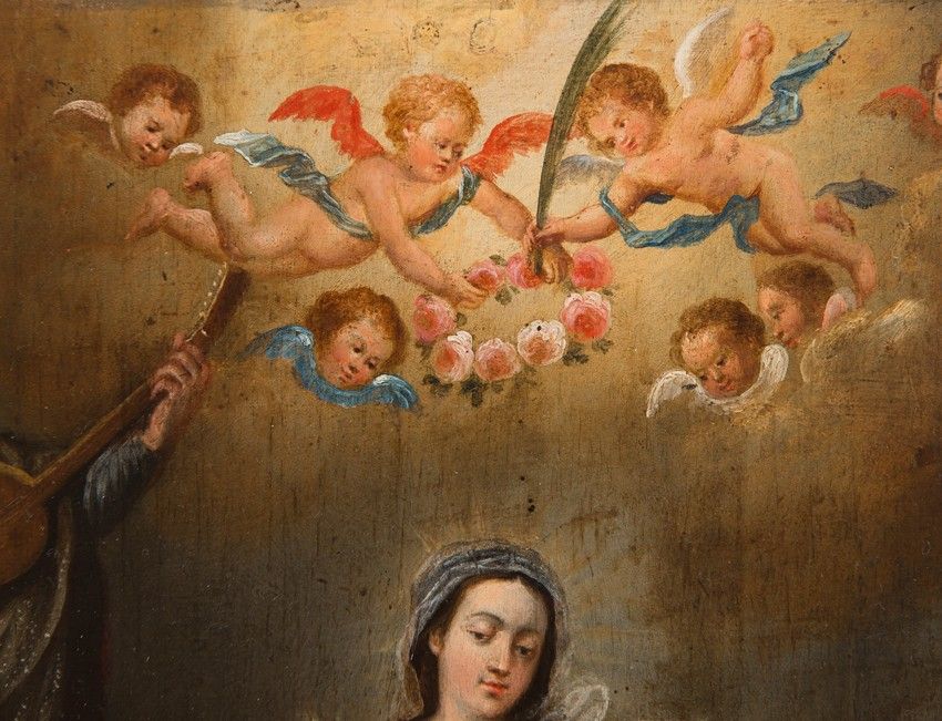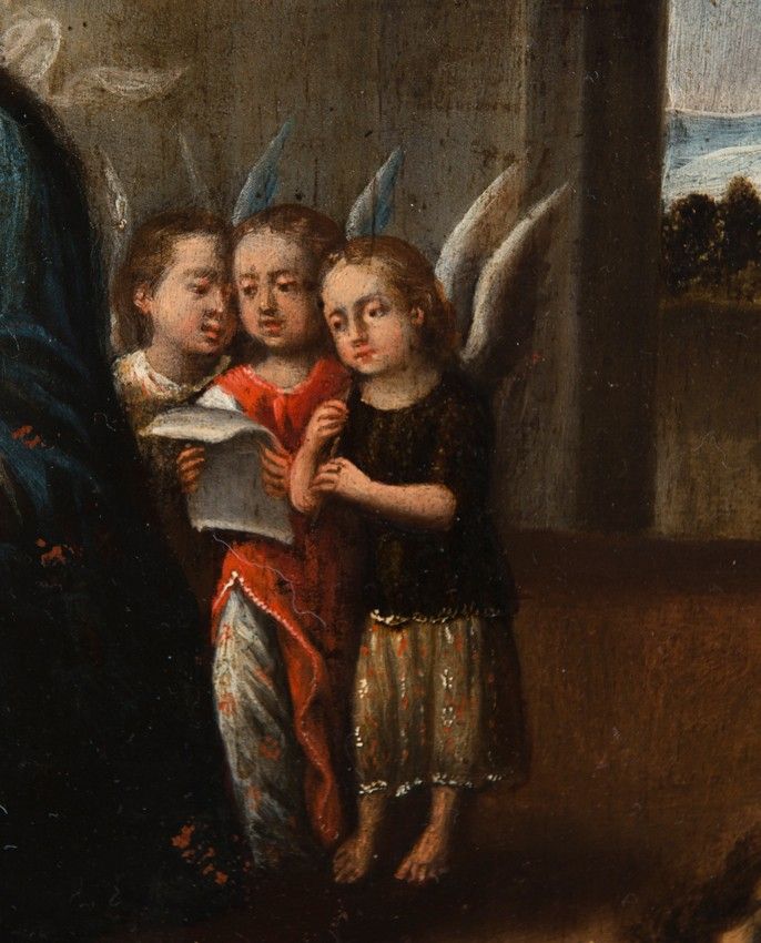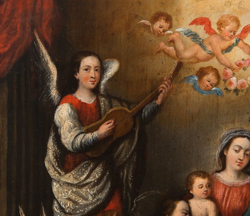 Among the heavenly figures are a choir of singing angels and a musician. The angel playing the lute or guitar looks directly at us, as if calling for silence and attention; the three singing angels to the right—a veiled symbol of the Trinity—celebrate the victorious moment in the lives of these two saints. They are richly dressed, adorned with embroidered garments, floral motifs, and surplices.