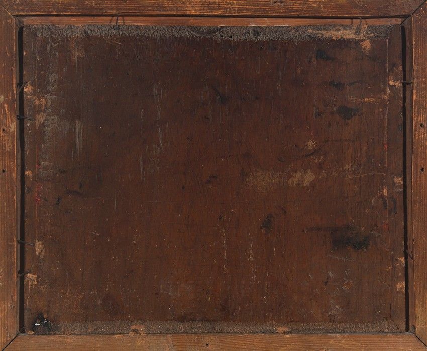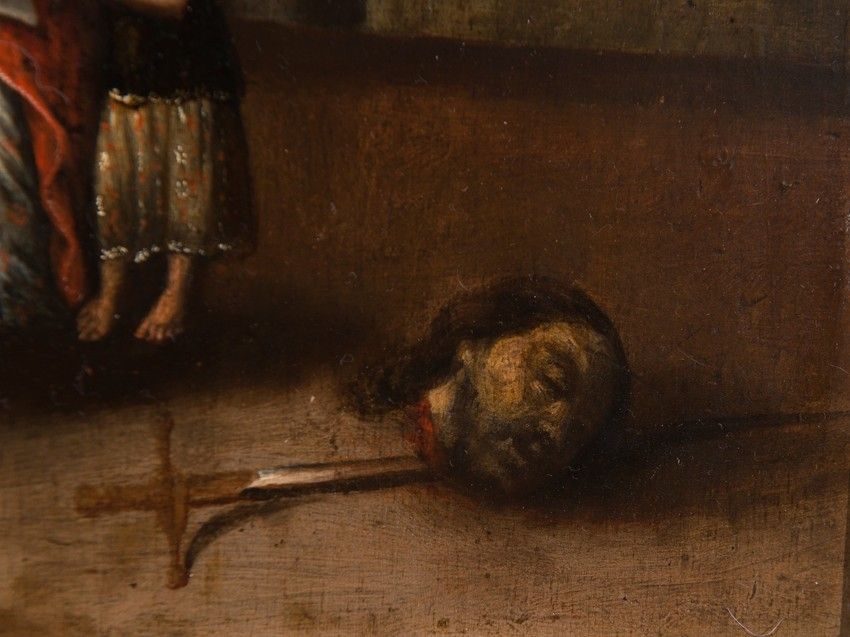 A curious depiction of a “two-in-one” scene, combining the tender brushstrokes of the mystical marriage of a saint—whose identity remains unknown due to the absence of specific iconographic attributes—with the harrowing image of the freshly severed and bloodied head of the Forerunner, joined by the sword that beheaded him at the request of Herodias.