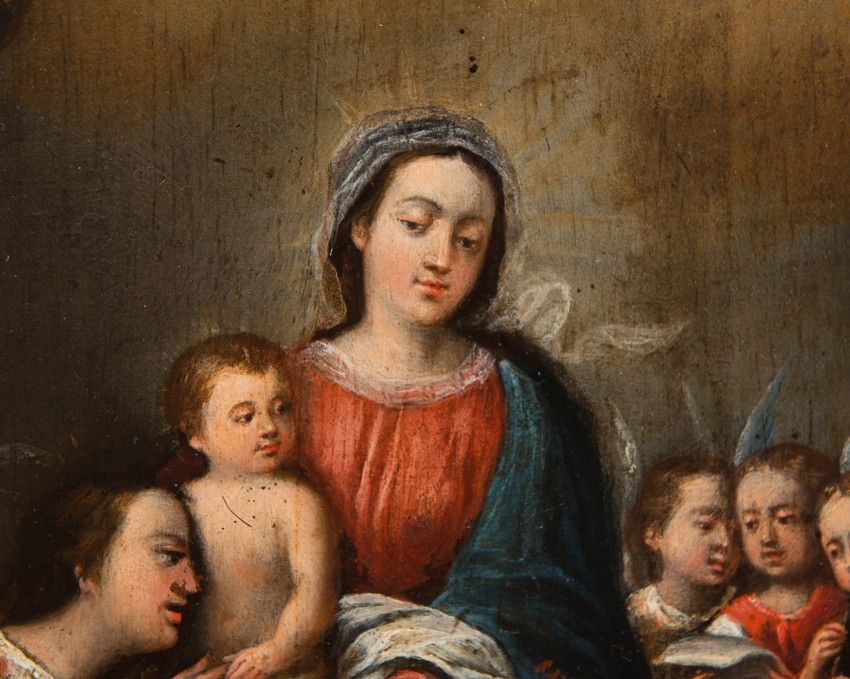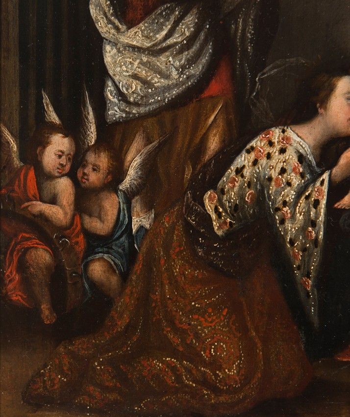 The saint in the mystical marriage resembles, in both posture and dress, Saint Catherine of Alexandria as painted by Juan Carreño de Miranda in the painting held by the Venerable Third Order in Madrid, or also the saint painted by Martín Cerezo, currently in the Prado Museum. The Virgin and Child, with their gentle tilt of the head, are reminiscent of figures painted by Bartolomé Esteban Murillo, suggesting that the artist took inspiration from well-known painters.