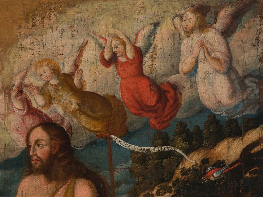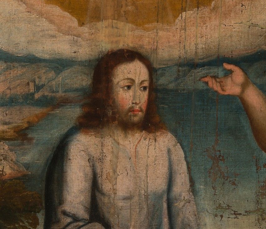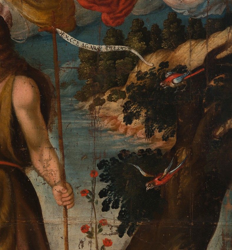 The painting remains faithful to that account, portraying the River Jordan, where Jesus approaches to be baptized, and where John the Baptist was preaching. In the background of the landscape is Galilee, which frames this composition by showing the place.