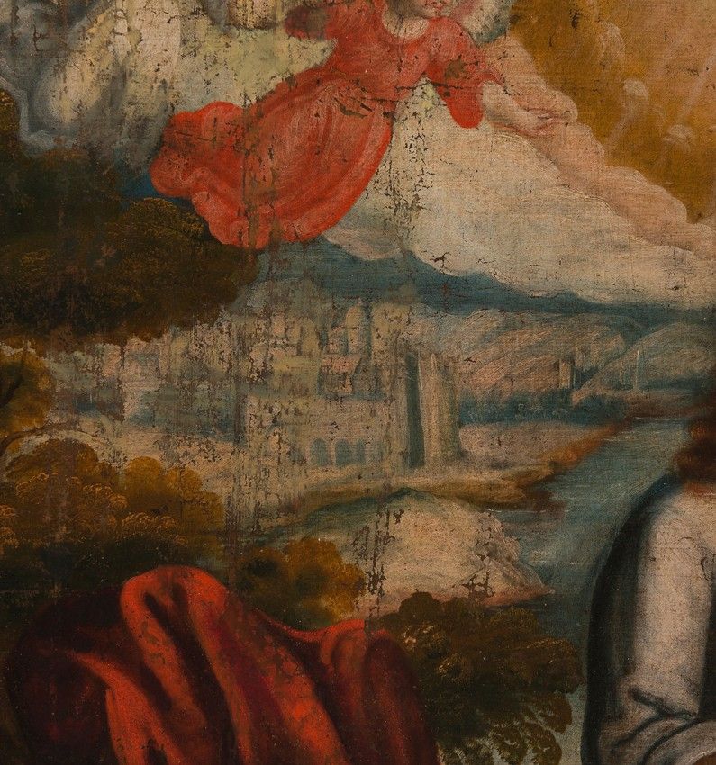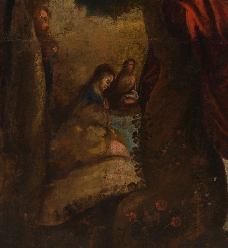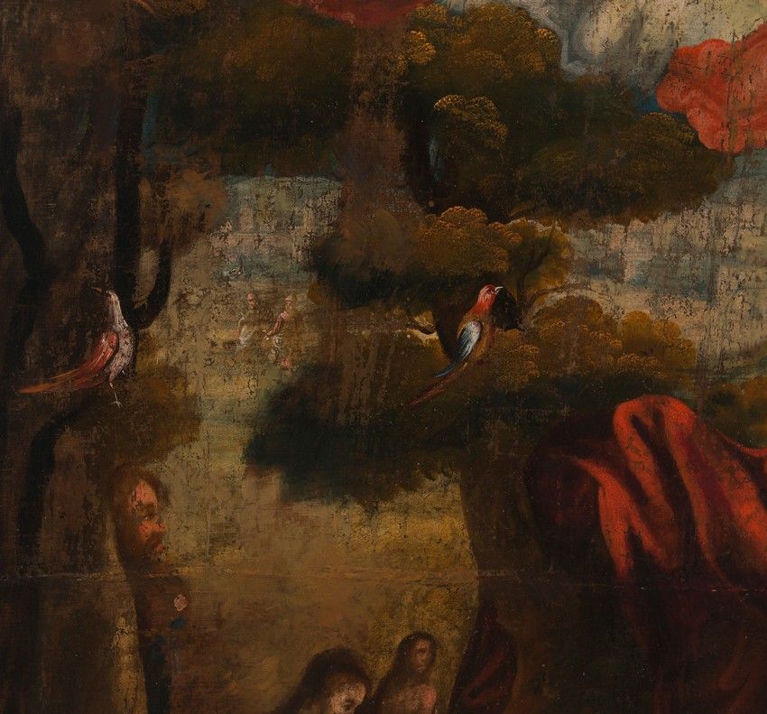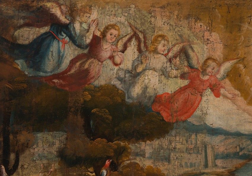 The color palette is outstanding, and very much in the style of Quispe Tito and the Cuzco School, along with the Flemish influence evident in the background landscape and the depiction of local birds such as parrots and macaws, which we see perched on rocks and cliffs, or flying through the scenery.