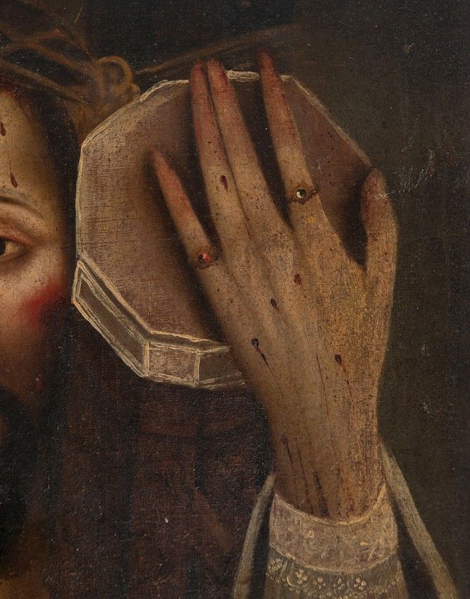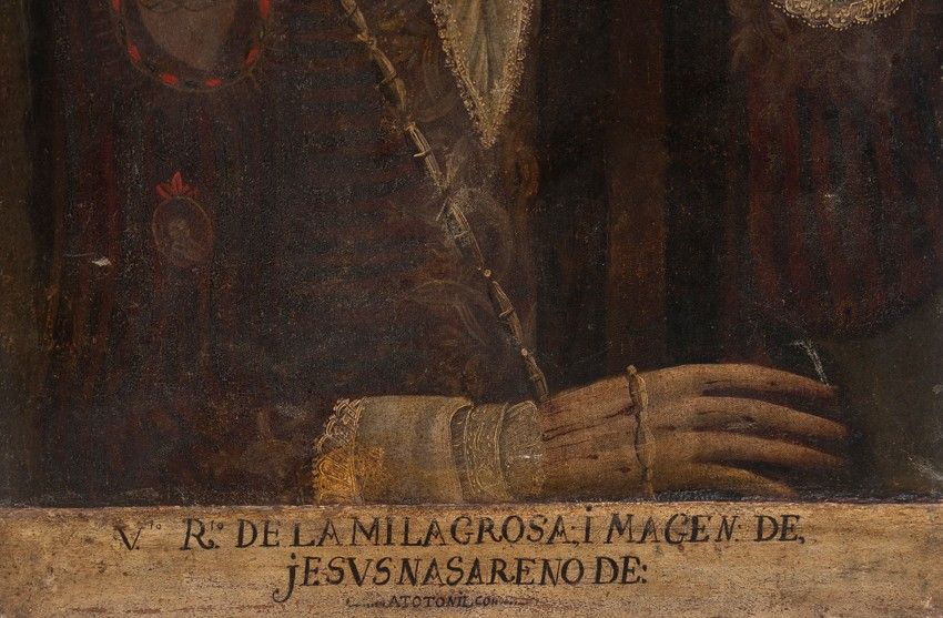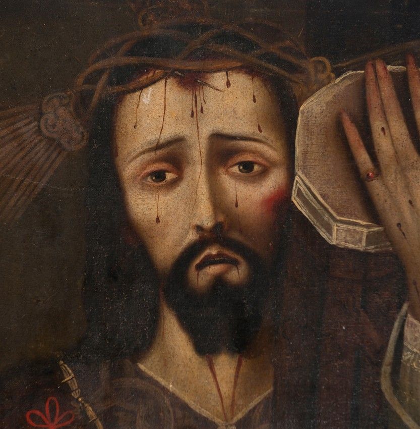 In a languid portrait very typical of popular Mexican Baroque, intensifying His suffering as He carries the cross, the author of this work depicts the well-known and beloved Nazarene of Atotonilco, as named in the inscription at the bottom of the canvas. The original image is located in the Sanctuary of Jesus of Nazareth in Atotonilco, Guanajuato, Mexico, near San Miguel de Allende.