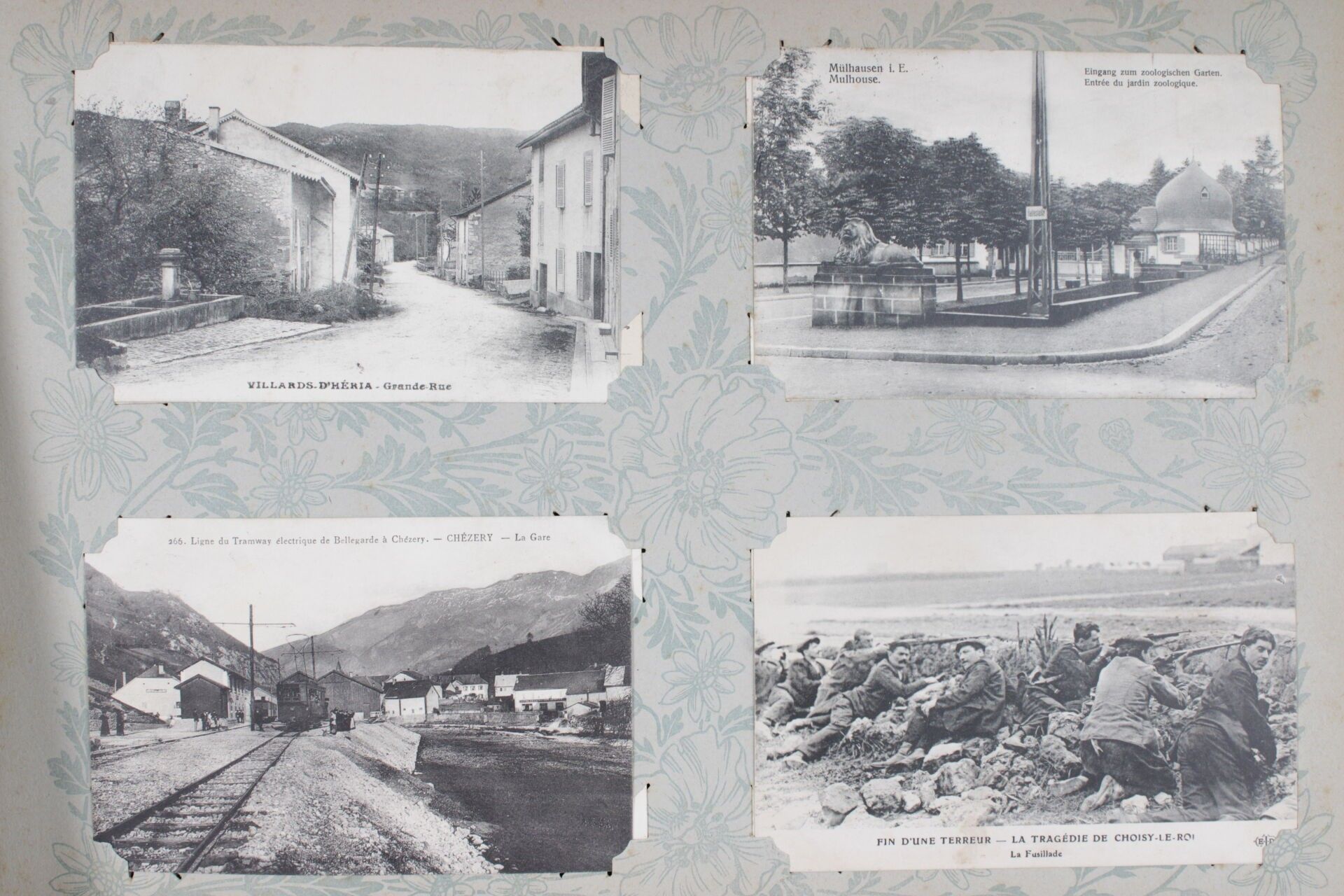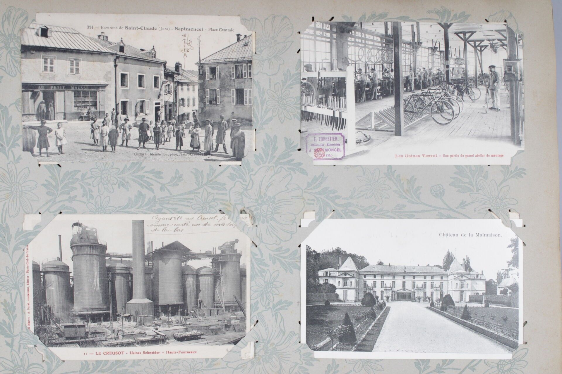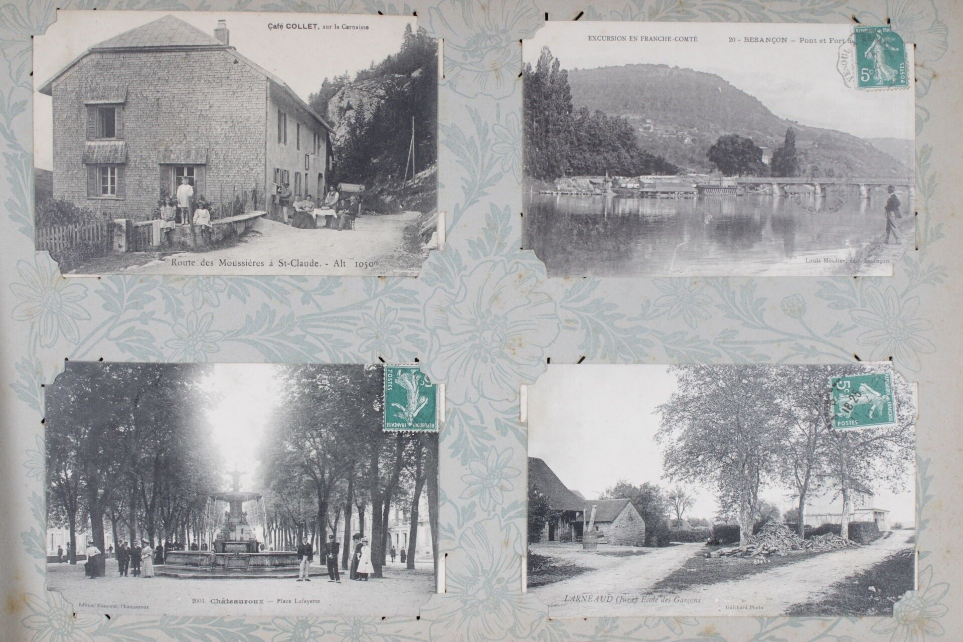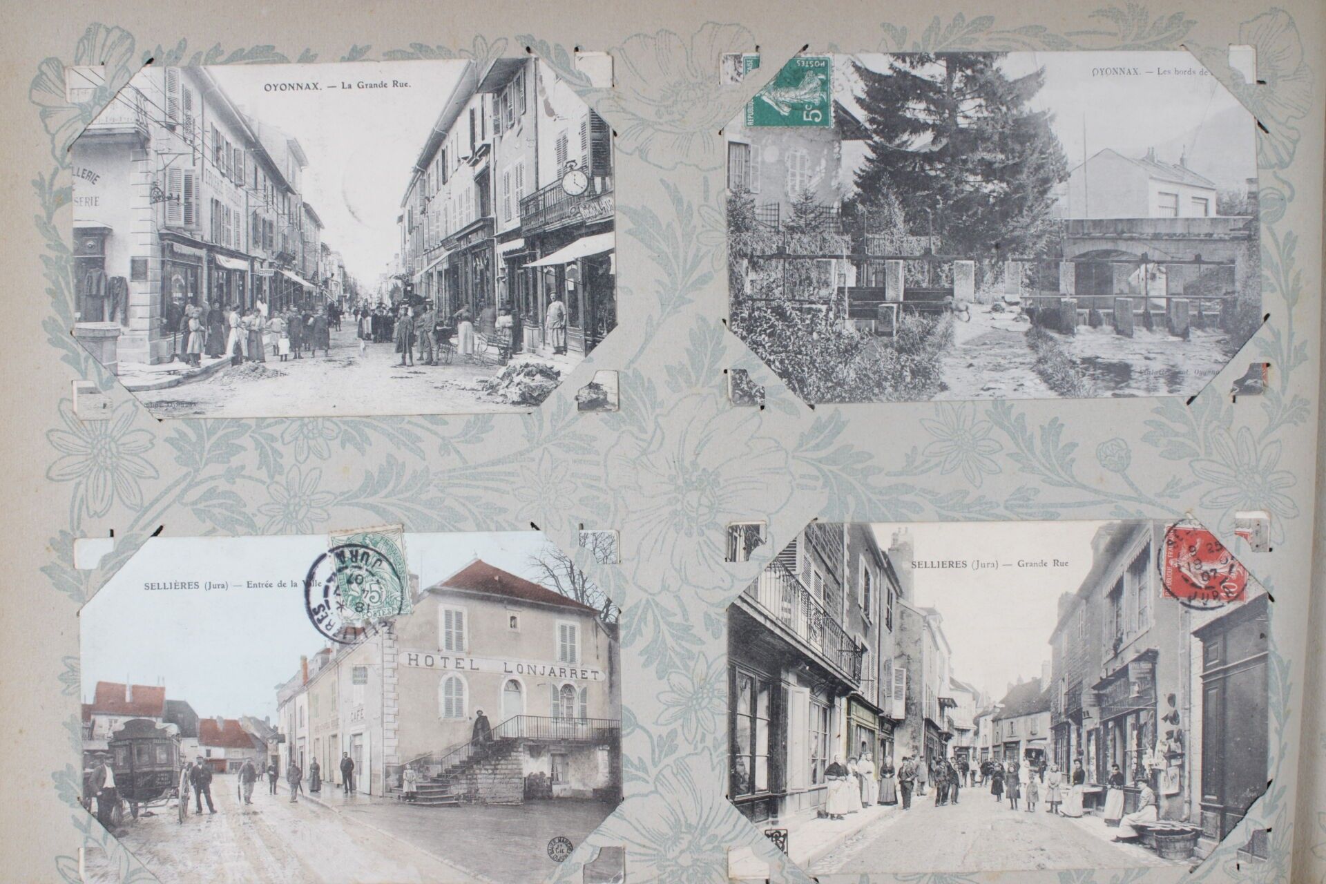 Album of old postcards including many villages in the Jura (Septmoncel, Café Collet near Conliège, Larneaud, Lamoura, etc.), Terrot factories, the shooting at Choisy le Roi,
