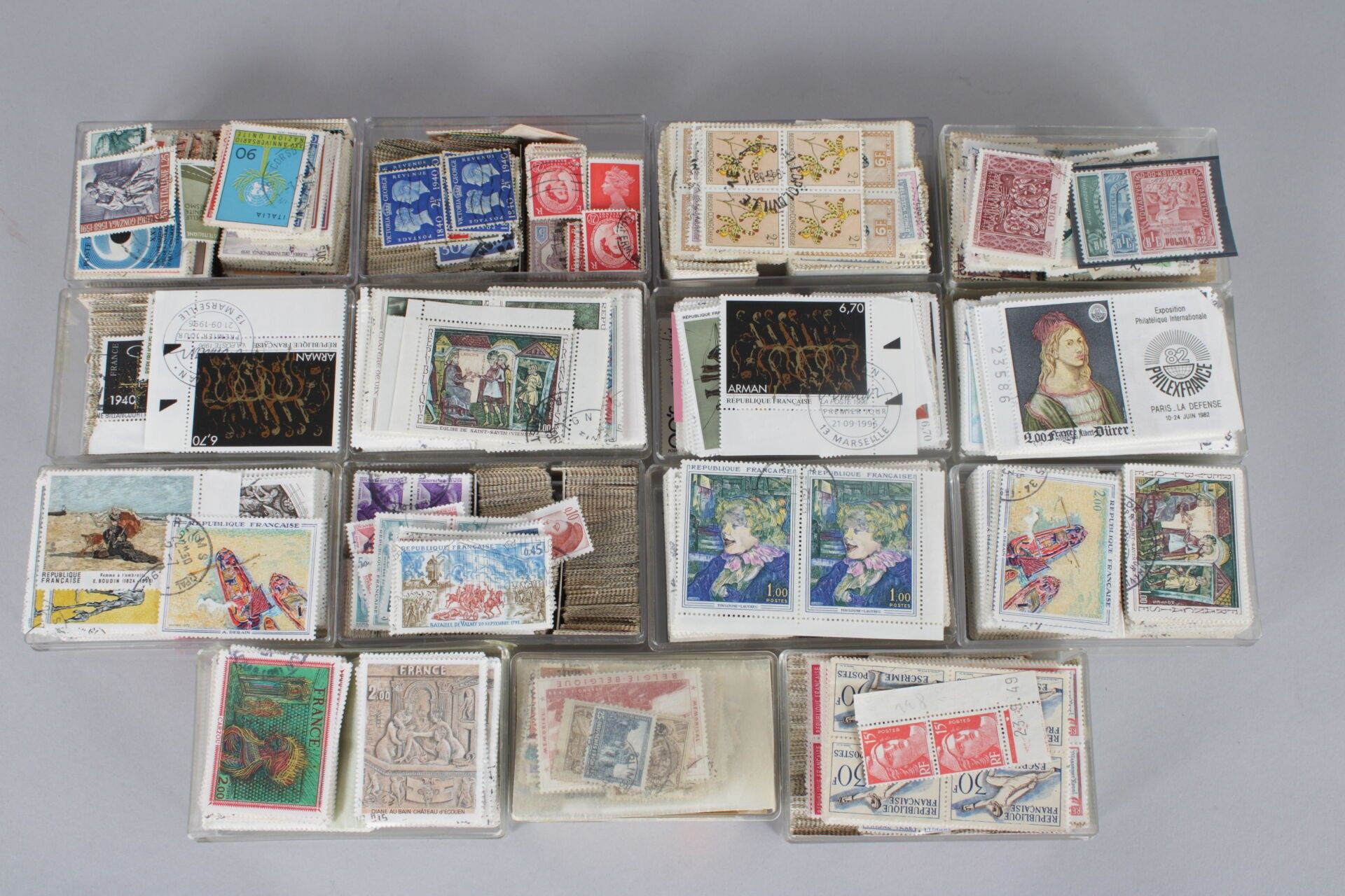 cardboard box made up of bundles of 100 mainly pictures of France (several tens of thousands of stamps).