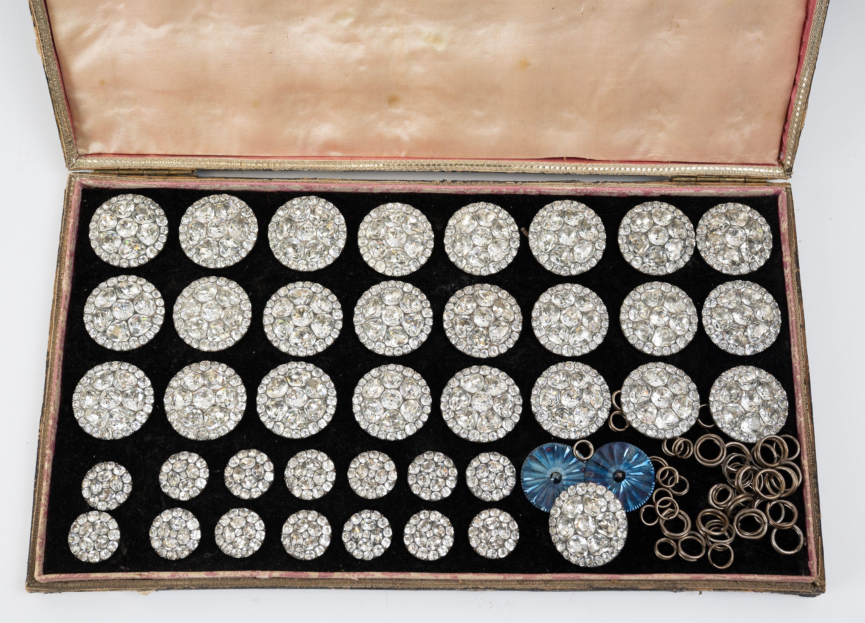 France 18th c, Rare box made of 25 large buttons and 14 small waistcoat buttons in gilt and rhinestones (with 41 rings) - On the reverse side a handwritten note: 'Cette garniture a coûte 25 Louis mon grand-père Abel Michel de LAVERNETTE SM'.