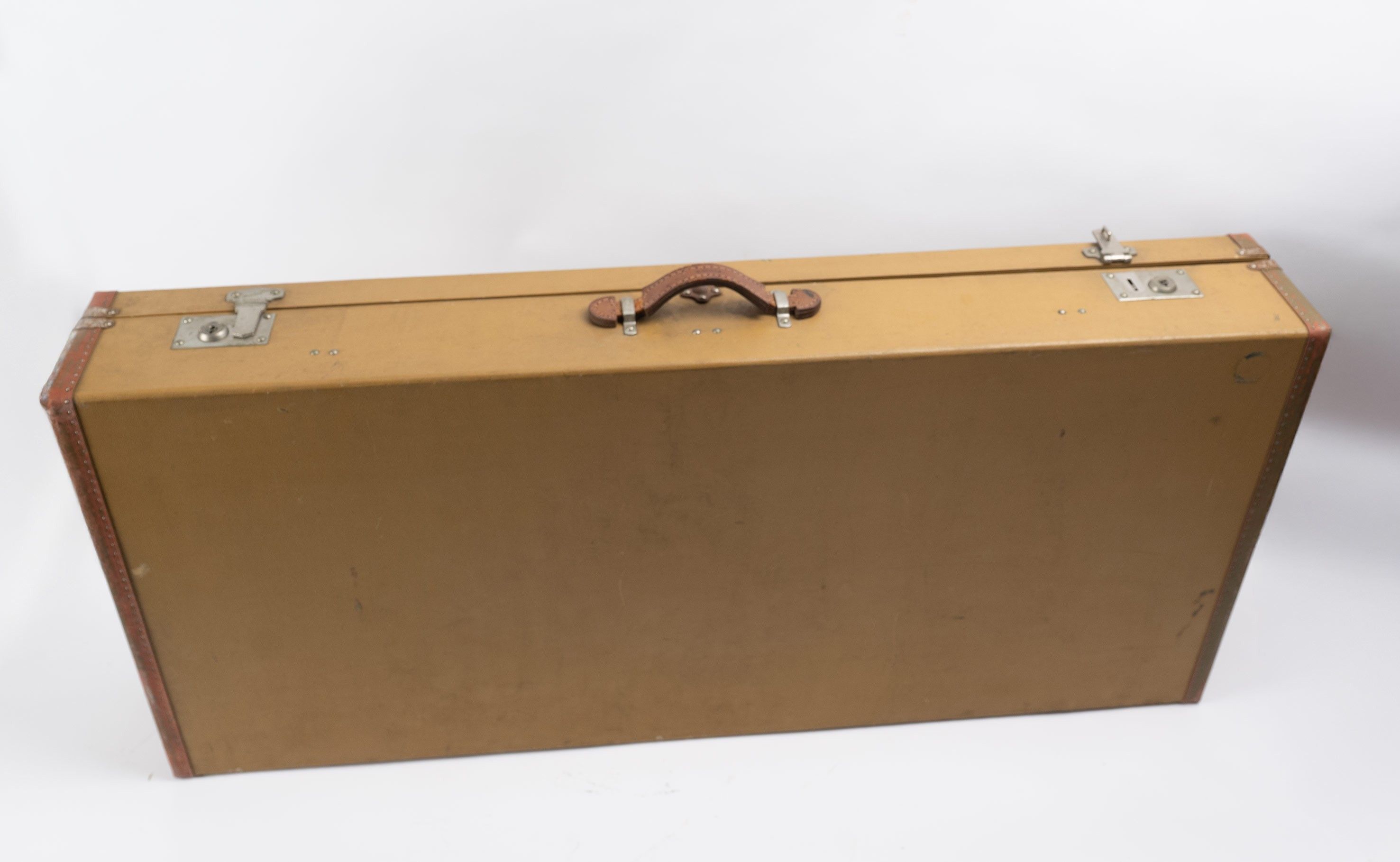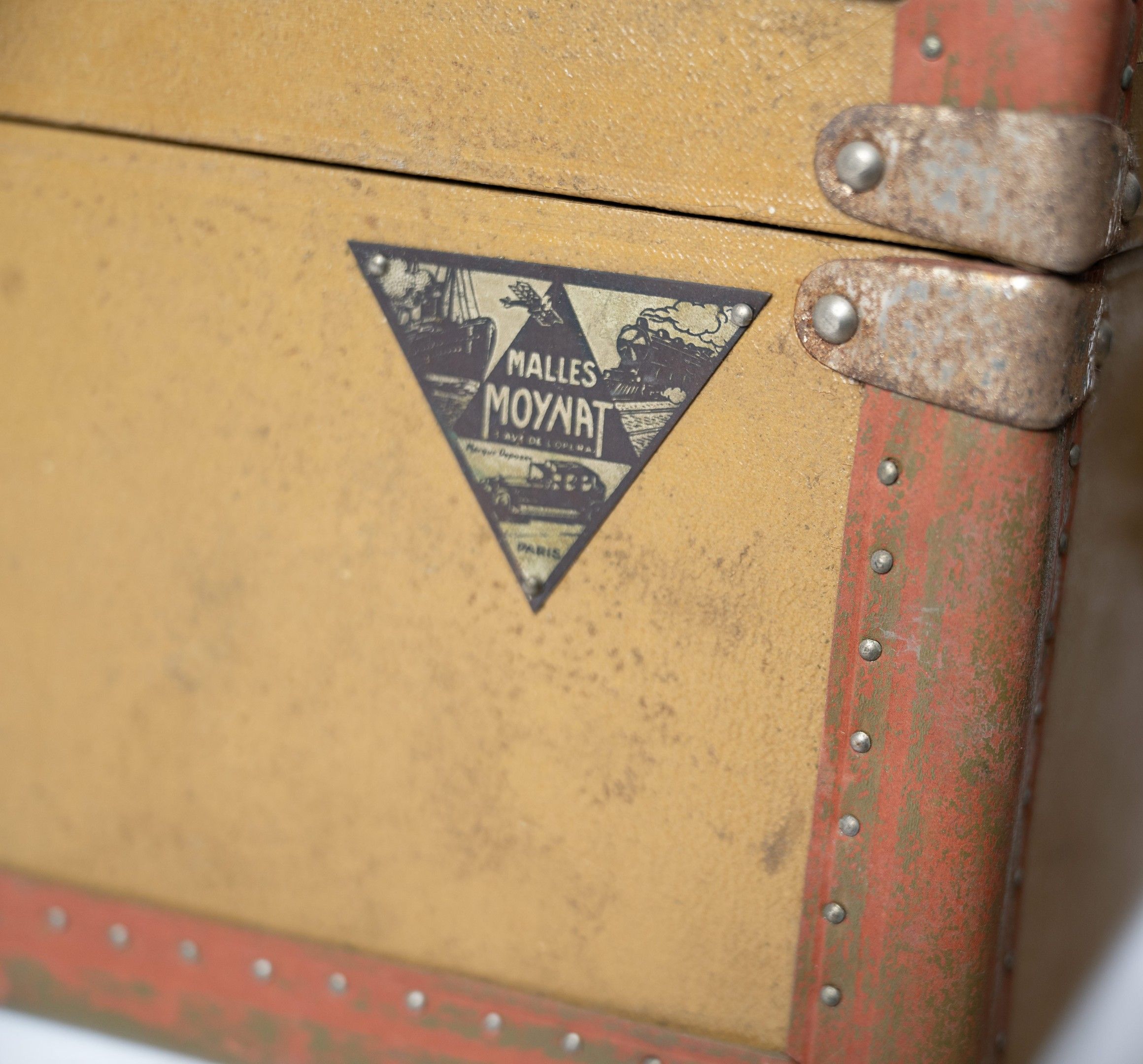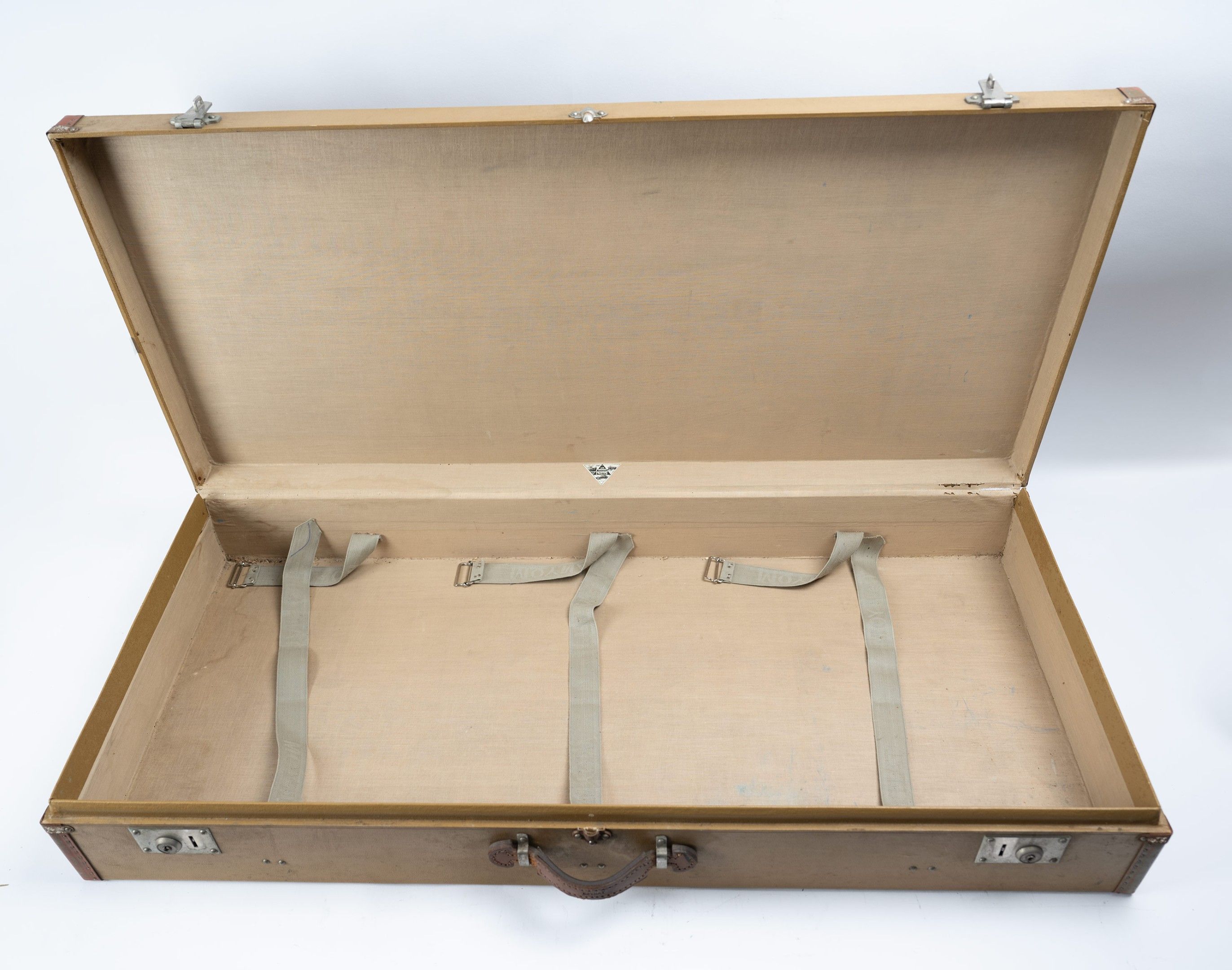 MOYNAT, Travel case, wood sheathed in waxed canvas on the outside, lacquered sheet metal reinforcements, leather handle, H: 16 cm, W: 105 cm, D: 47 cm