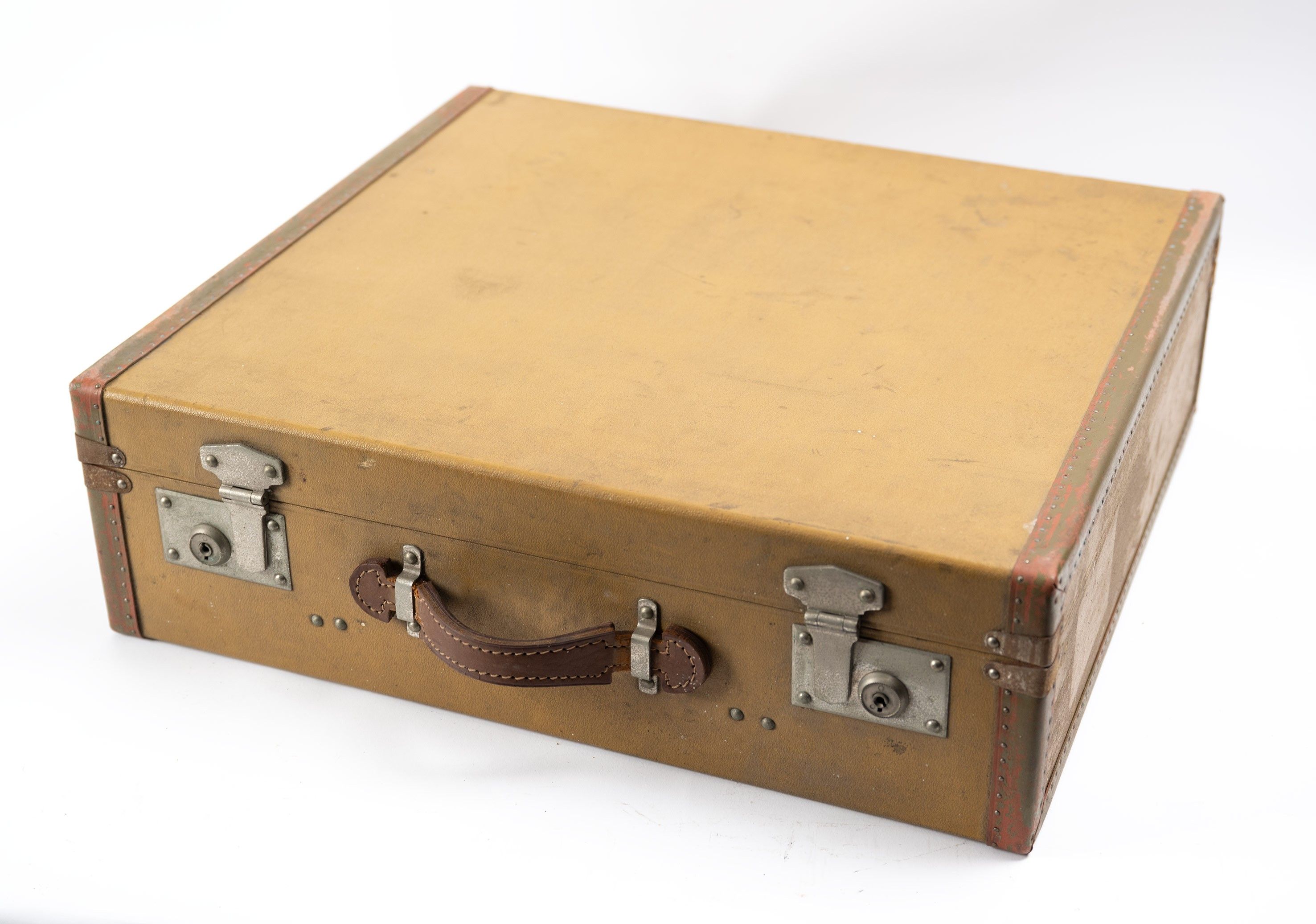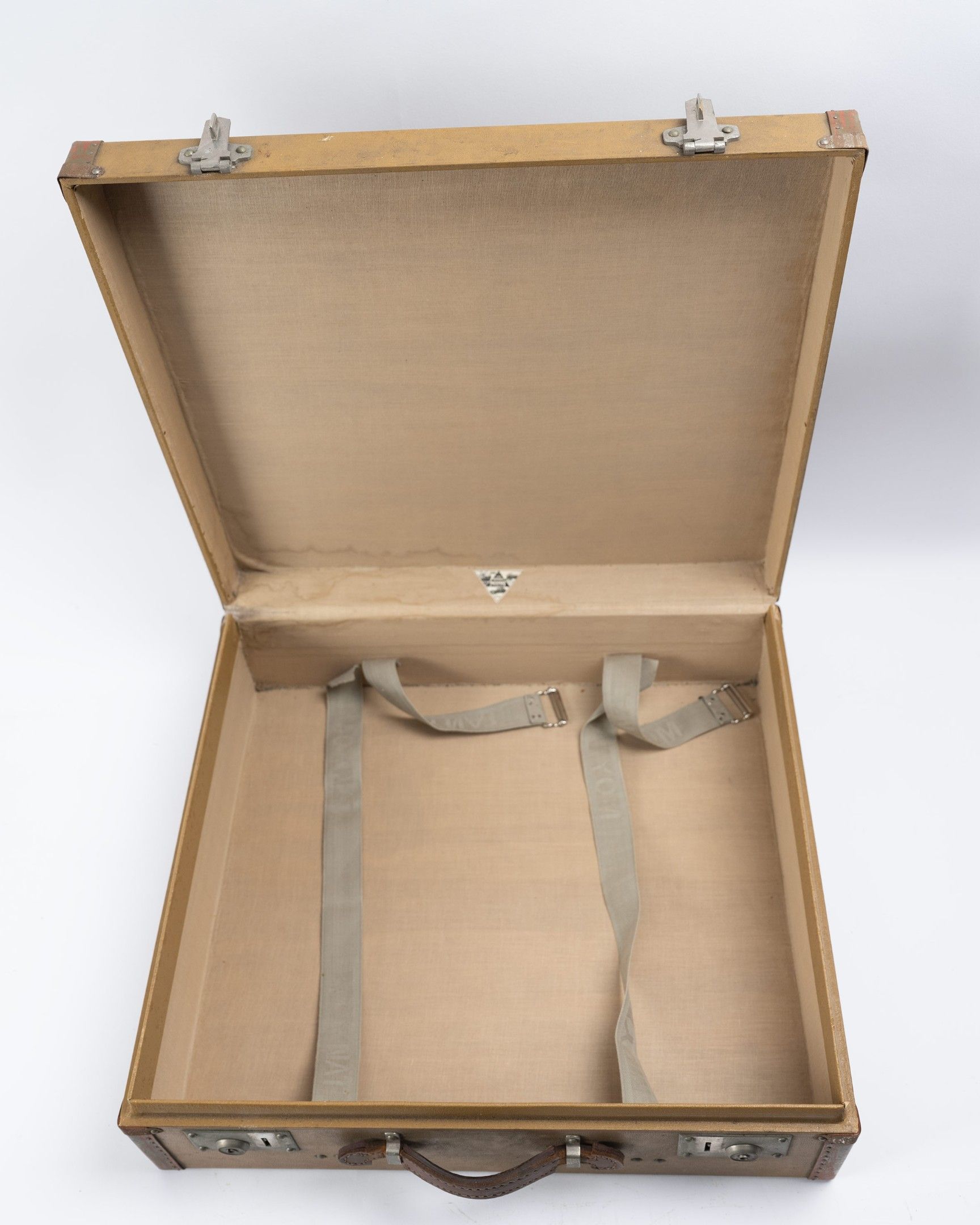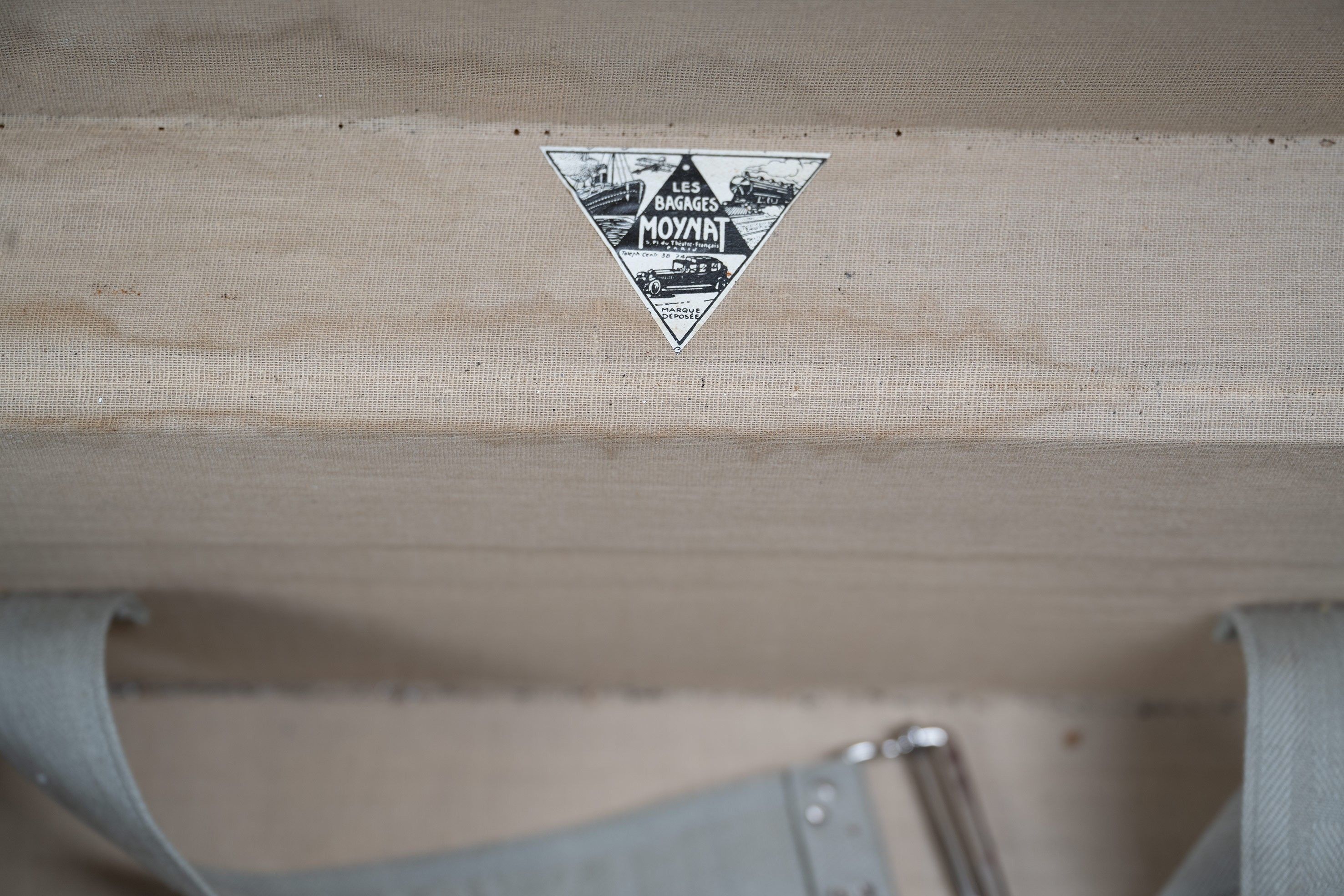 MOYNAT, Travel case, wood sheathed in waxed canvas on the outside, lacquered sheet metal reinforcements, leather handle, H: 16 cm, W: 53 cm, D: 47 cm