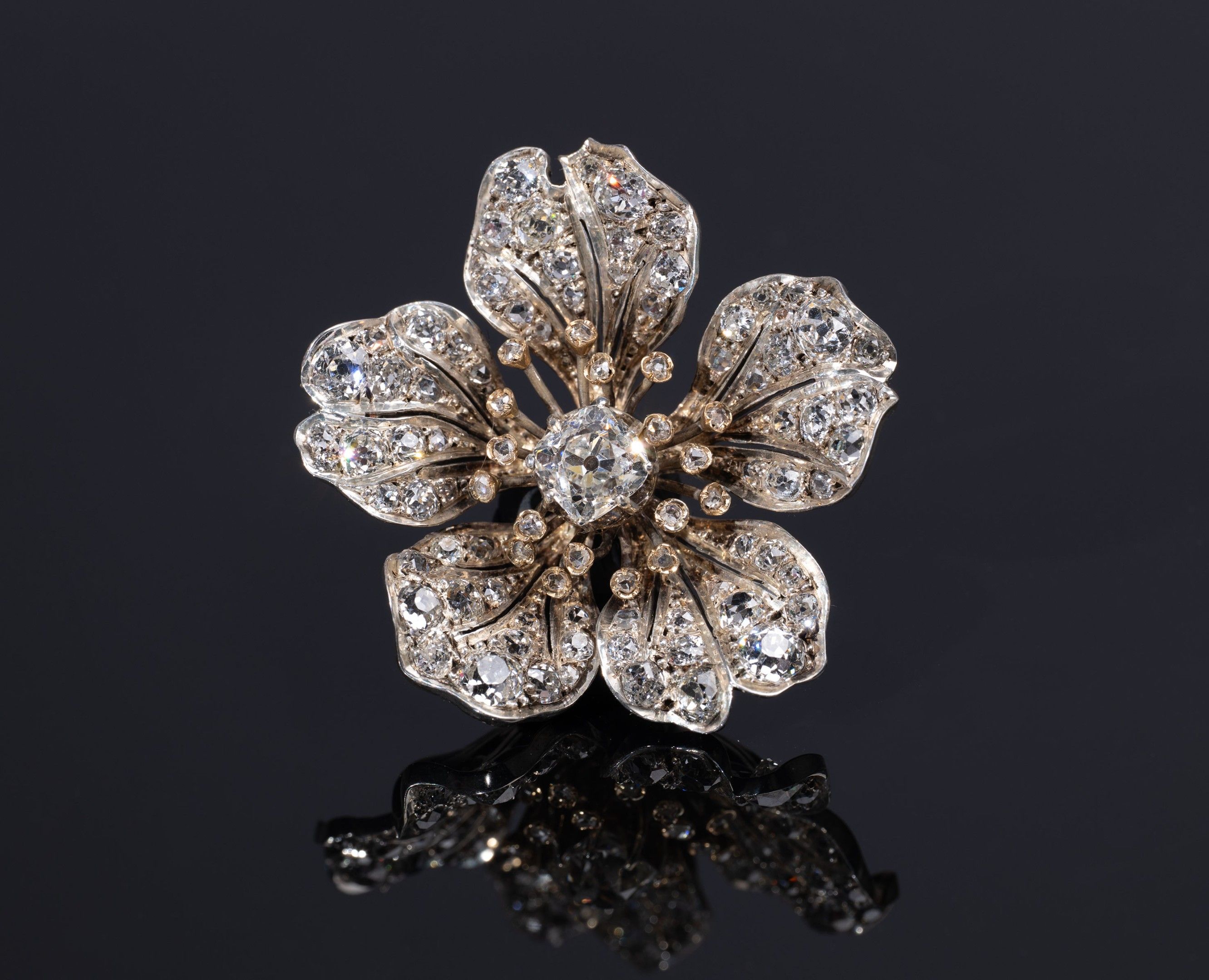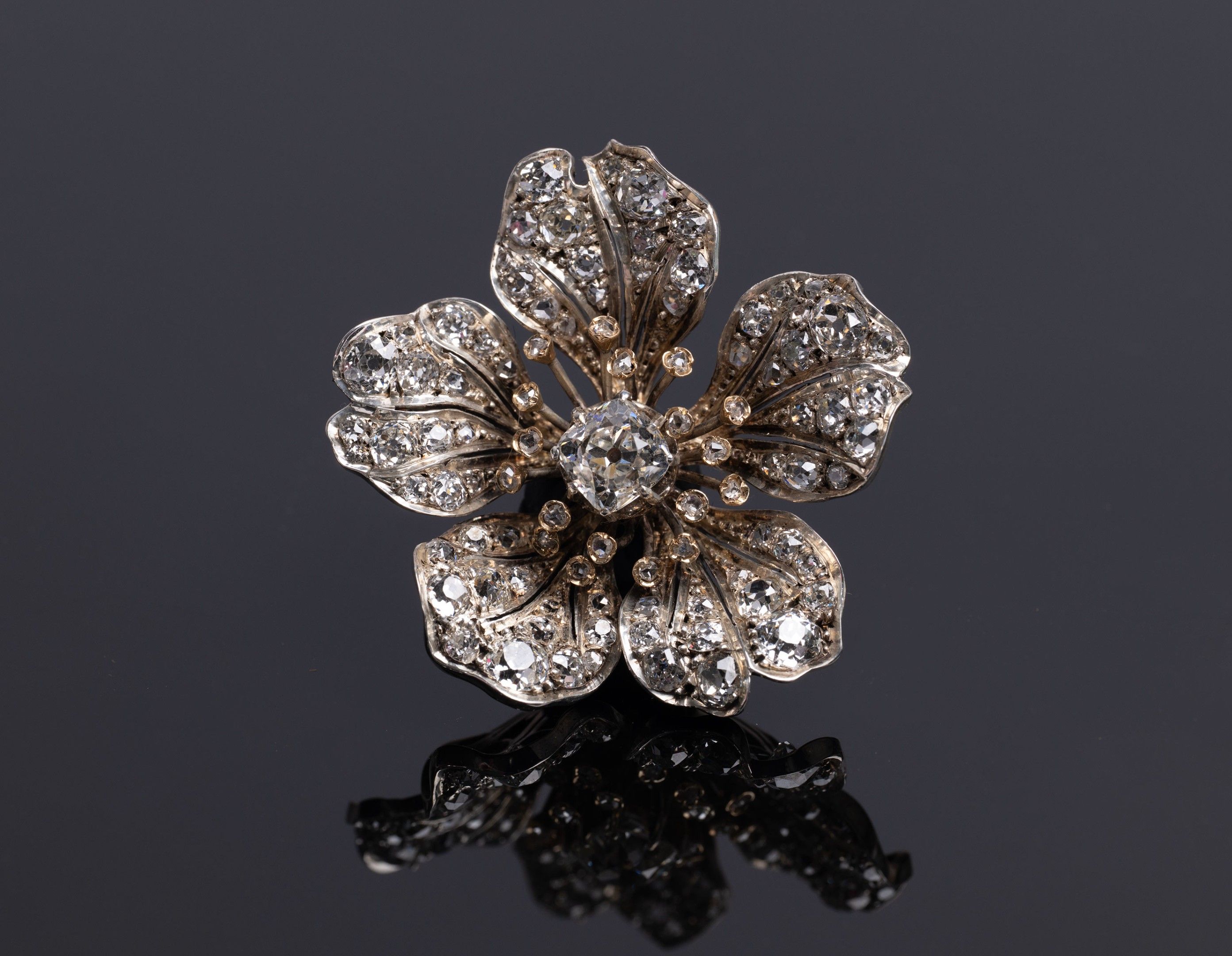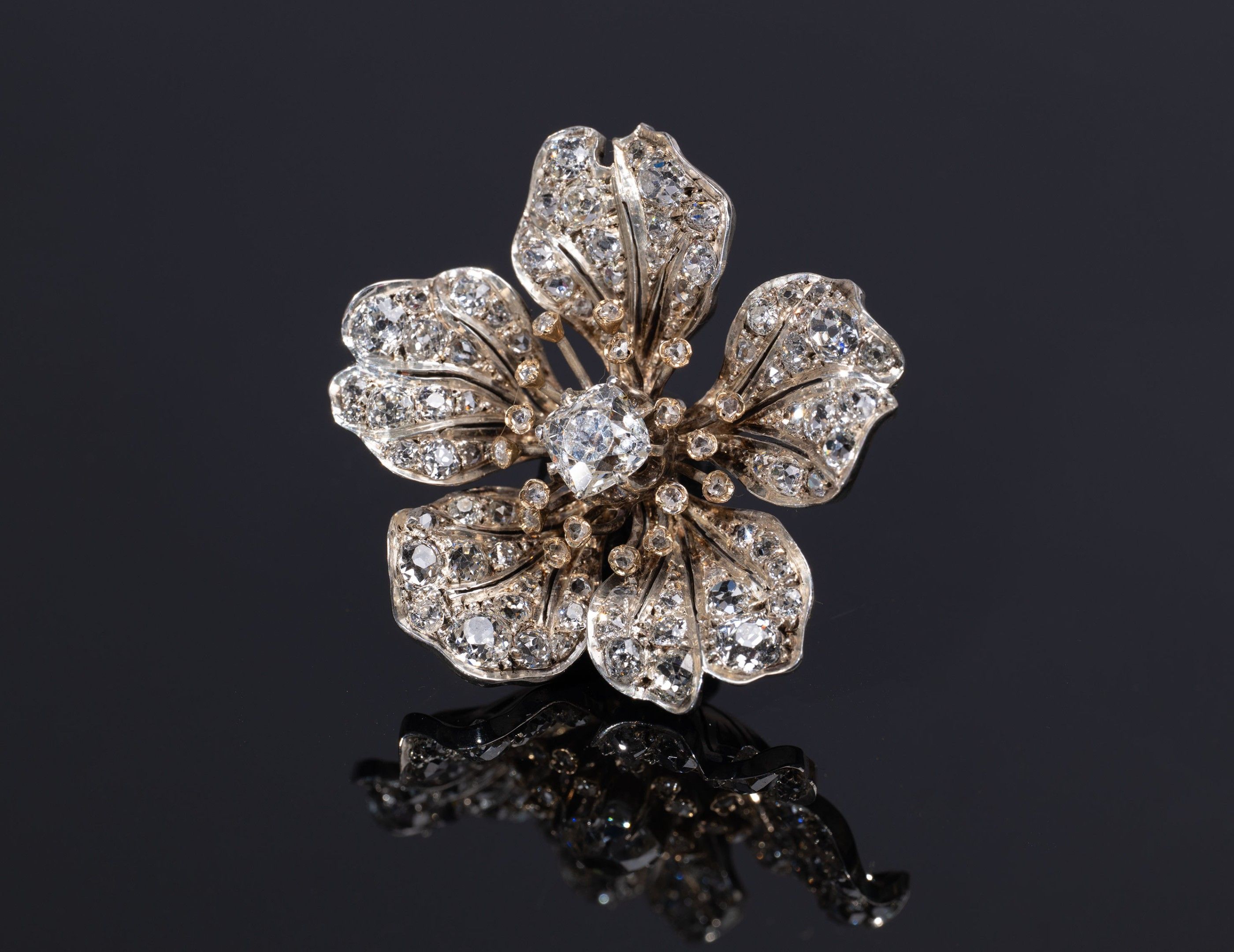 Flower-shaped brooch in 18-carat pink gold set with an old-cut and cushion-cut diamond weighing approximately 1 carat and small diamonds, gross weight: 16.4 g.