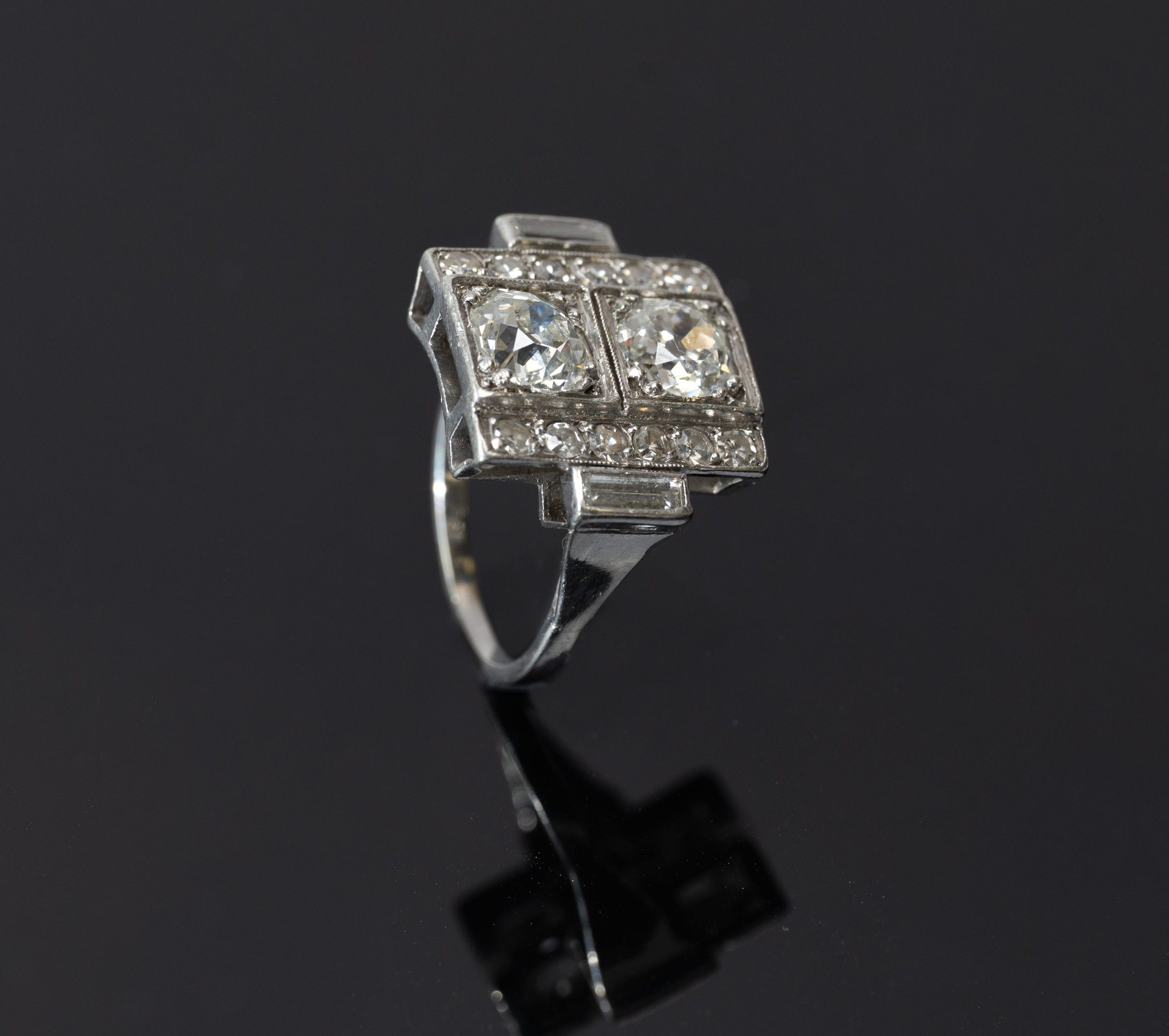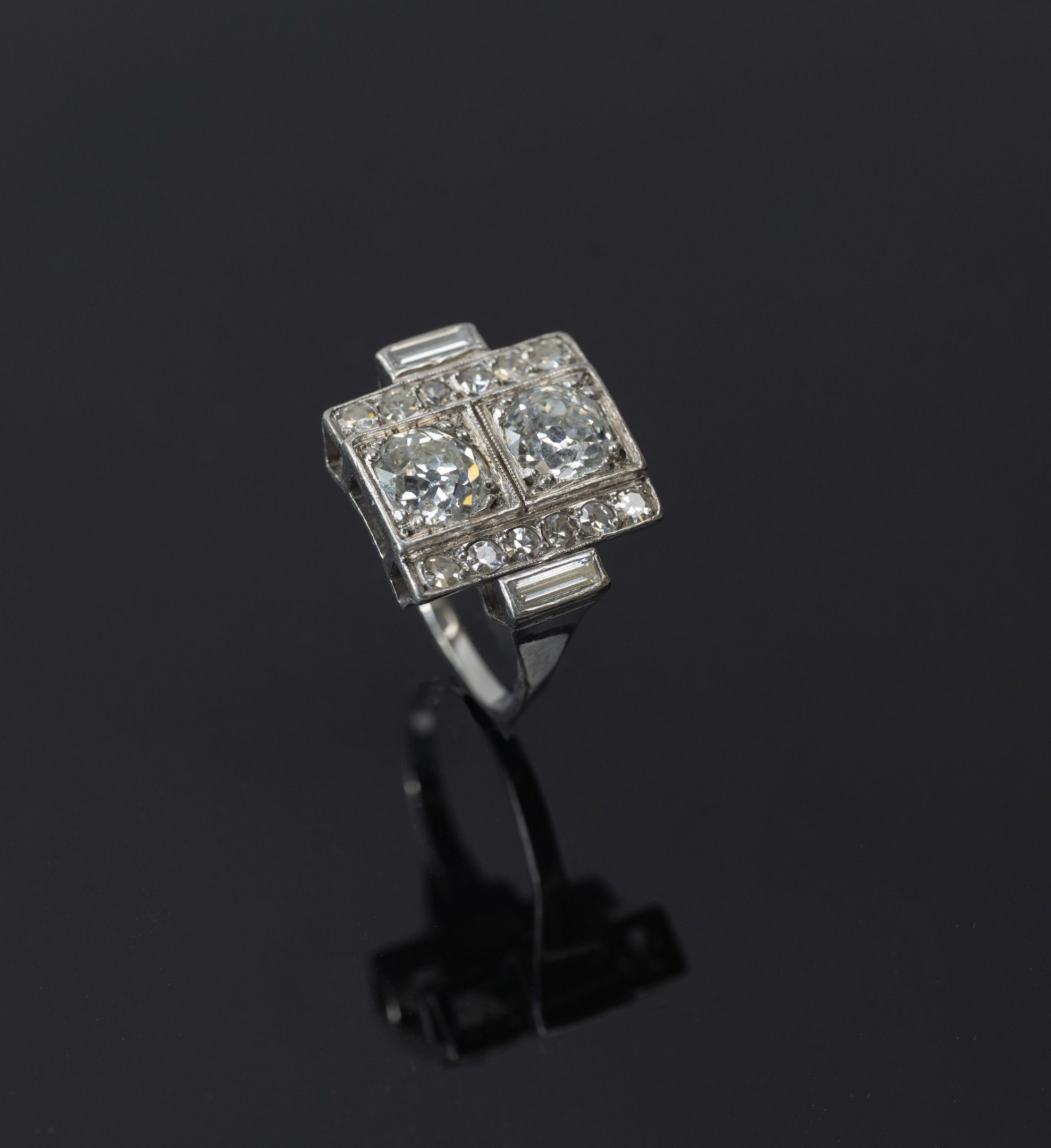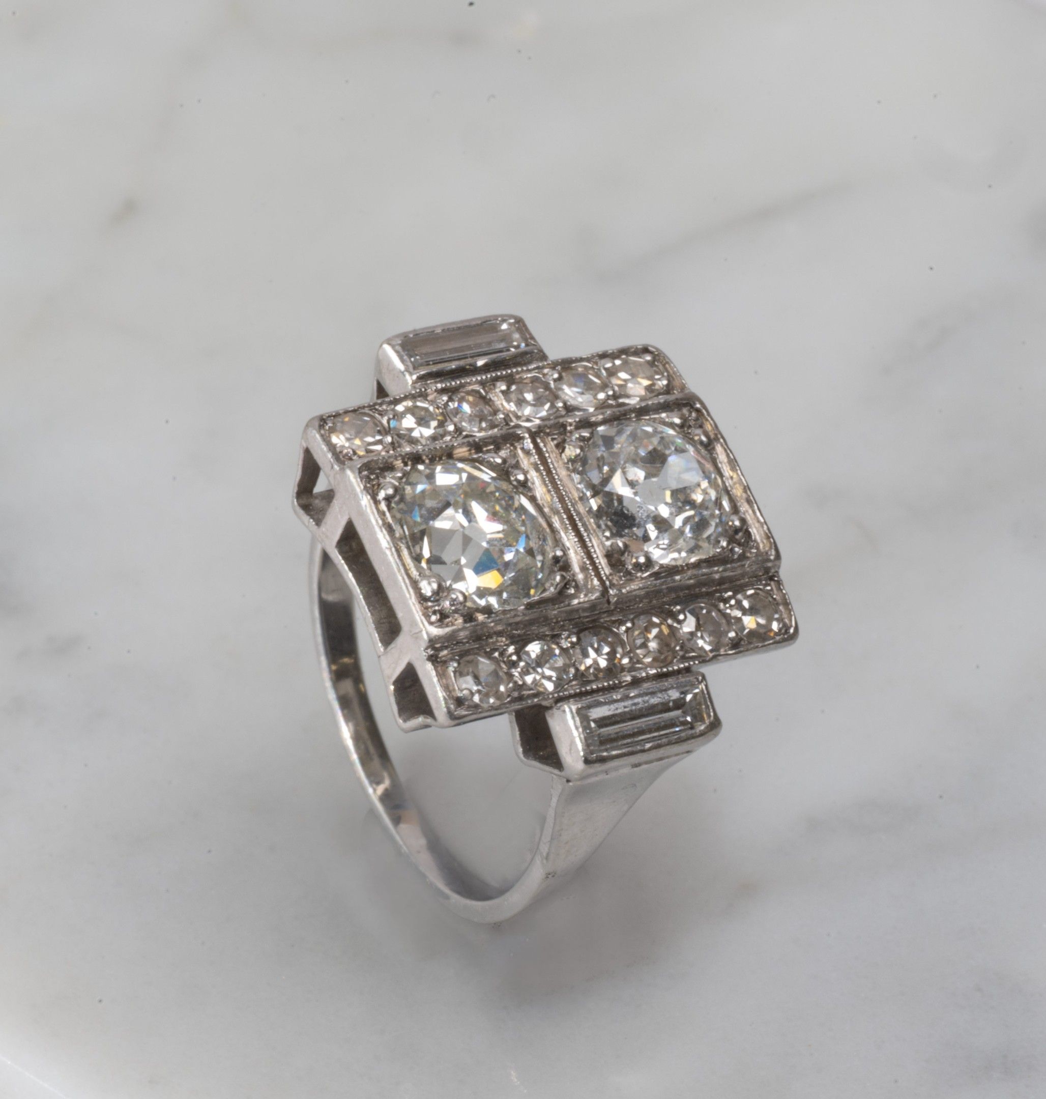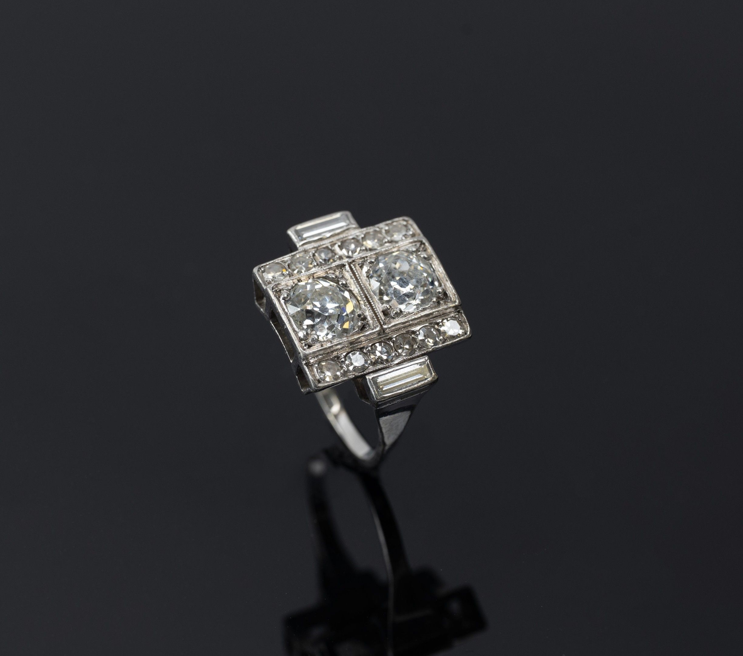 toi et moi ring in 850/1000th platinum set with two old-cut diamonds, flanked on either side by a pavement of diamonds and baguette-cut diamonds, Art Deco work, gross weight: 7.5 g, Finger size: 52