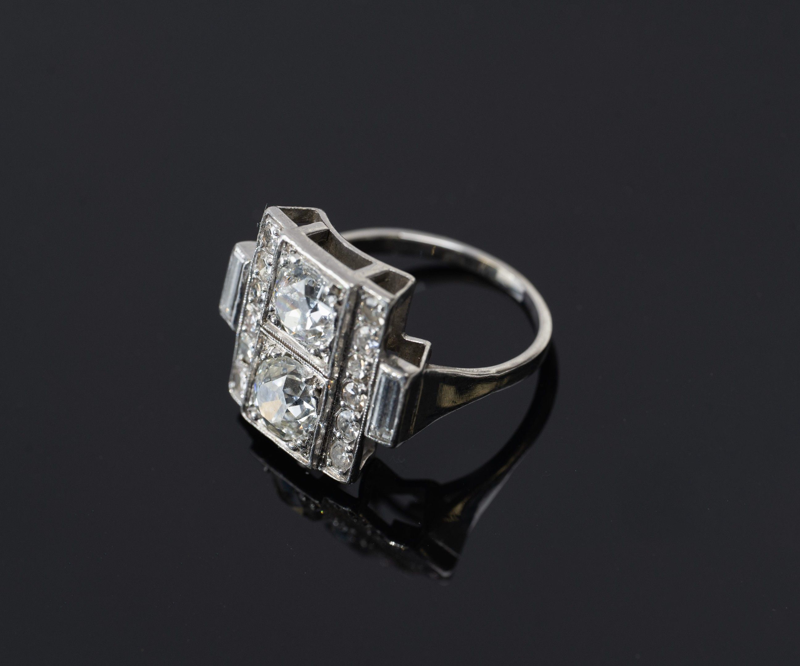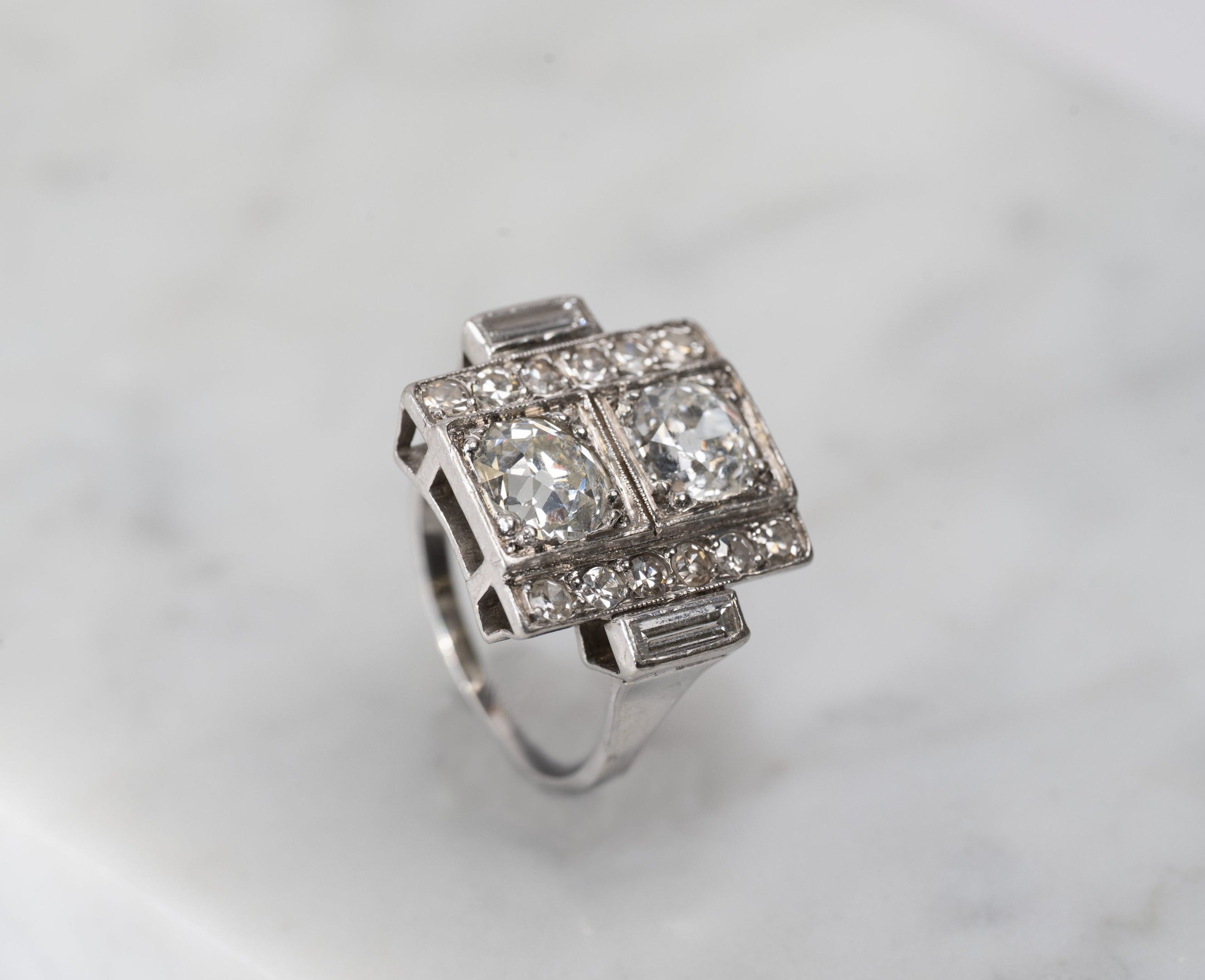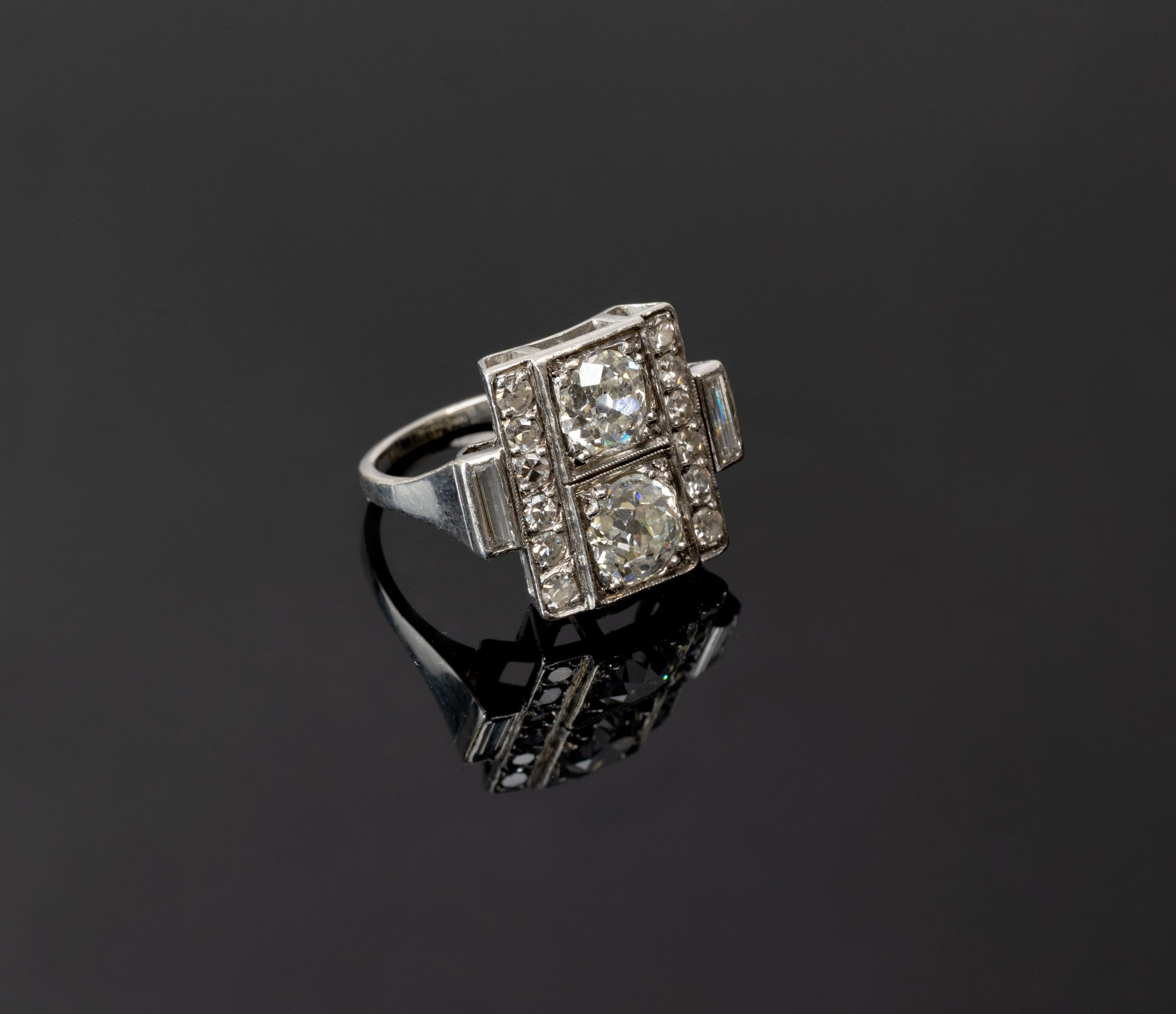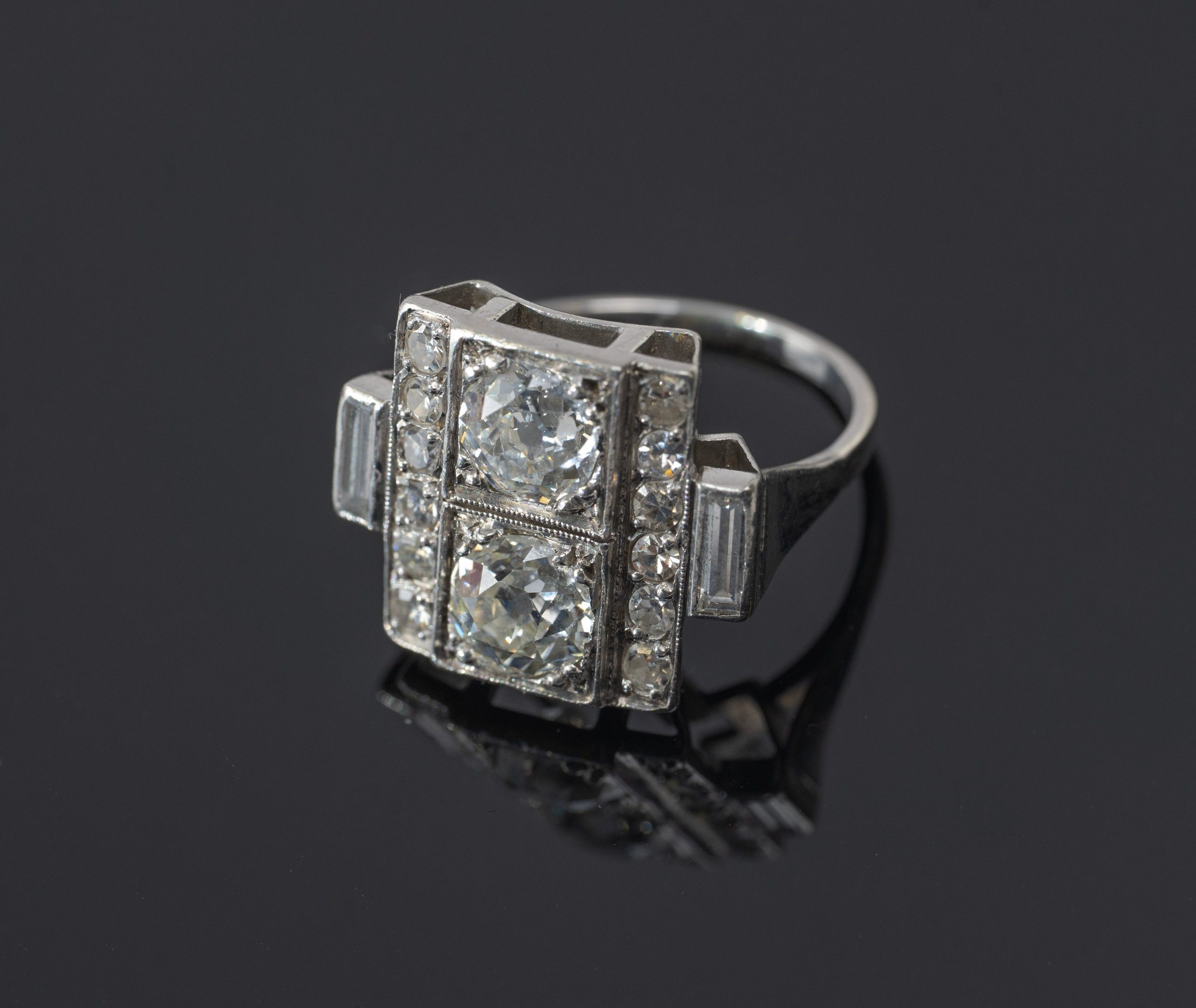 toi et moi ring in 850/1000th platinum set with two old-cut diamonds, flanked on either side by a pavement of diamonds and baguette-cut diamonds, Art Deco work, gross weight: 7.5 g, Finger size: 52