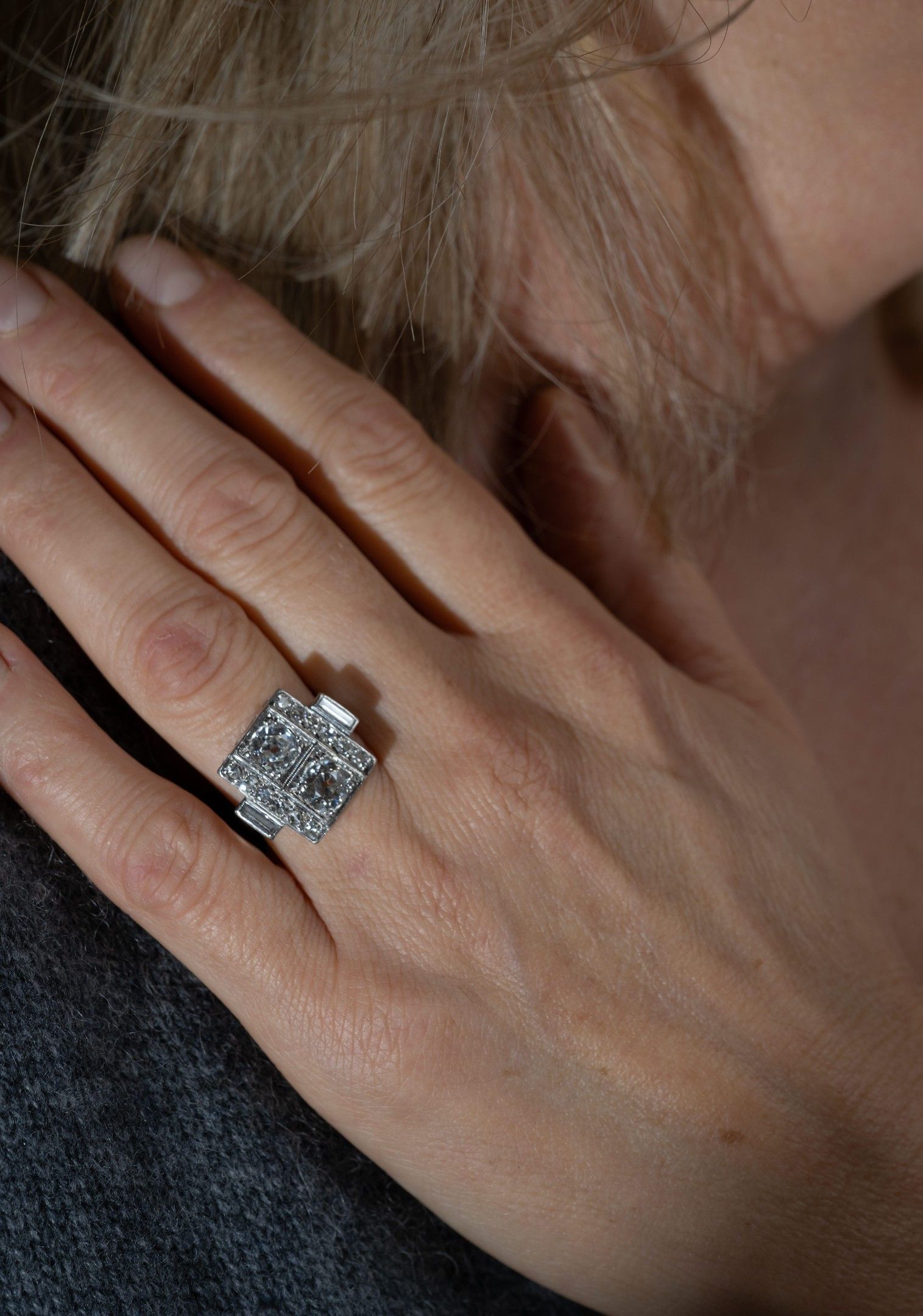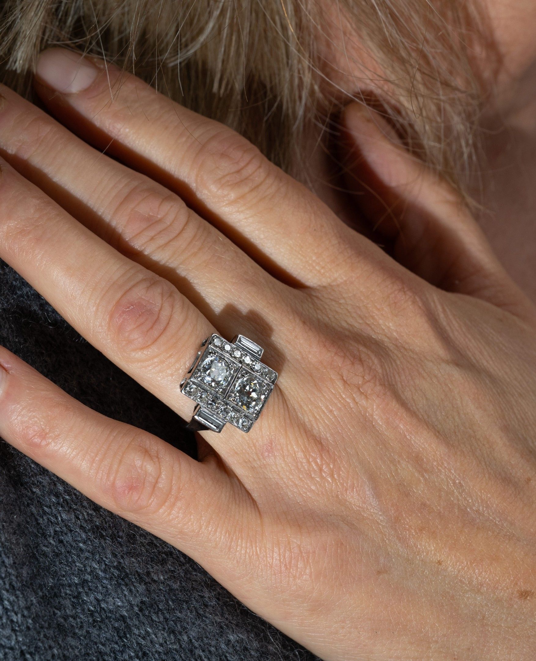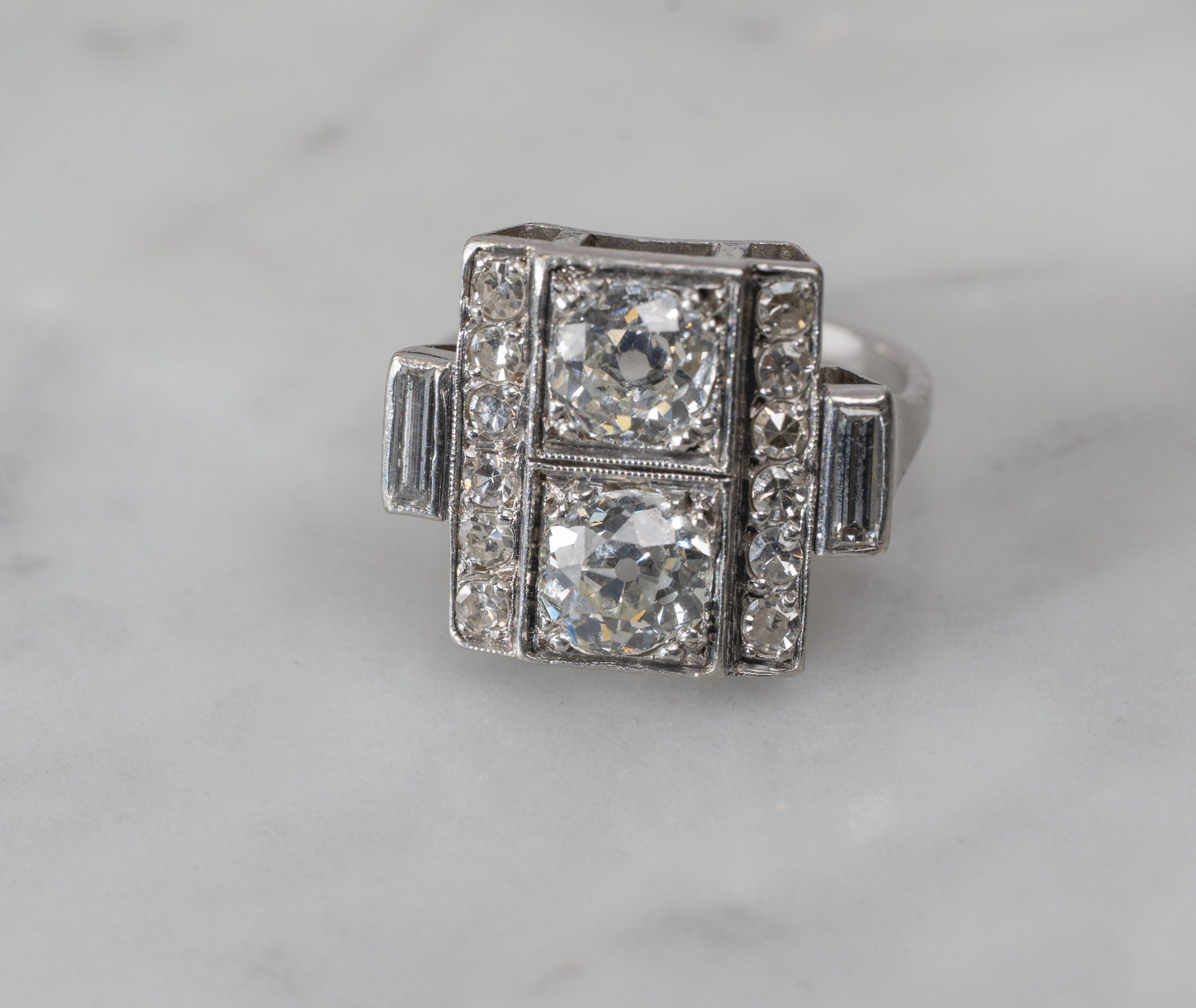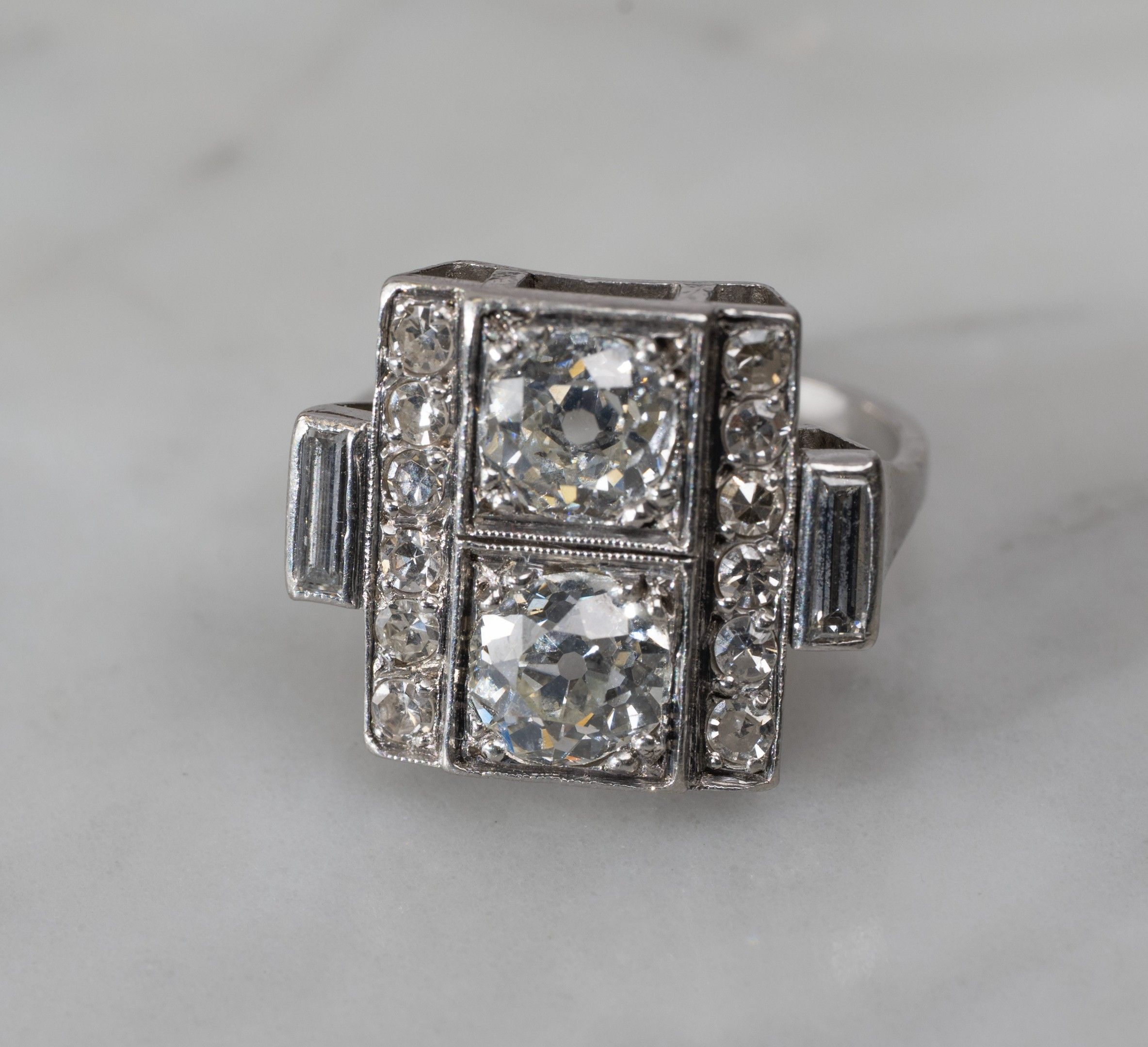 toi et moi ring in 850/1000th platinum set with two old-cut diamonds, flanked on either side by a pavement of diamonds and baguette-cut diamonds, Art Deco work, gross weight: 7.5 g, Finger size: 52