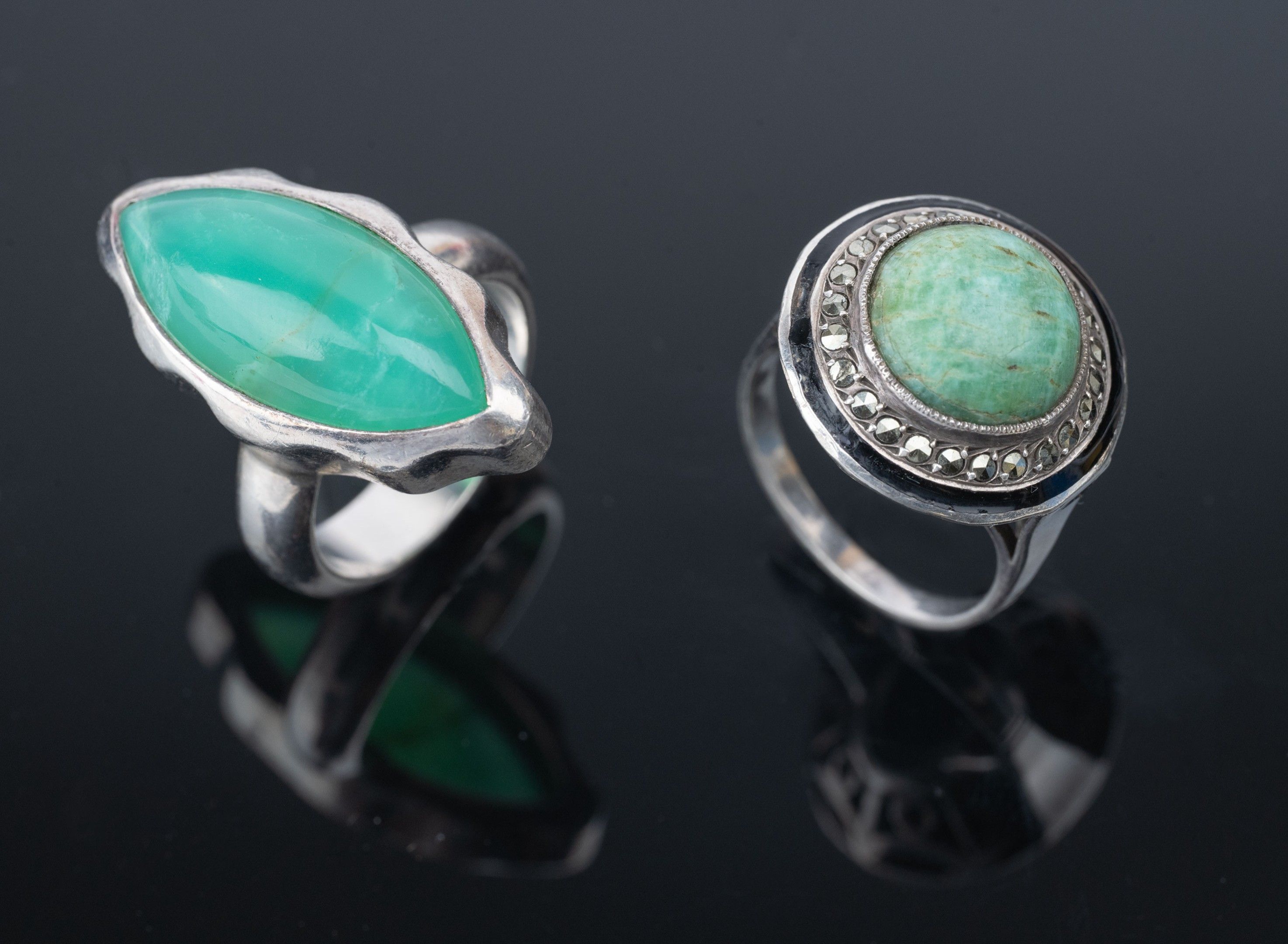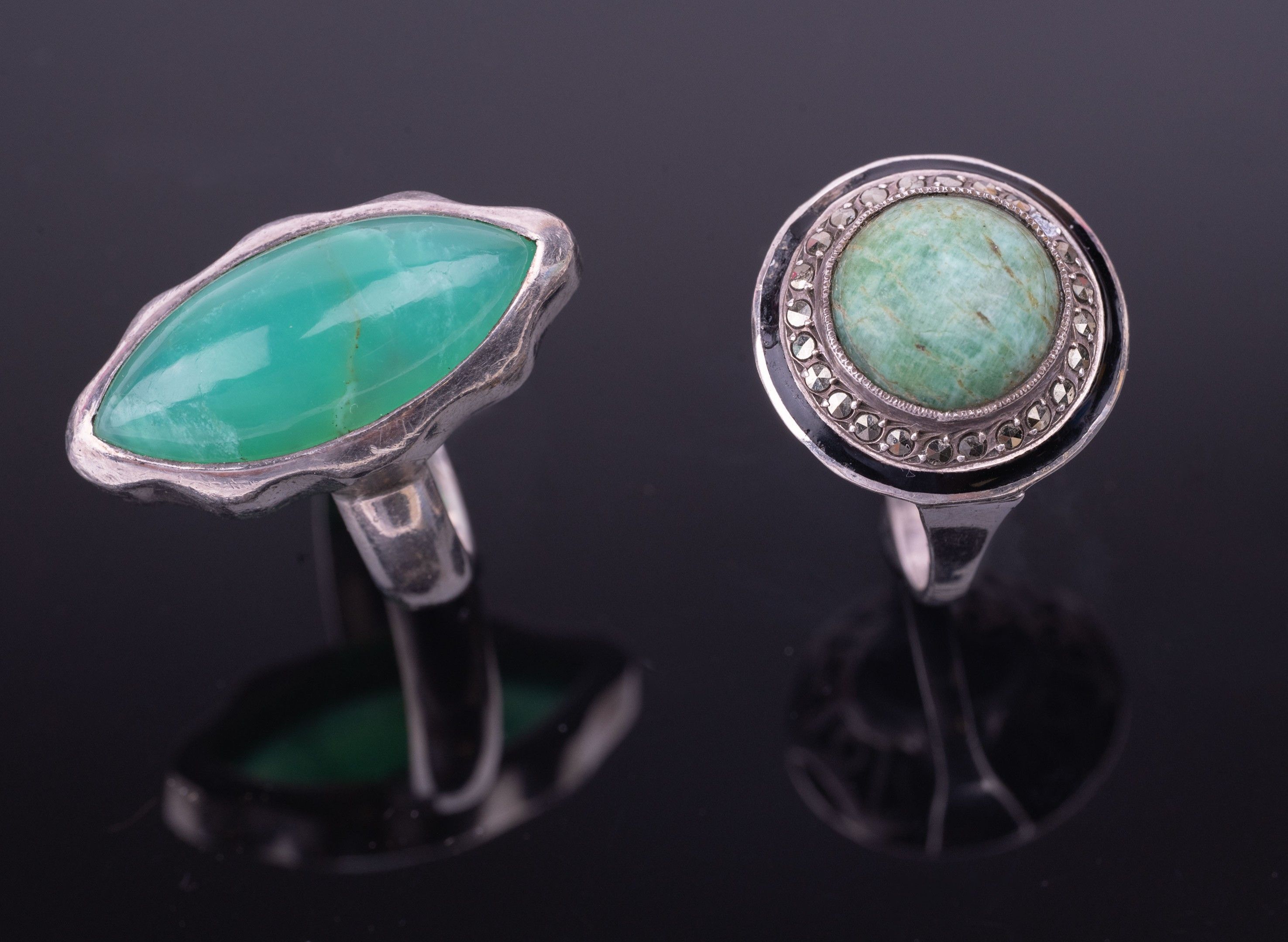 Set of two 925/1000 sterling silver rings, one of marquise shape set with a chrisoprase and a turquoise cabochon, size 55; the other of round cabochon shape set with marcasites (one missing) and black enamel (accidents), size 53. Total gross weight: 20 g.