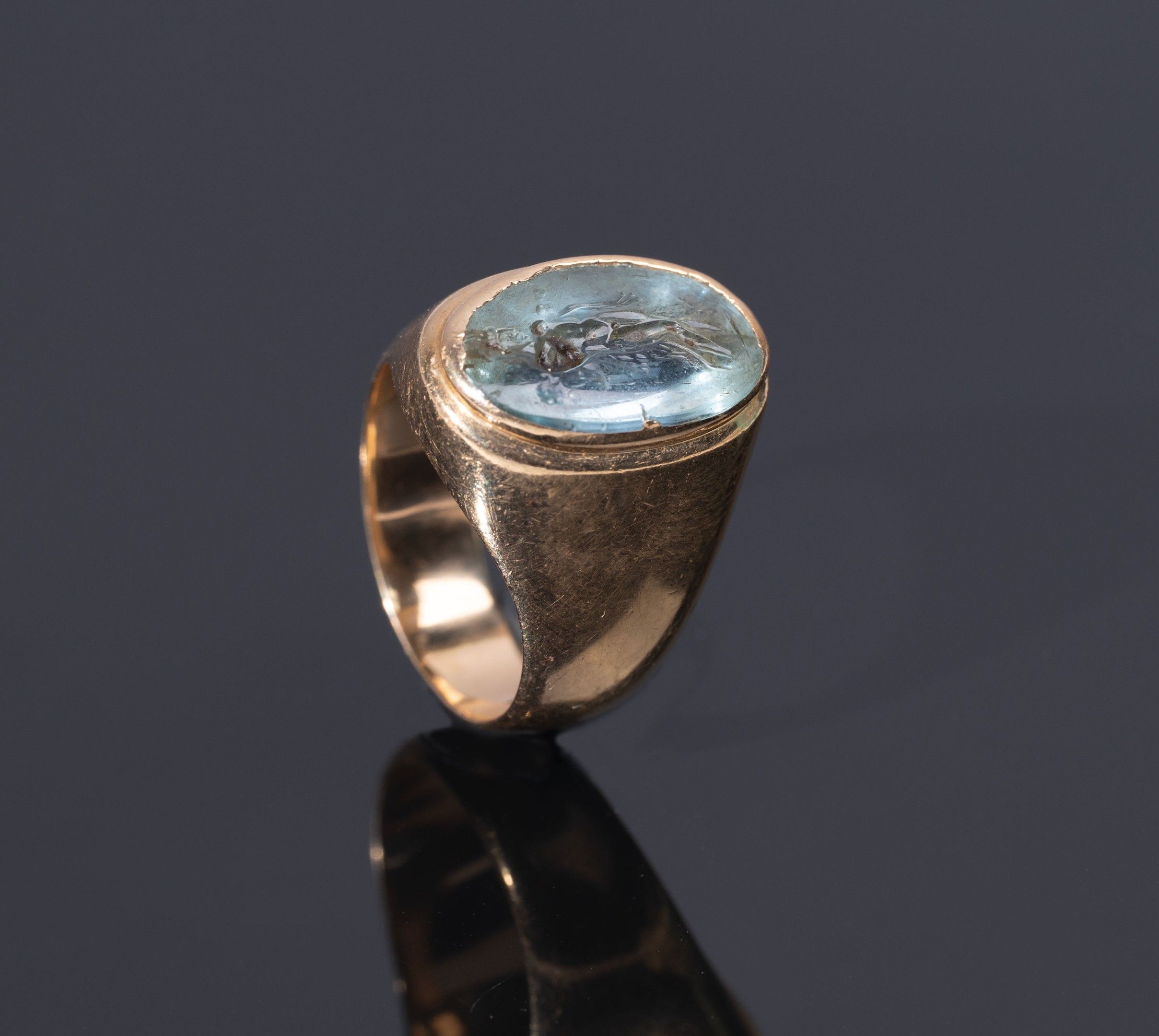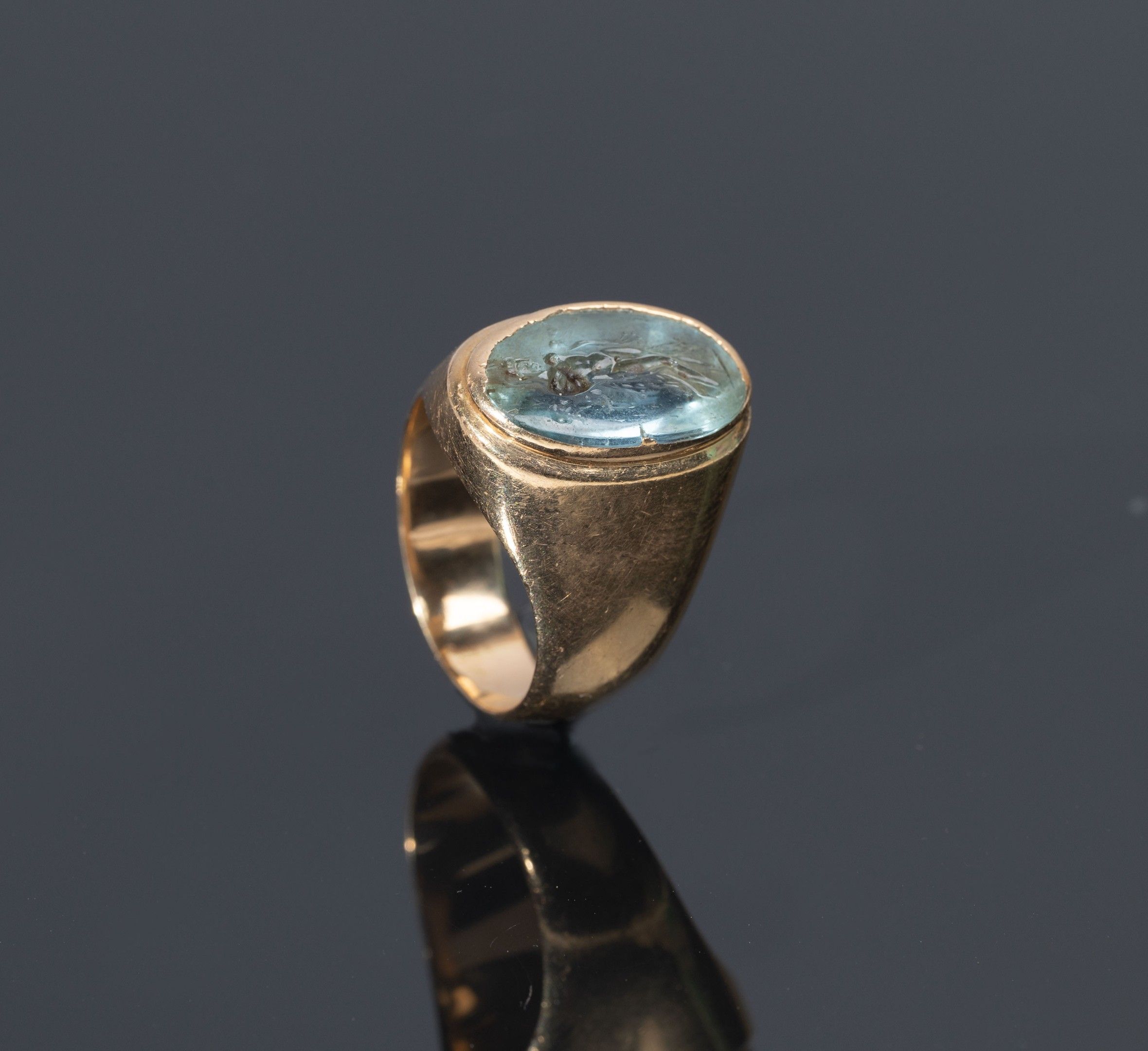 Beautiful ring in yellow gold 750/1000 (18 carats), set with an aquamarine intaglio depicting a standing male figure (ephebe from the Roman period?, wear), gross weight: 21.16g, size of finger: 56.