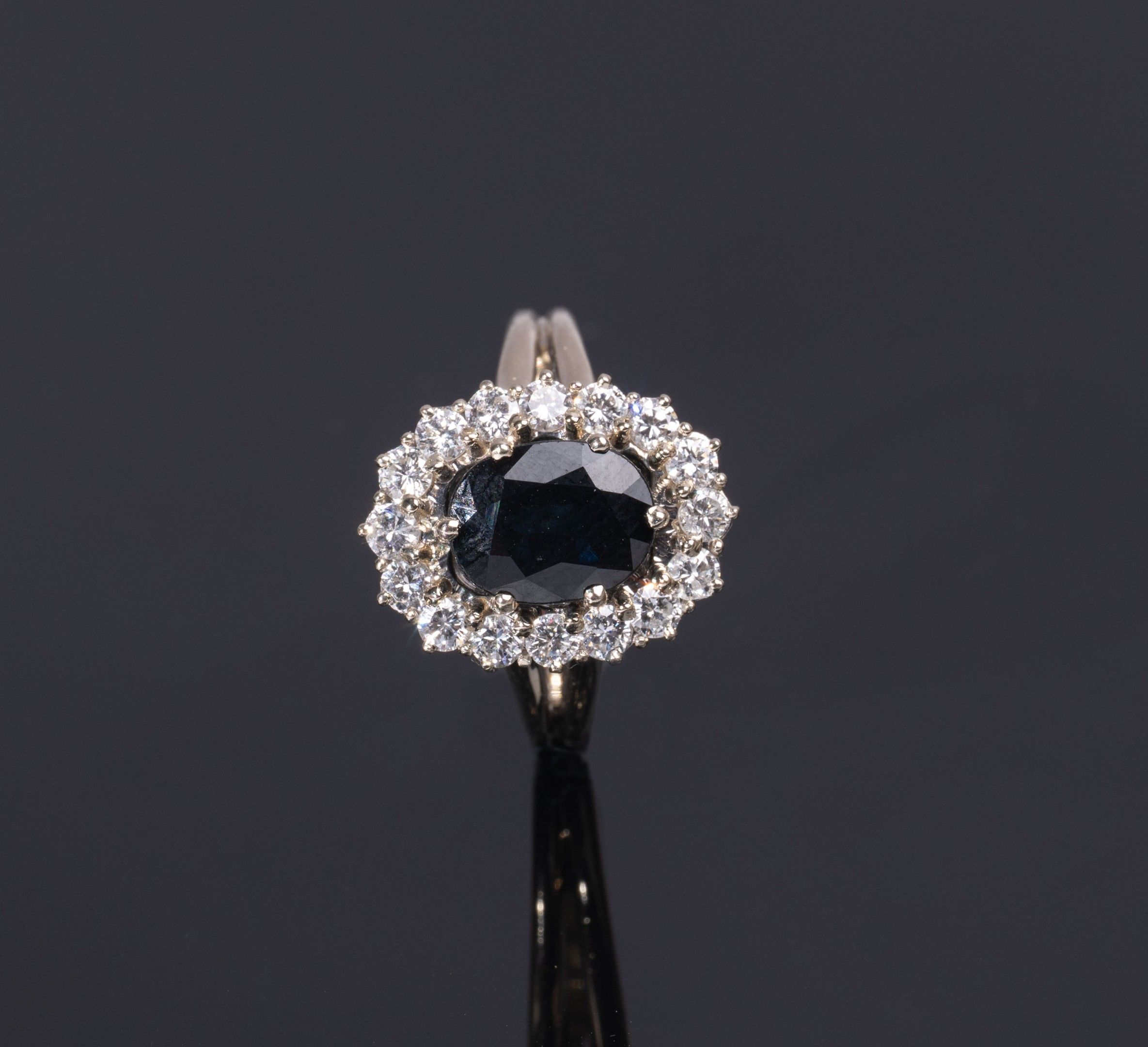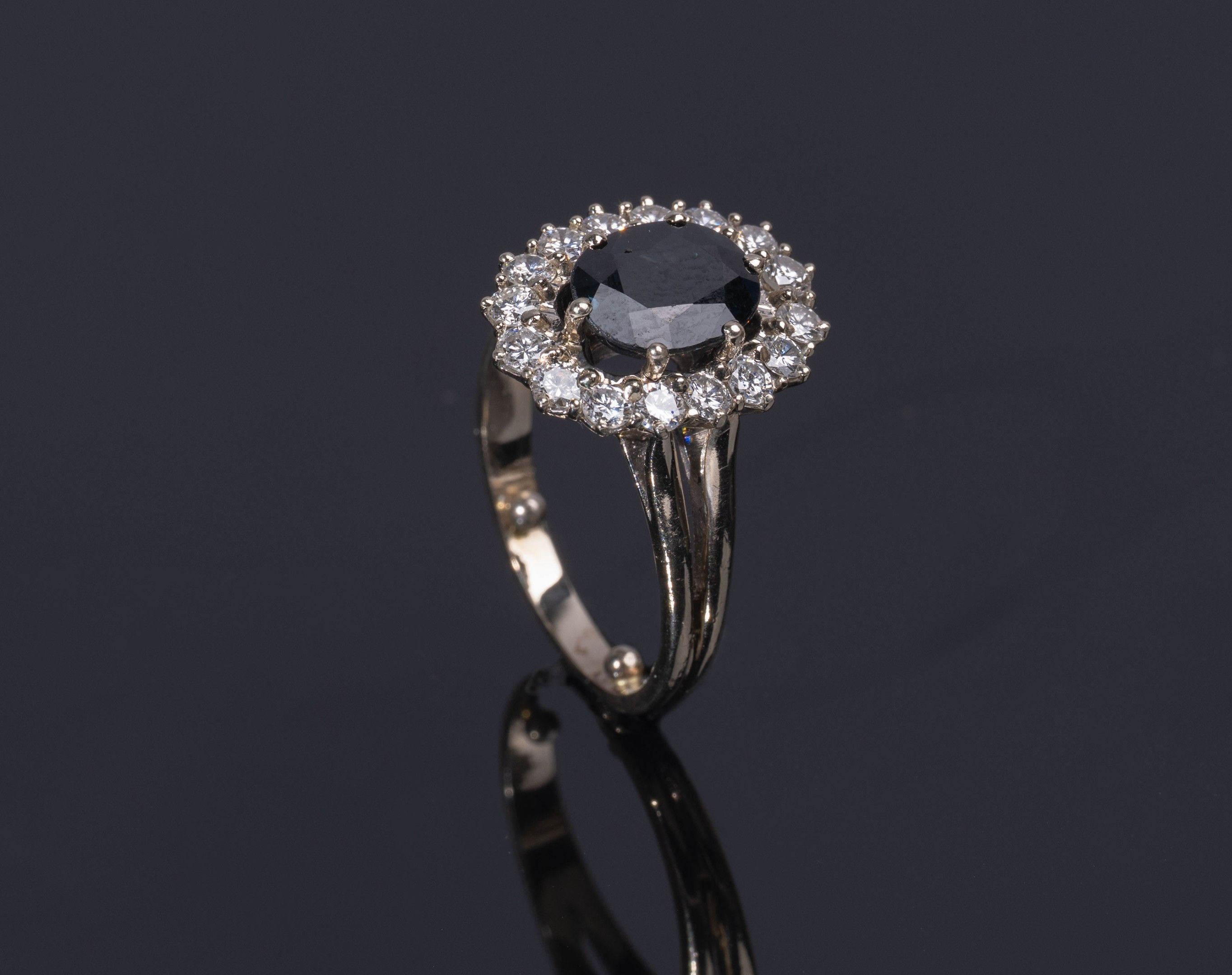 Margerite ring, set in 850/1000th platinum with a sapphire surrounded by small diamonds, gross weight: 7.28 g