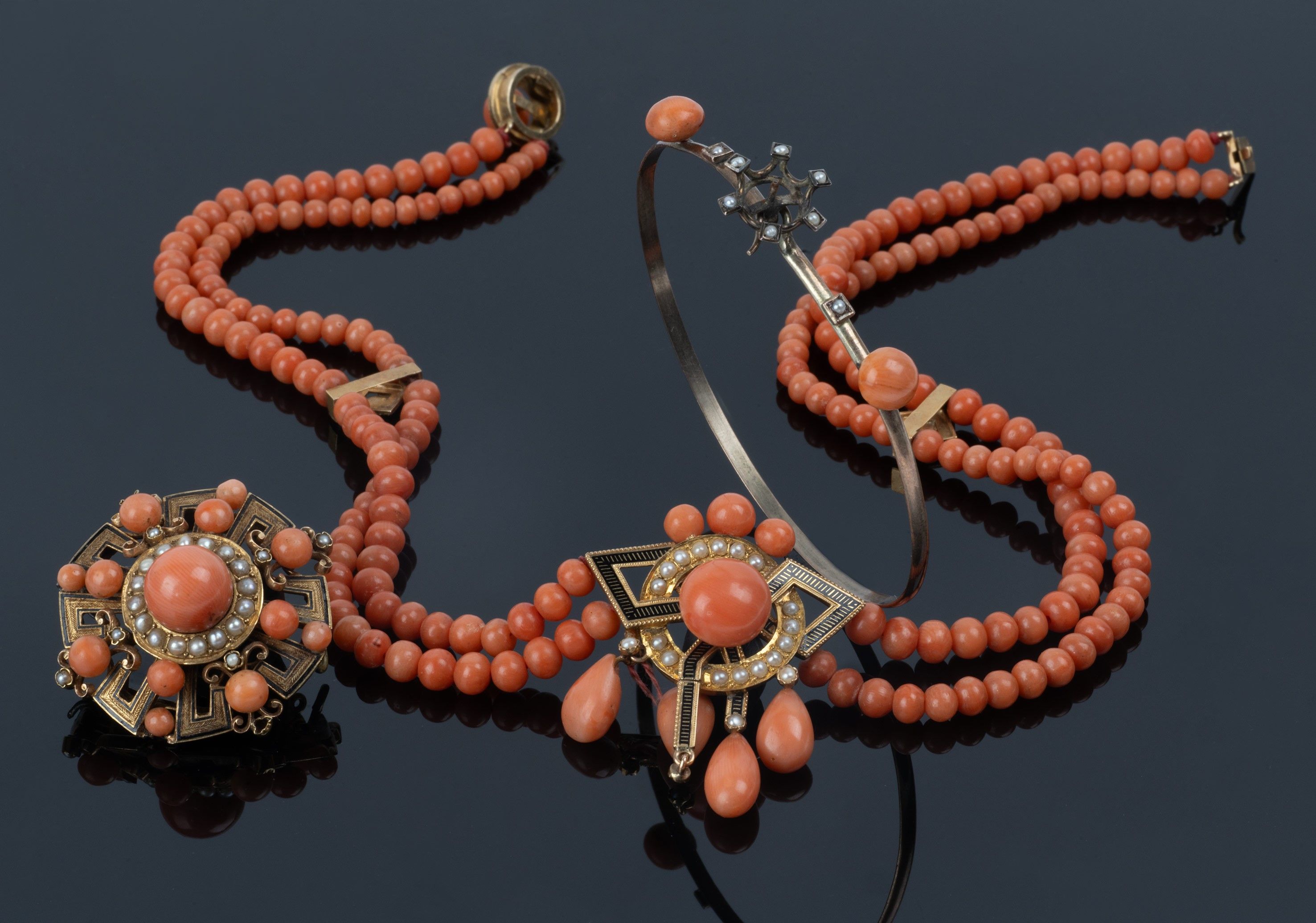 Set of coral, 18 carat (750/1000ths) yellow gold, pearls and…