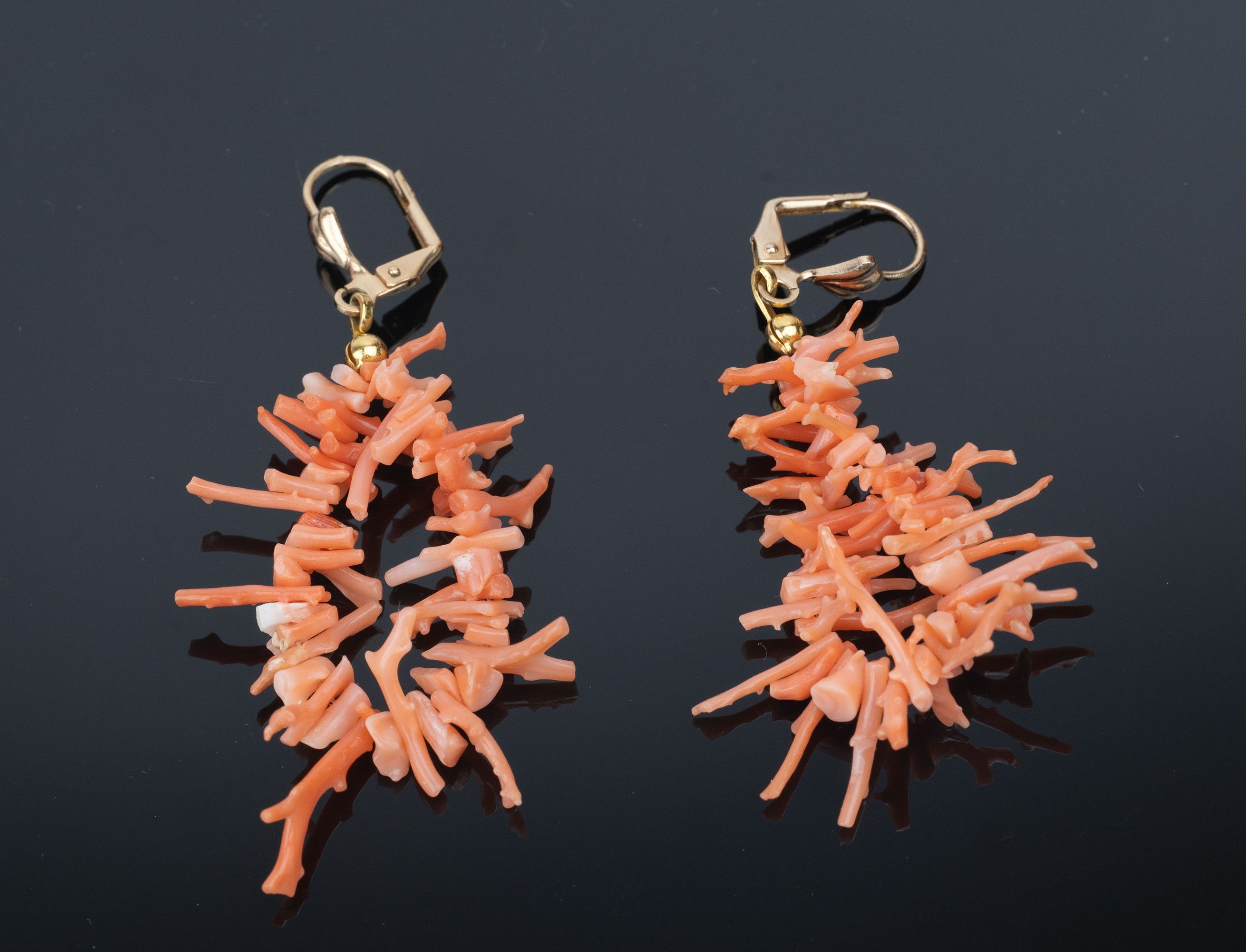 Pair of sleeper earrings in gilt metal with coral decoration, L: 7 cm