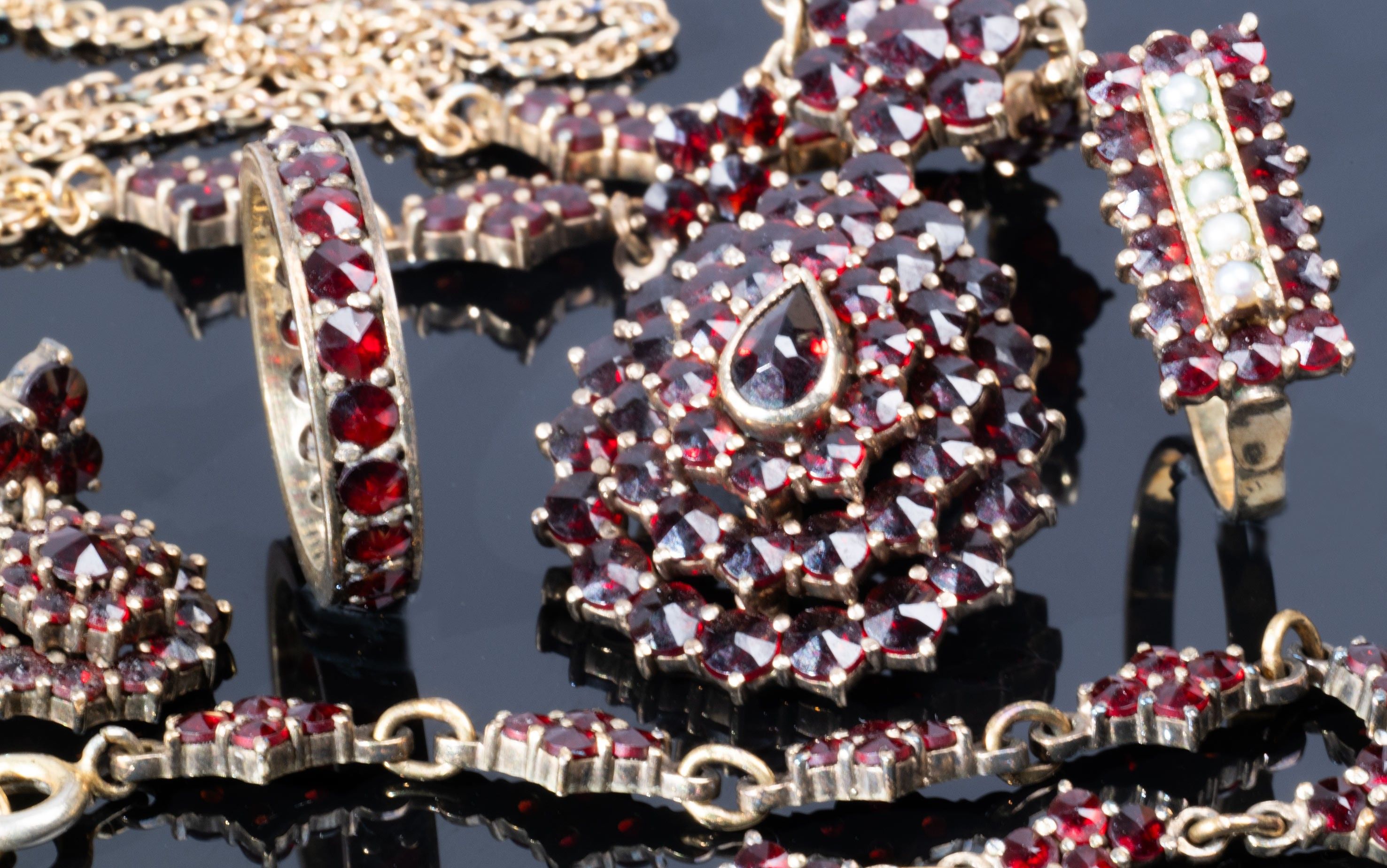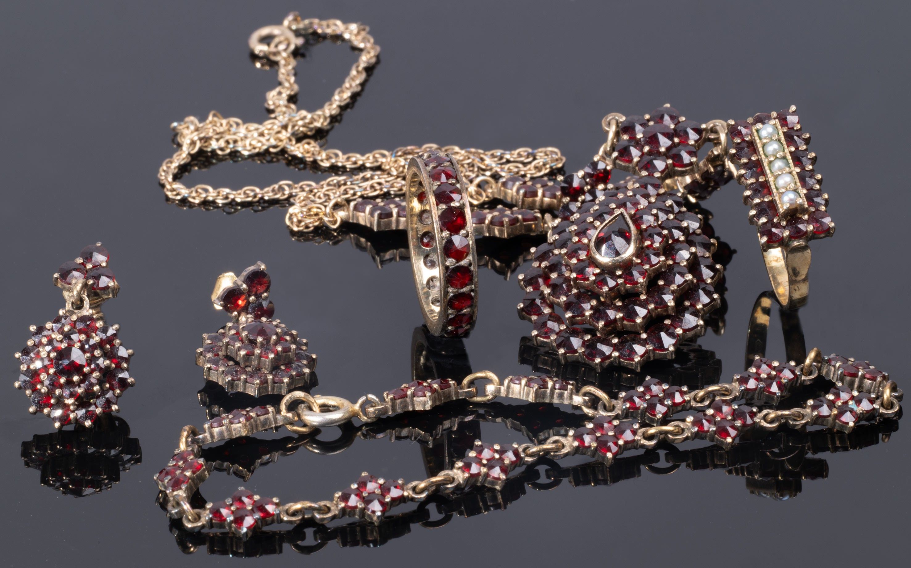 Set in vermeil set with garnets comprising: 2 earrings, a br…