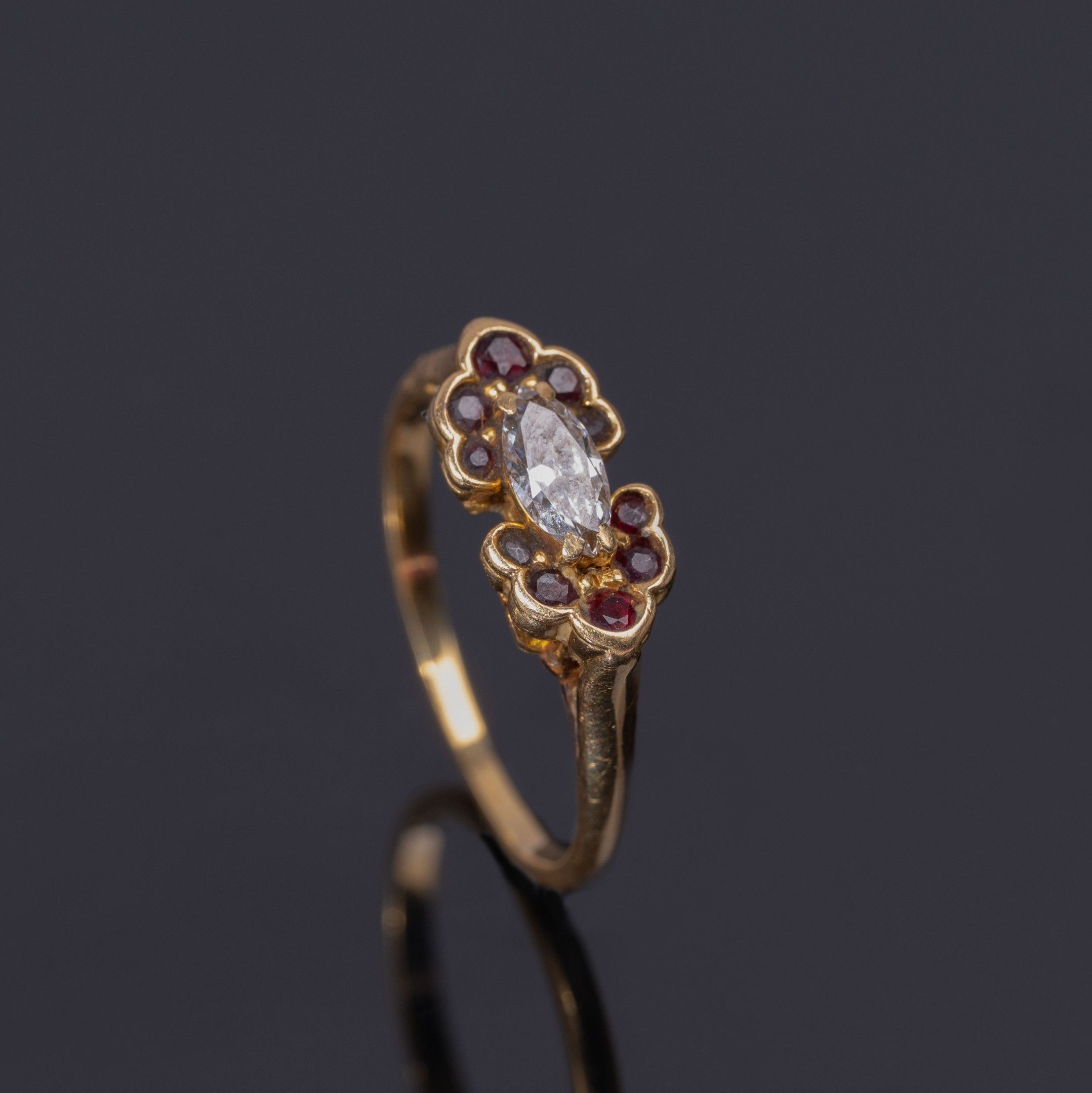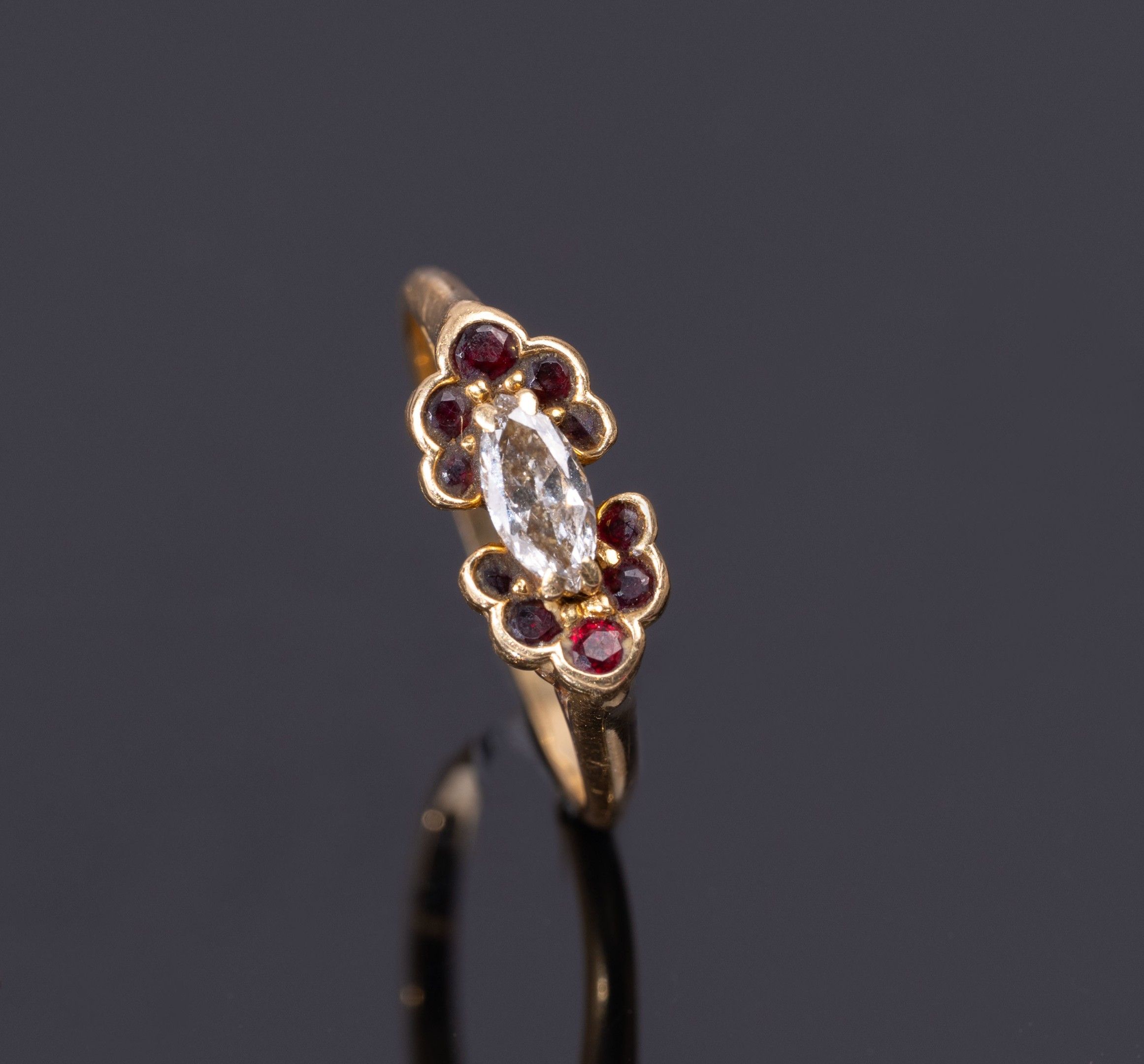 PIAGET, charming little ring in 750/1000th yellow gold (18 carats), set with a navette diamond surrounded by 10 garnets, gross weight: 2.64 g, finger size 52