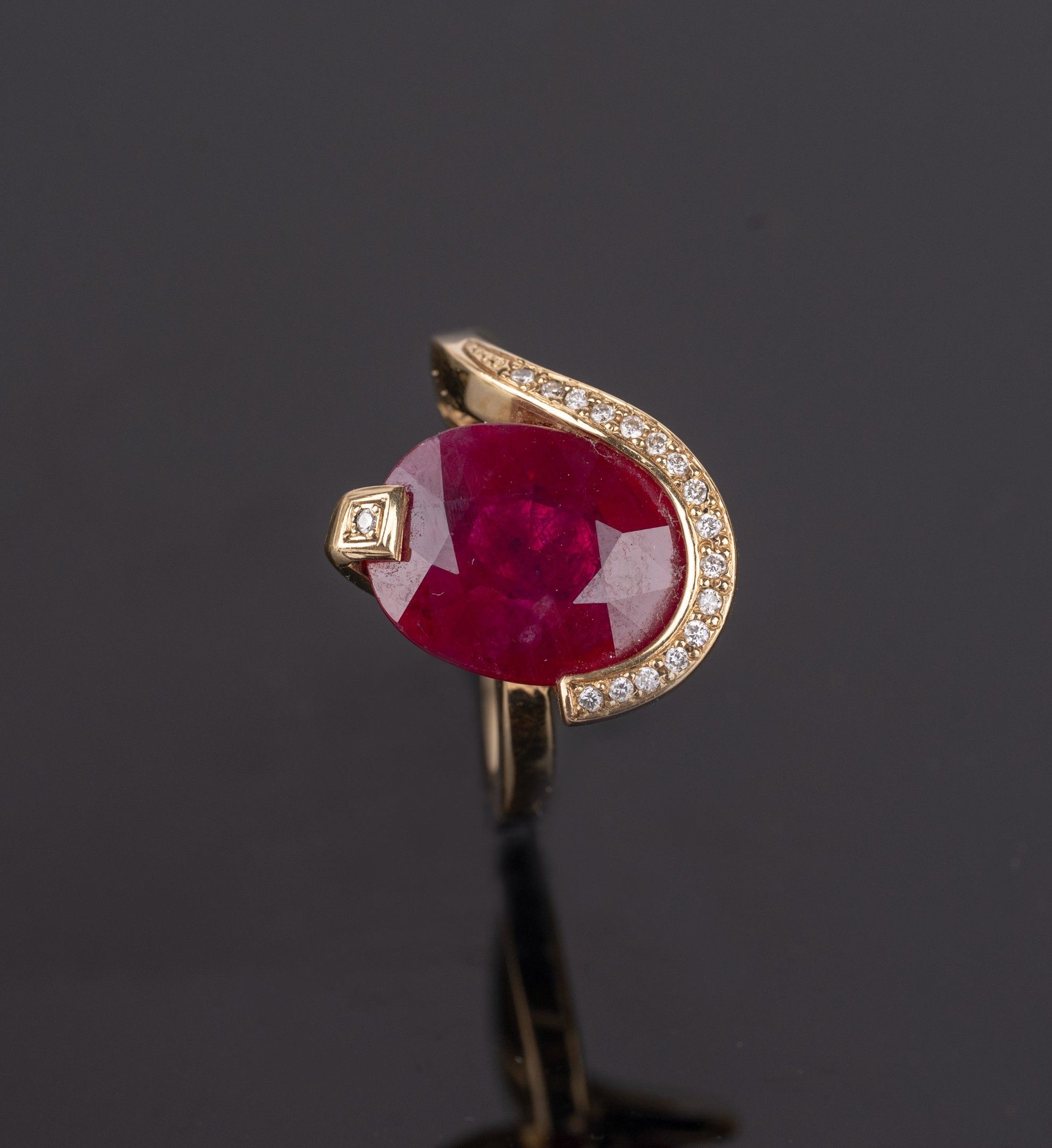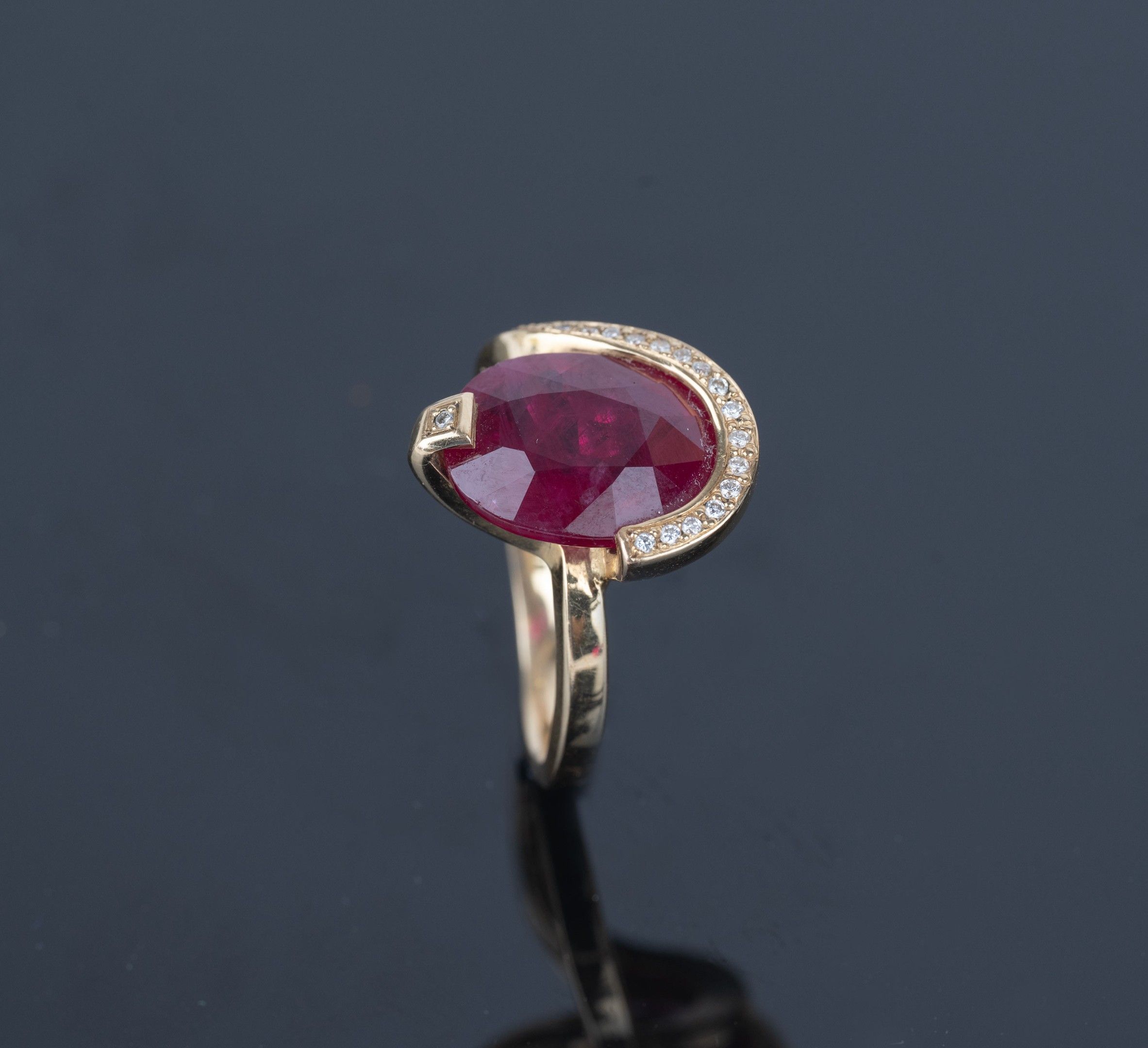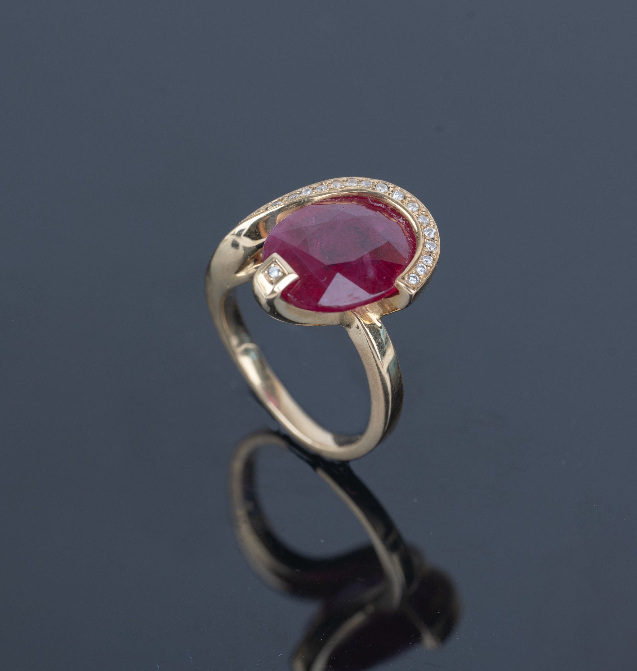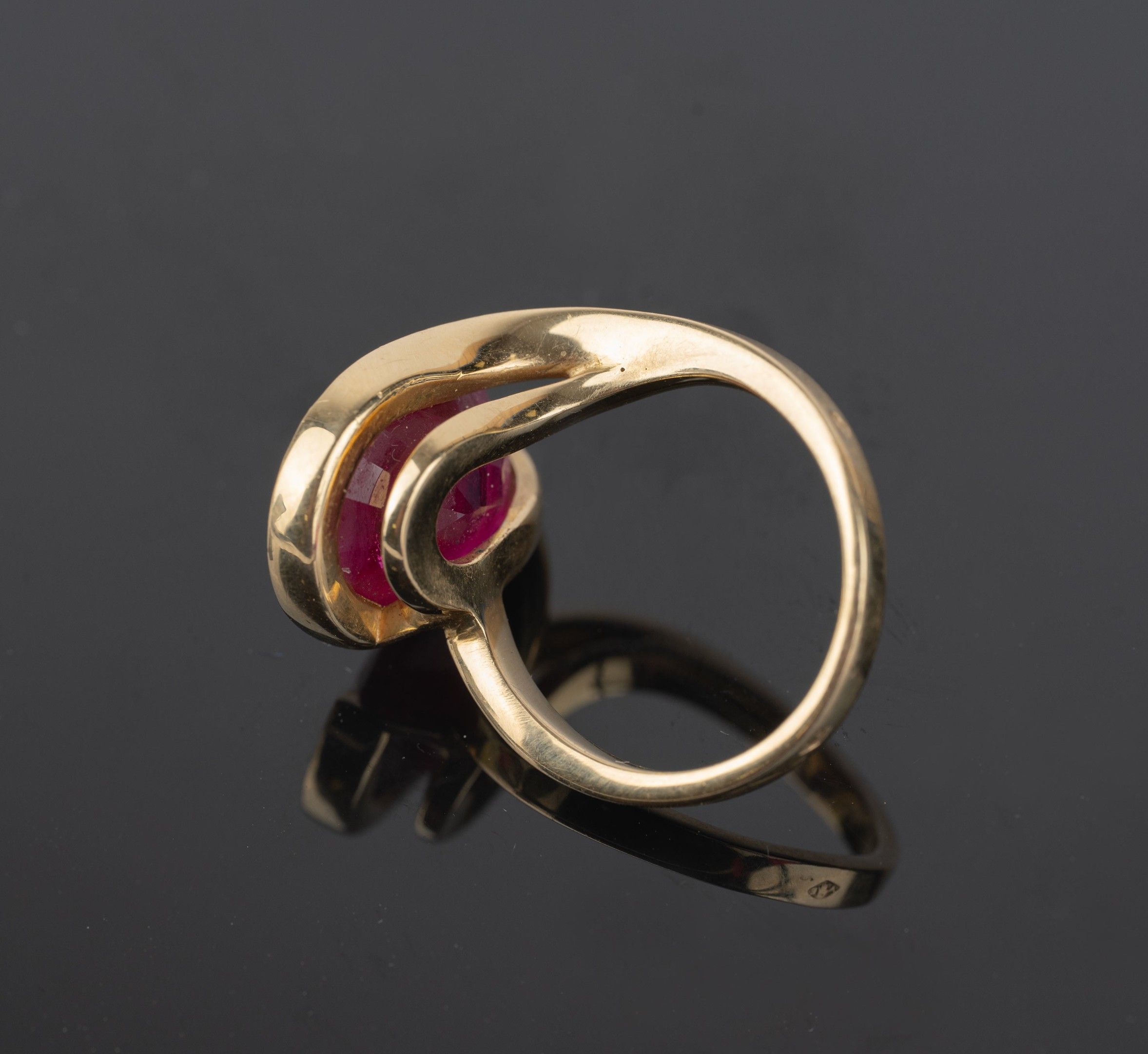 Ring in 750 thousandths (18 carats) yellow gold, the centre in a scrolling design adorned with a treated ruby and a line of round brilliant-cut diamonds.