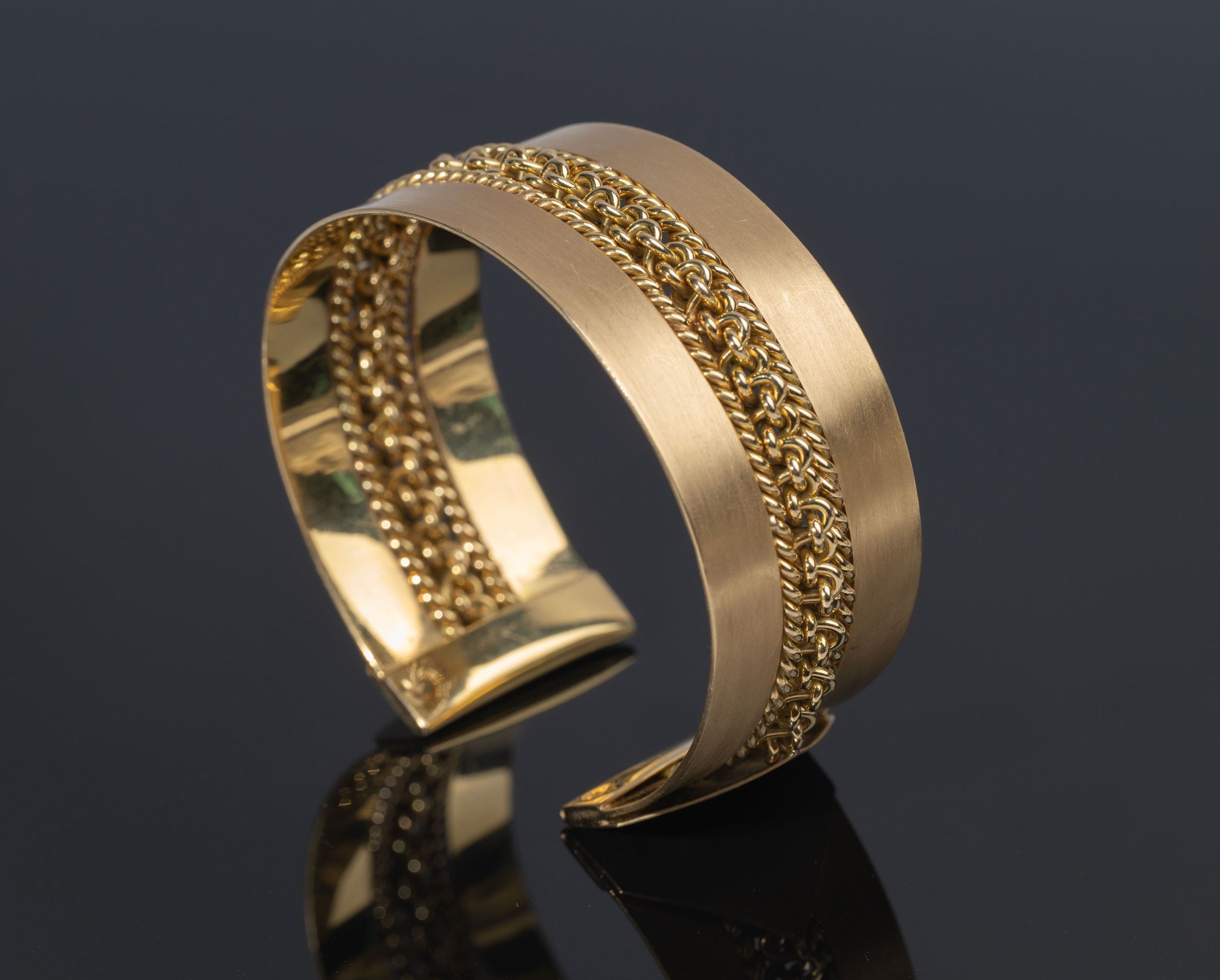 Rigid bracelet in 18 carat yellow gold (750/1000th), the middle part openworked and decorated with an imitation chain with interlaced links, weight: 63.70 g, Master Goldsmith: "OL".